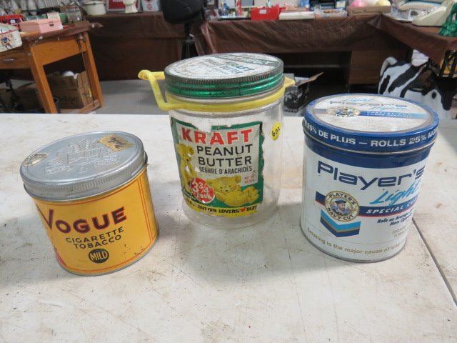 2 TOBACCO TINS (VOGUE & PLAYERS), KRAFT PEANUT BUTTER JAR (W/HANDLE)