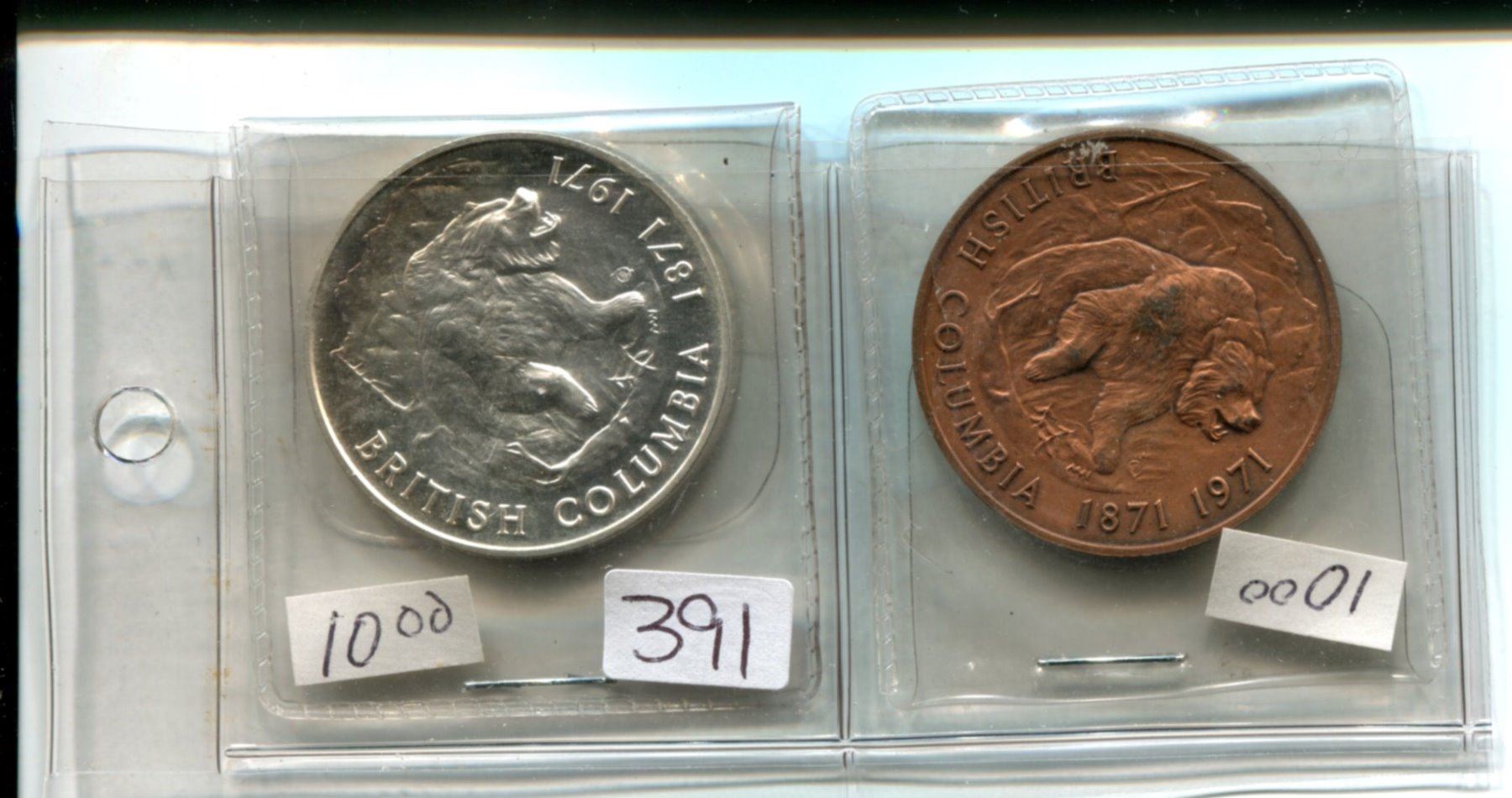 2-Tokens - Canada Commemorative British Columbia 1871-1971 (1-silver, 1-Bronze),2-Canadian tokens