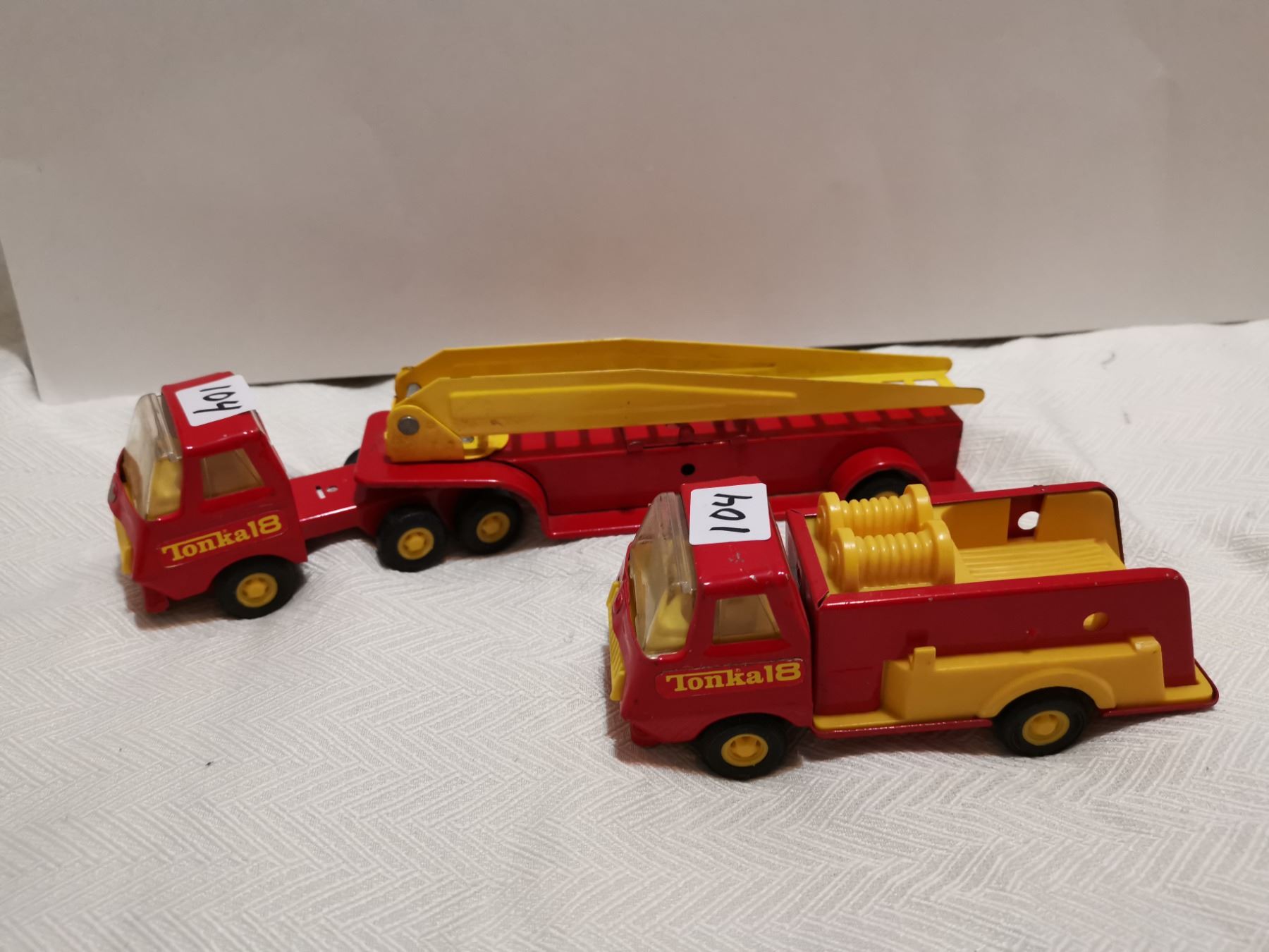 2 Tonka tin trucks, 10" fire ladder 6" Fire truck