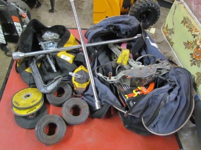 2 Tool Bags- Tie Wire,Cut off Blades,Prybar,Tire Wrench