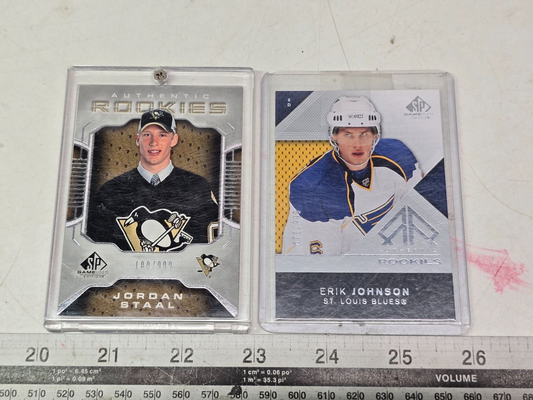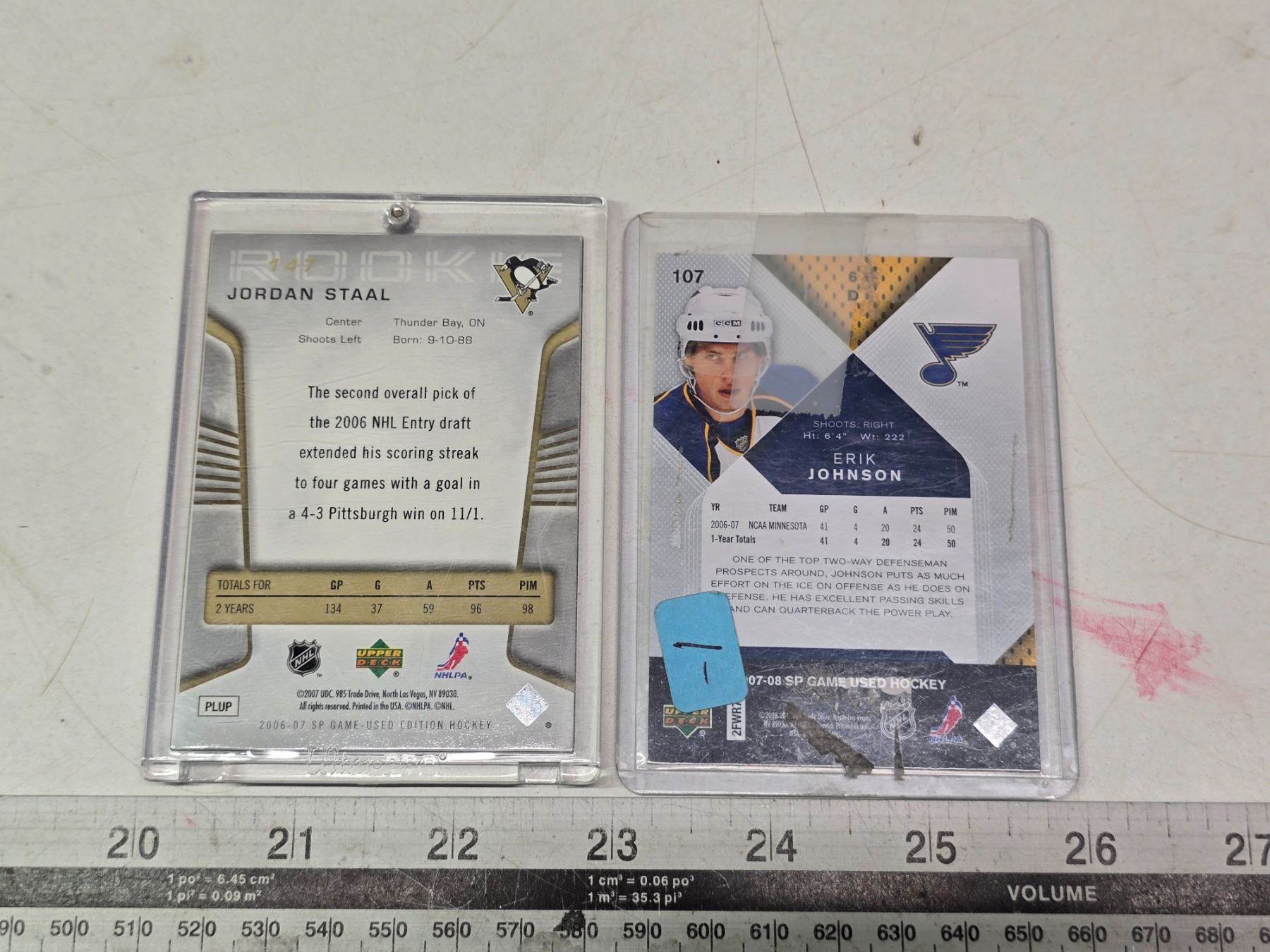 2 UD Game used #'D RC 06-07 Jordan Staal #147 100/999, 07-08 Erik Johnson #107 471/999