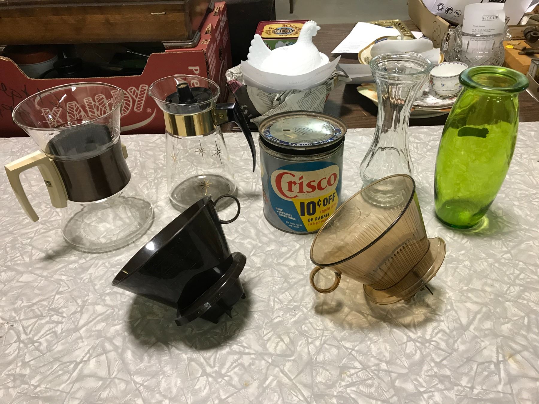 2 VASES + CRISCO TIN + 2 COFFEE PRESSES + 2 COFFEE FUNELLS