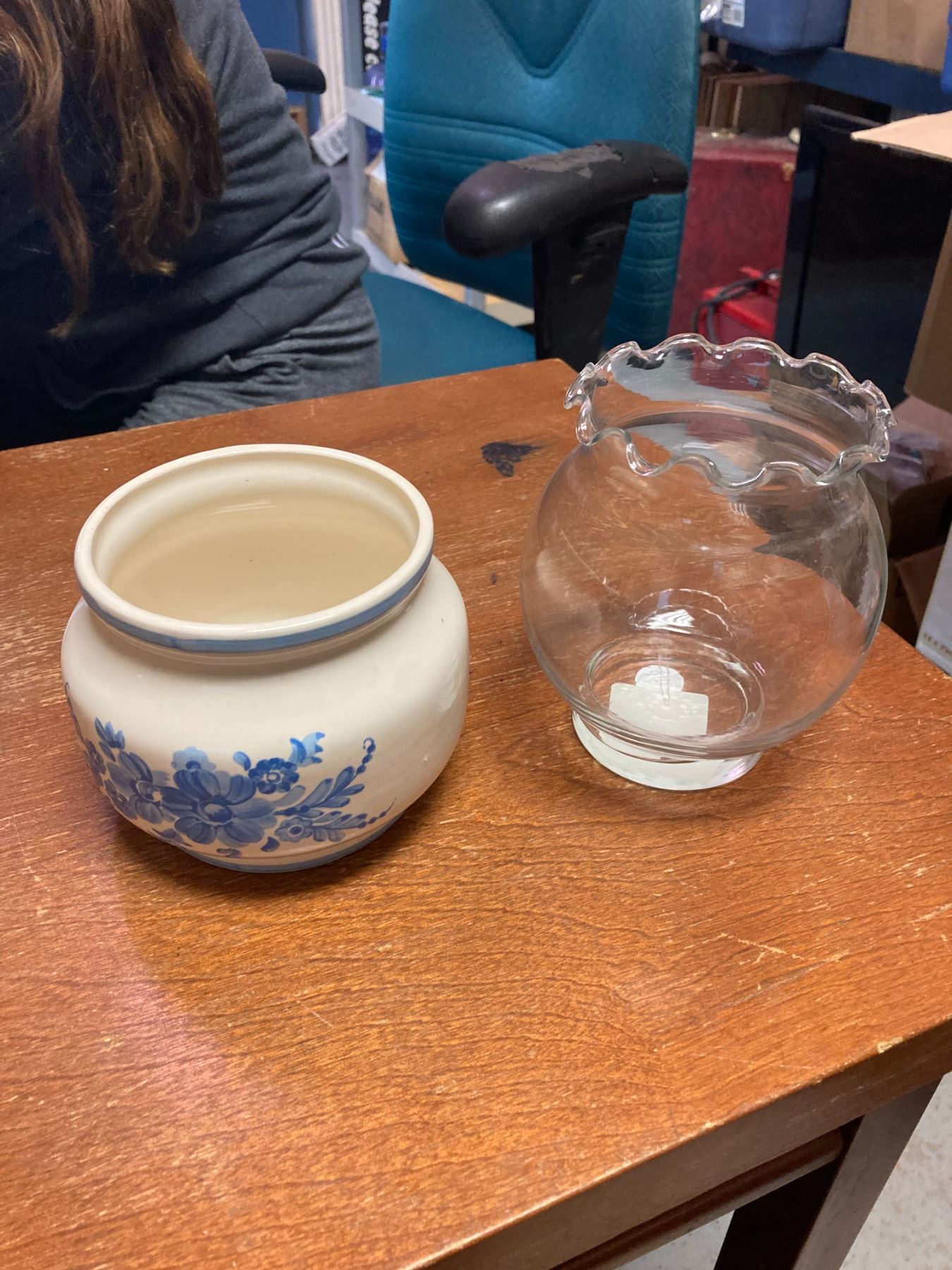 2 VASES ONE CLEAR ANCHOR HOCKING AND ONE WITH BLUE TRIM AND FLOWERS