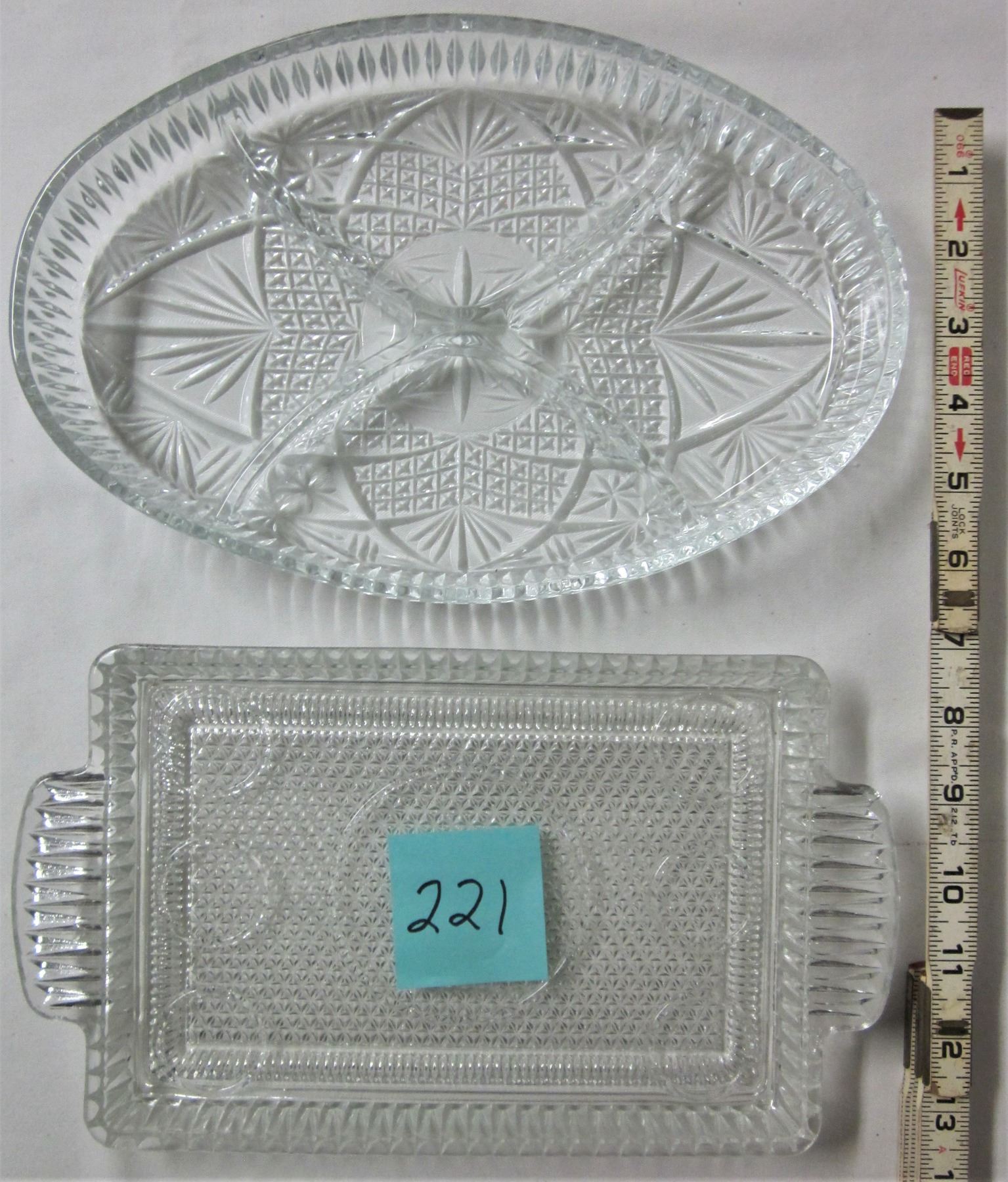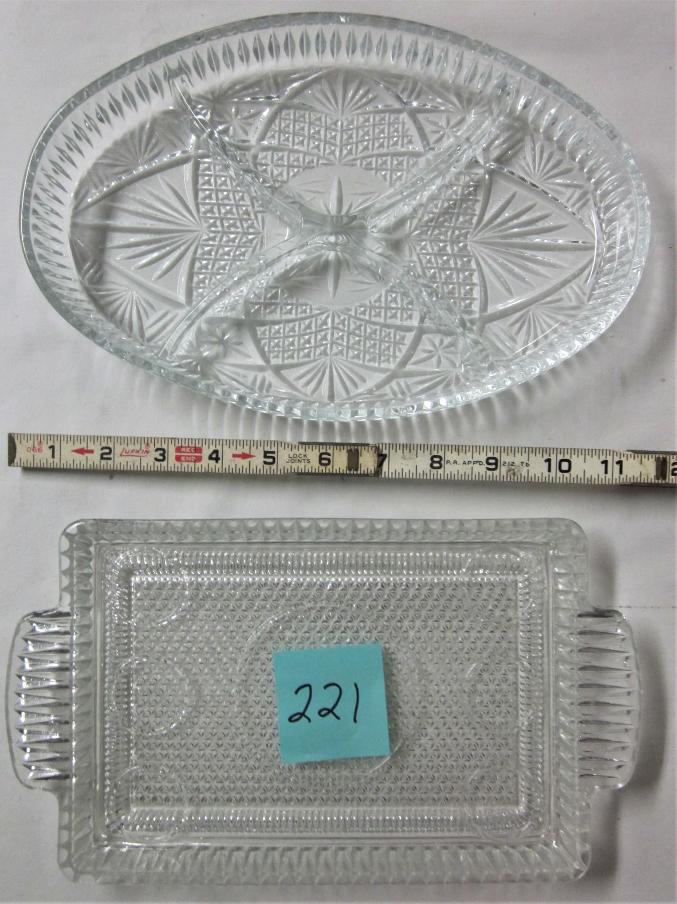 2- VINTAGE CUT GLASS SERVING TRAYS 11"x7" DIVIDED OVAL PICKLE TRAY 11"x6" RECTANGULAR HANDLED TRAY