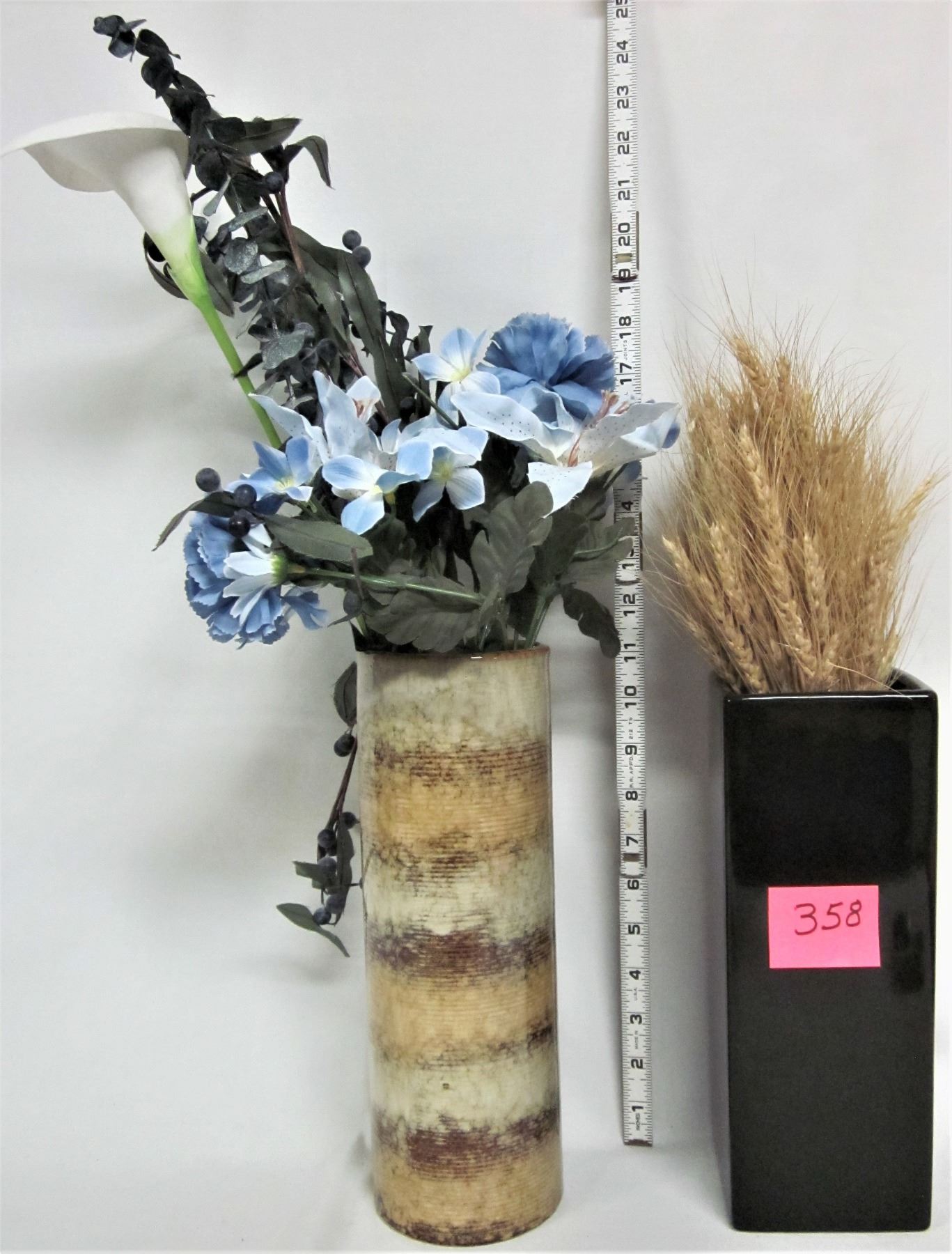 4" Square Black 10 1/2" tall, Wheat Sheaves - 4" Circular Brown Pottery 11 1/2" tall, Assorted Multi Coloured Plastic Flowers