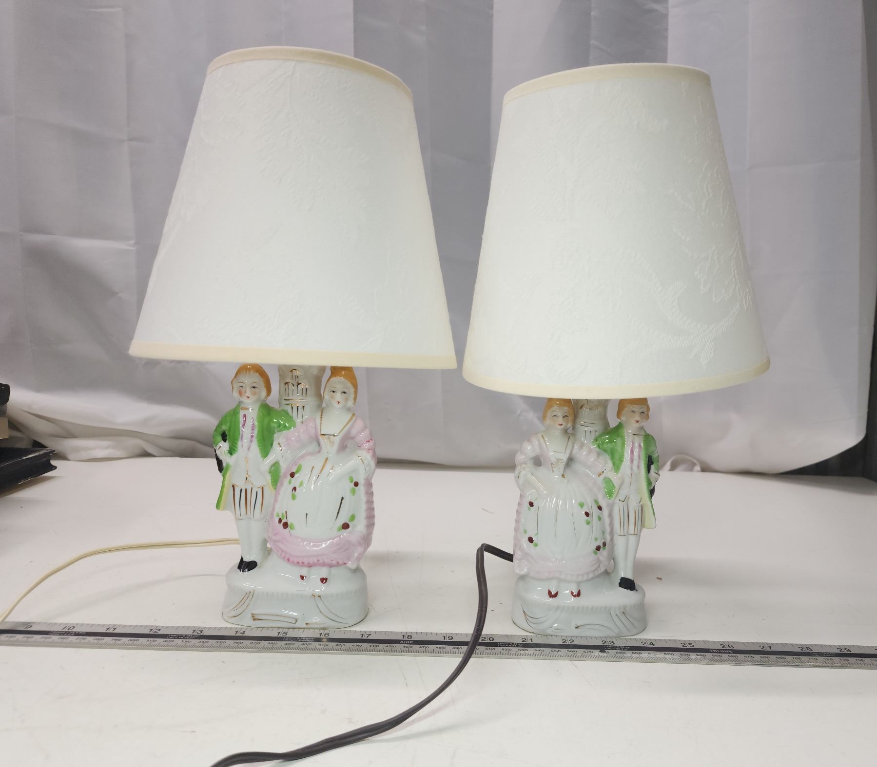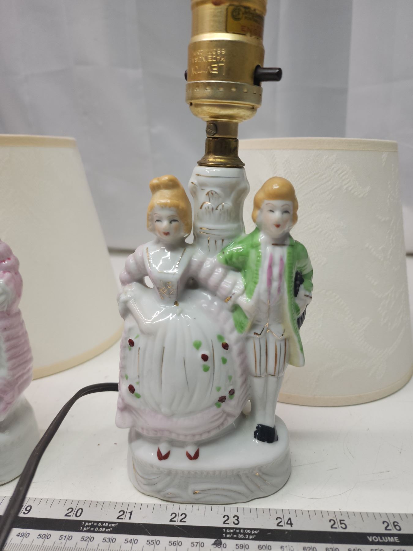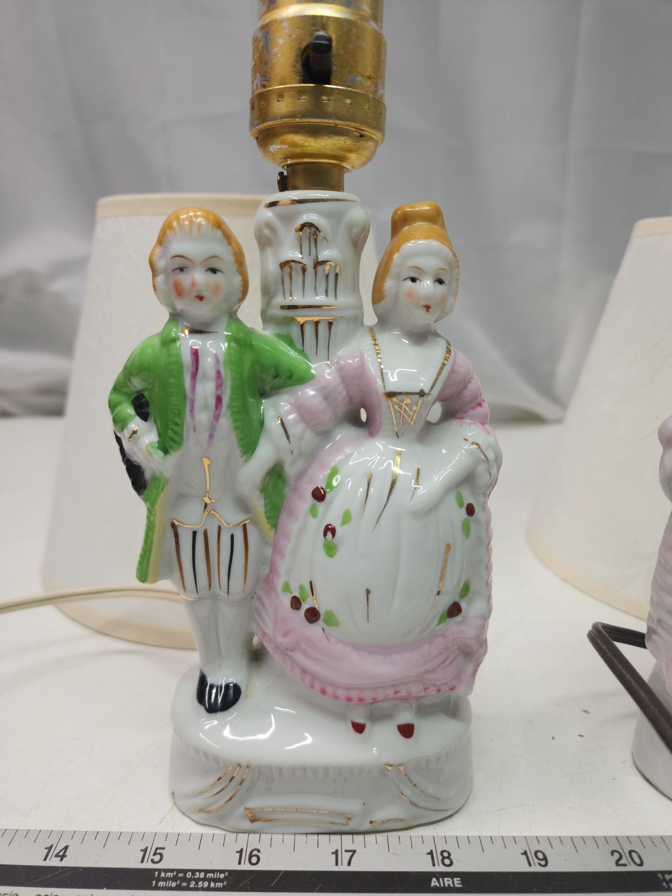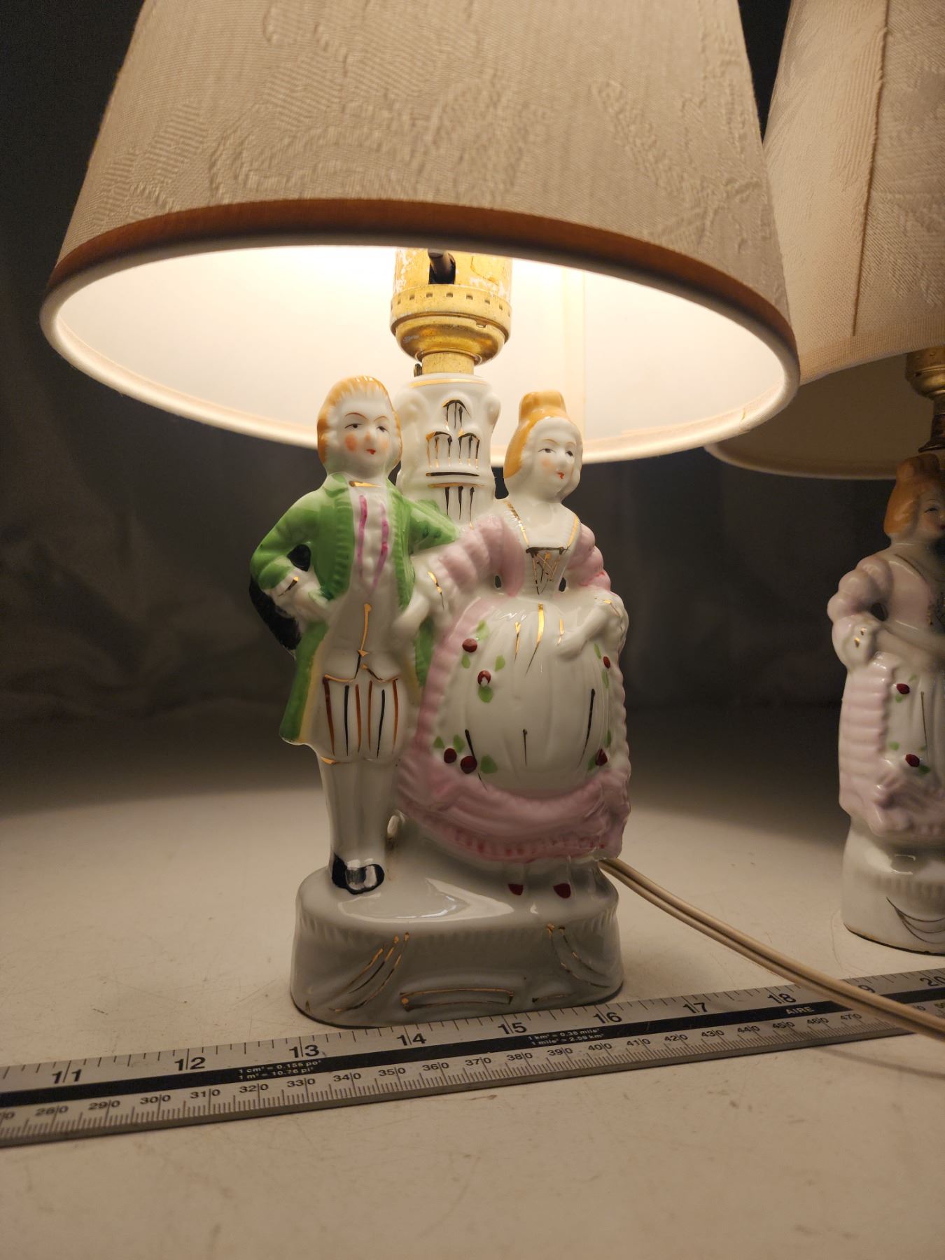 2 Victorian style, porcelain figurine lamps - 14"H - made in Japan - works, 1 bulb is burnt out
