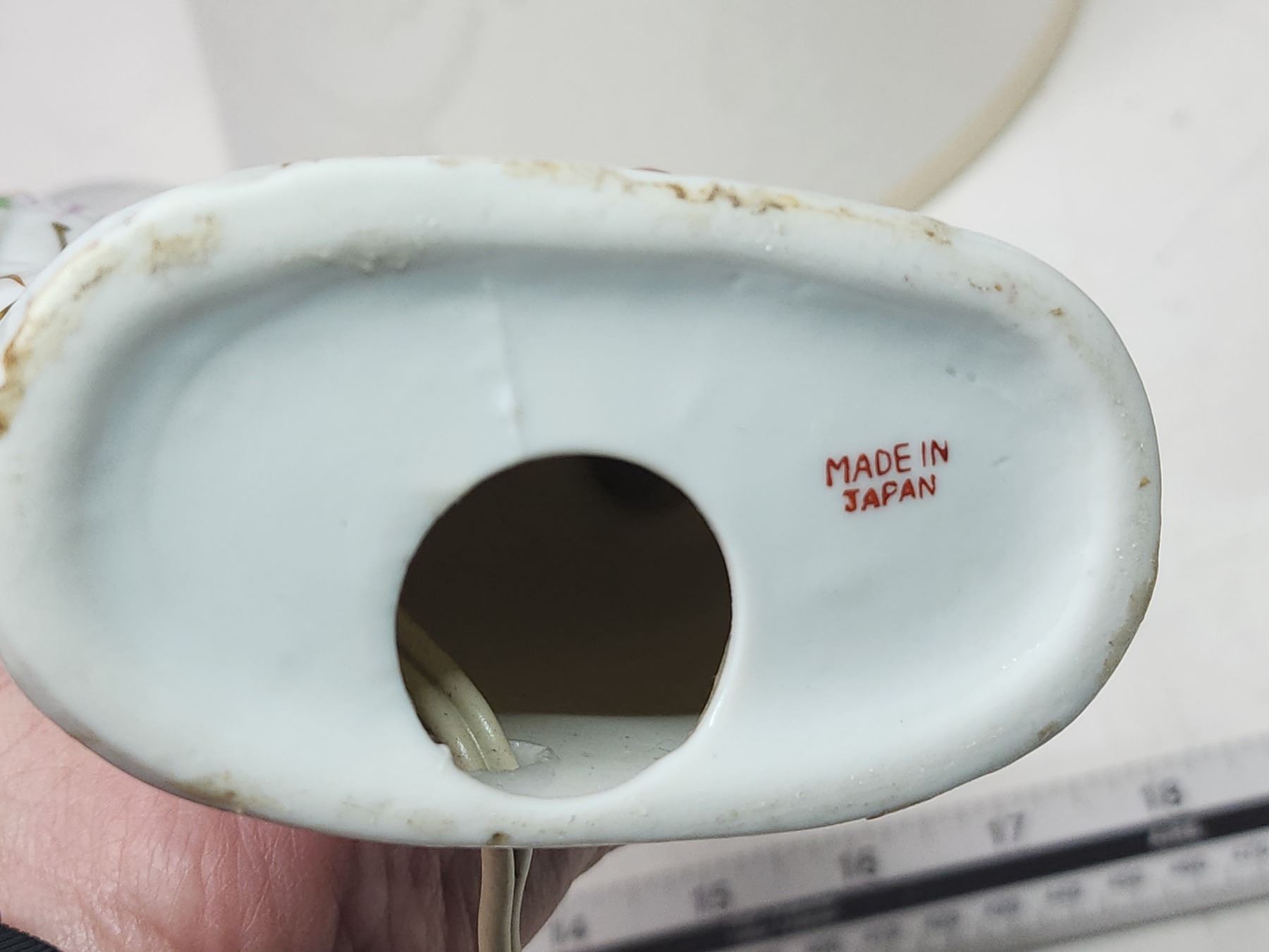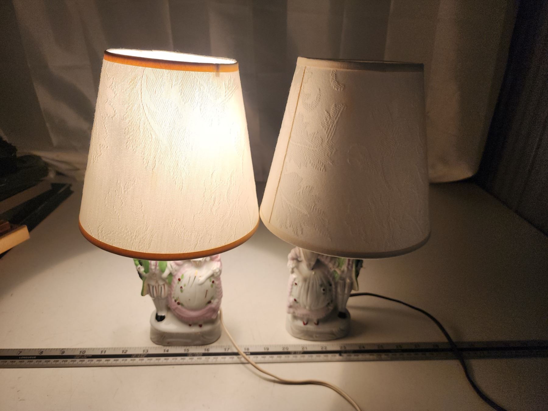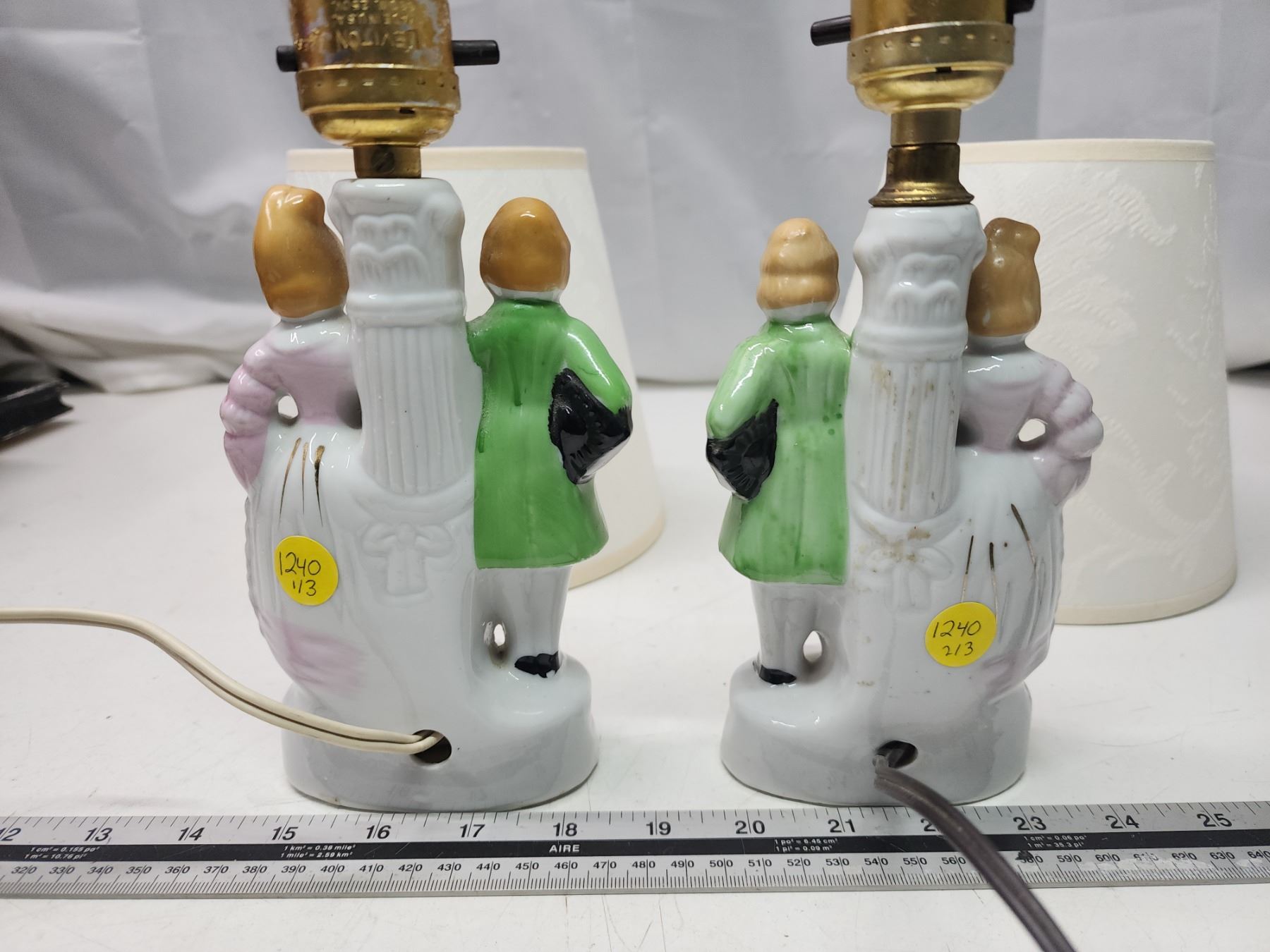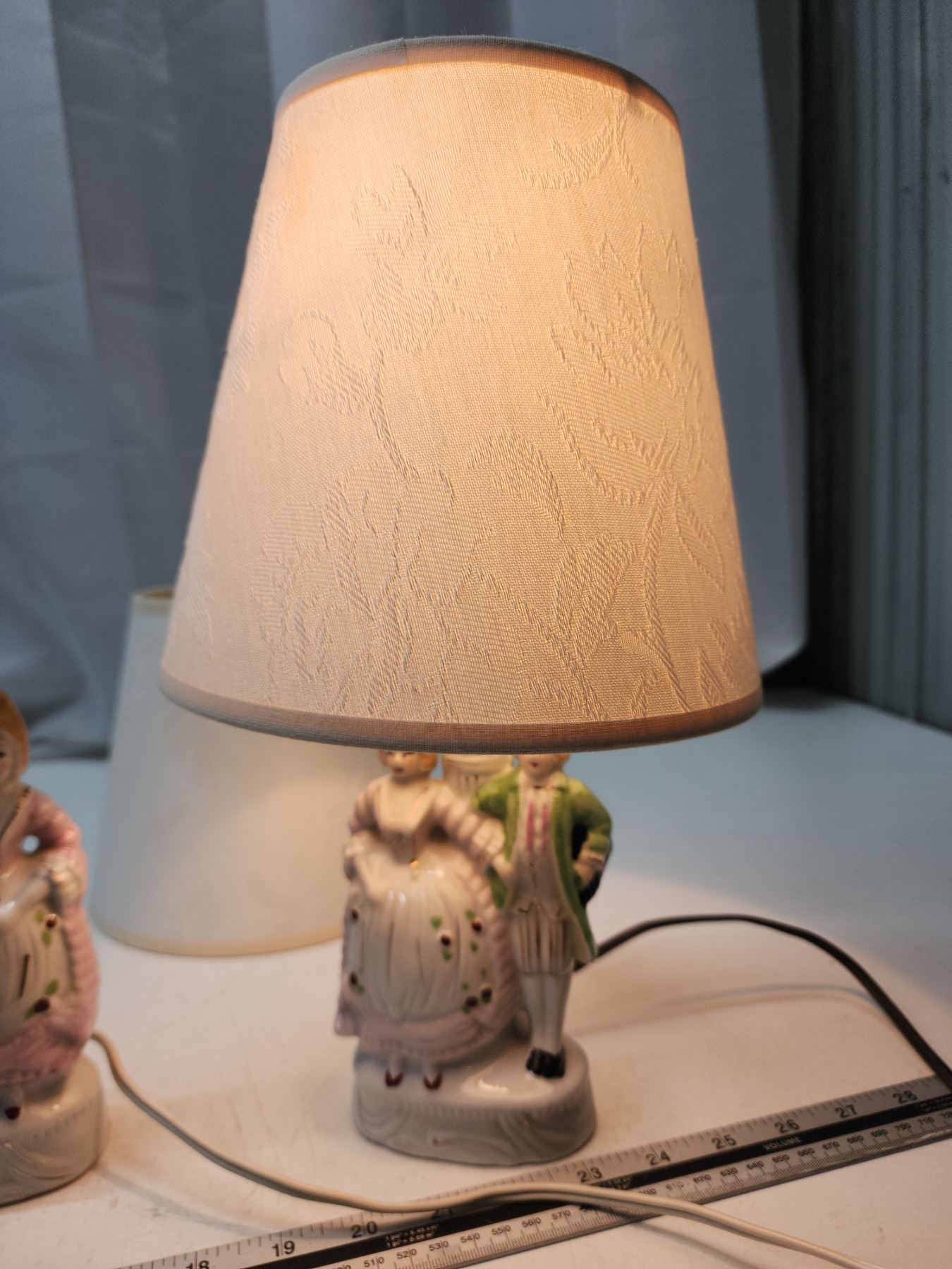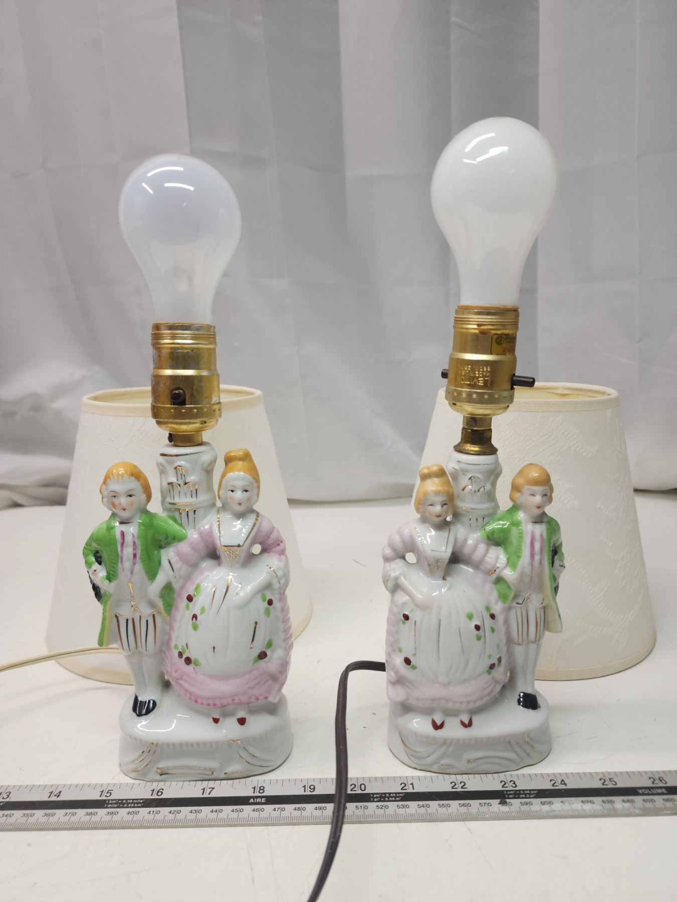 2 Victorian style, porcelain figurine lamps - 14"H - made in Japan - works, 1 bulb is burnt out