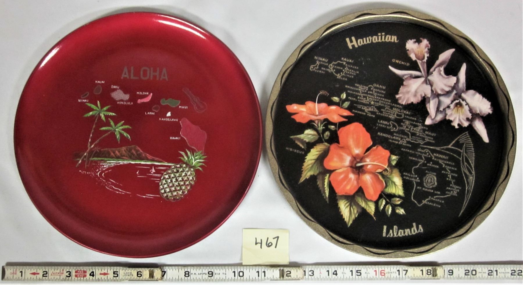 2 Vintage 11" dia Round Metal Souvenir Photo Trays Aloha - Hawaiian Islands