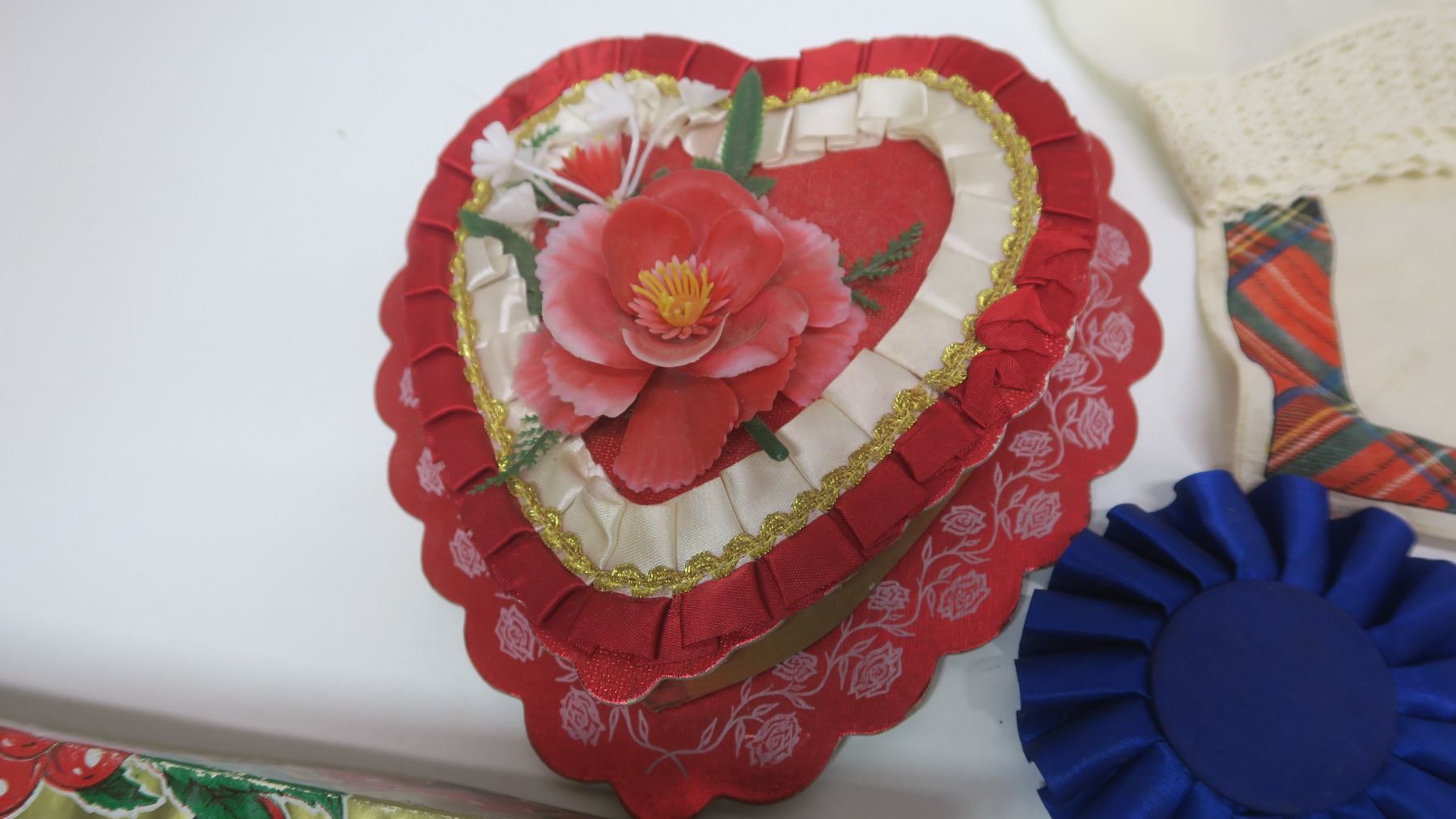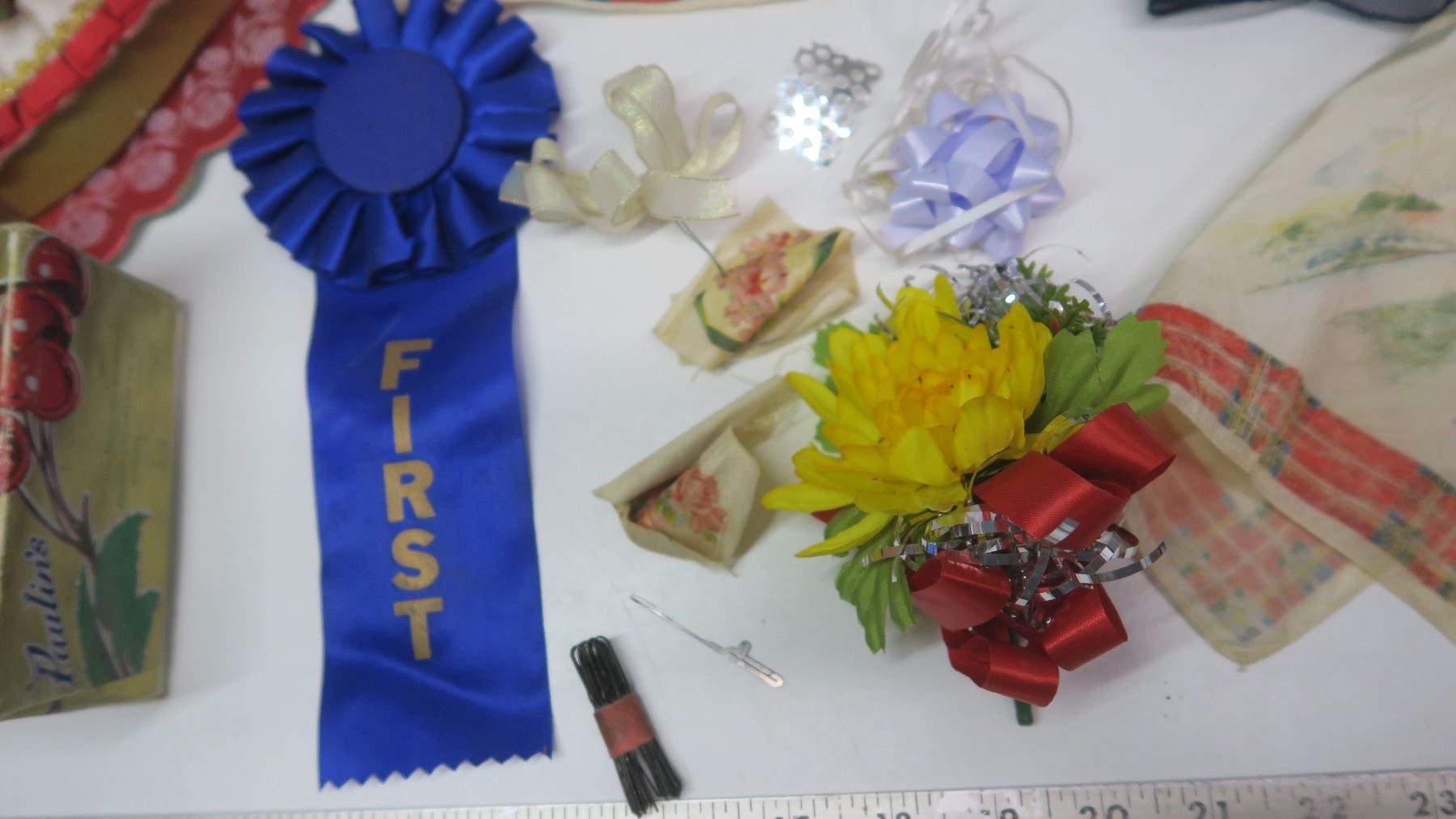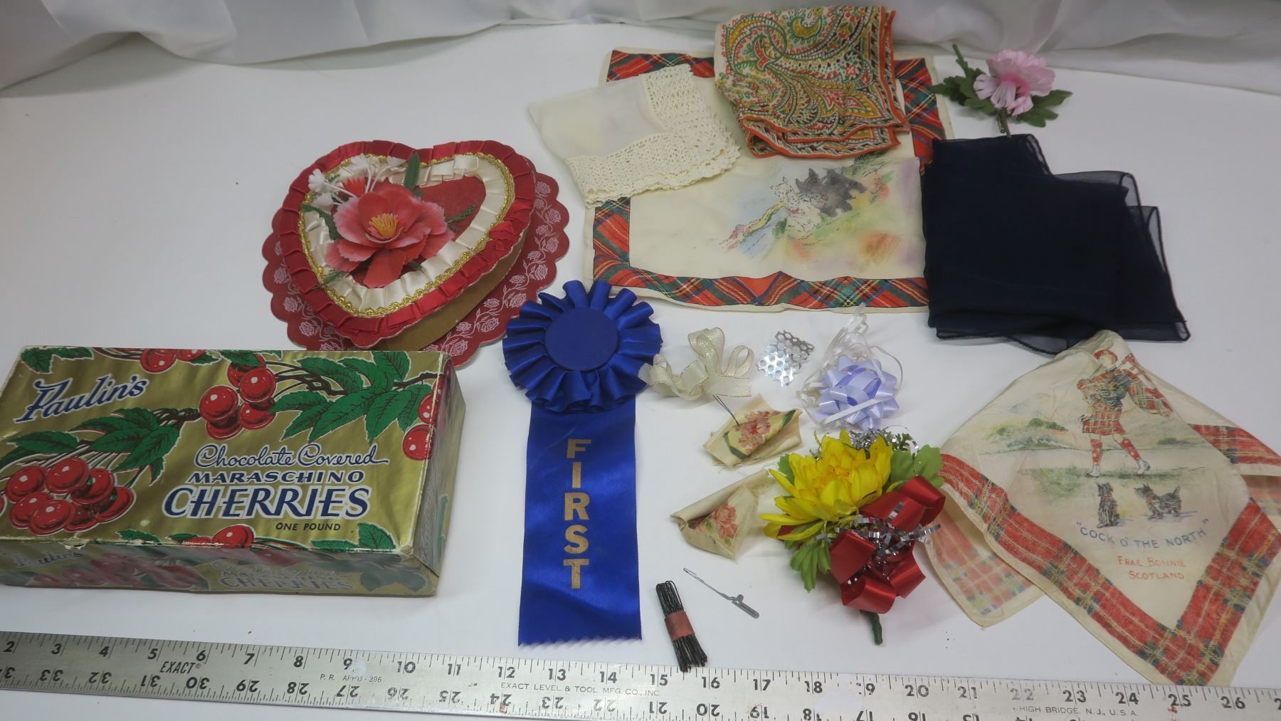 2 Vintage Chocolate Boxes with Corsages, 1st Place Ribbons + Hankies + Vintage Scarf