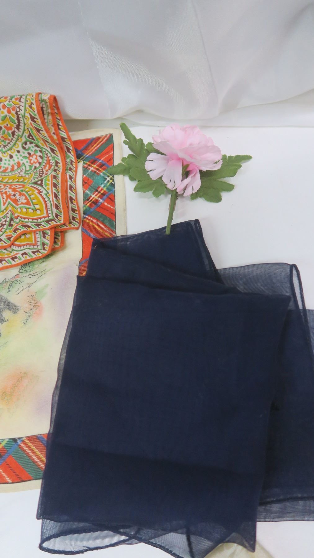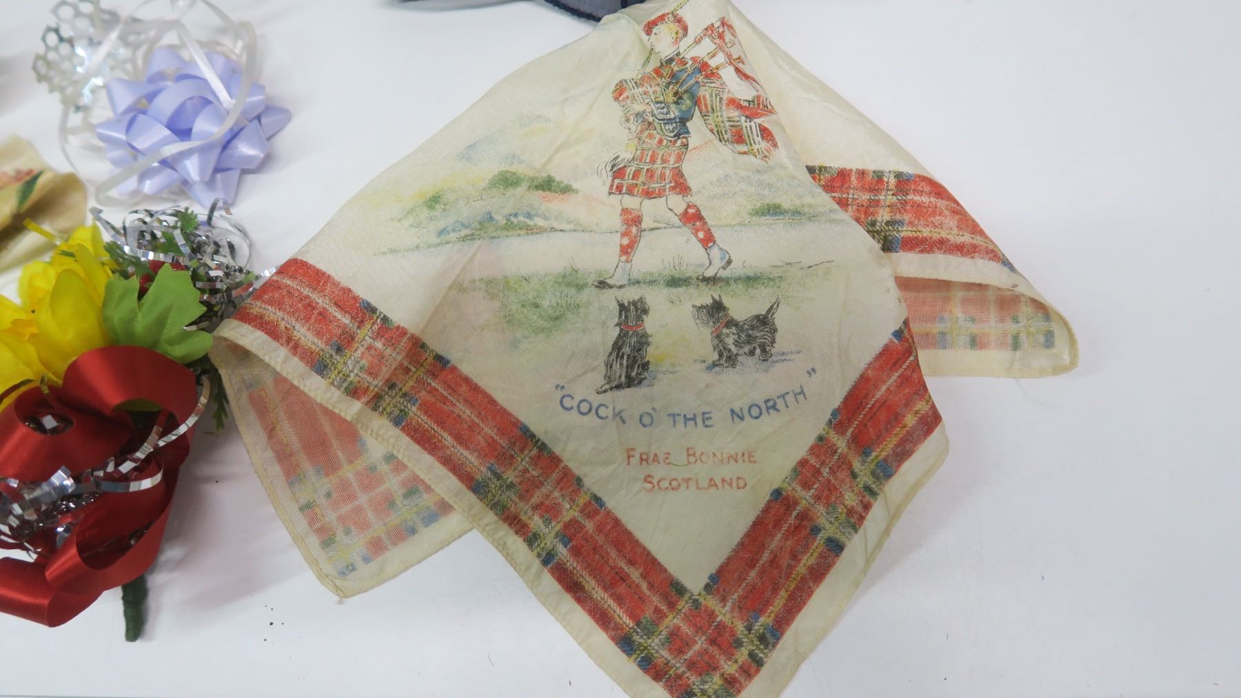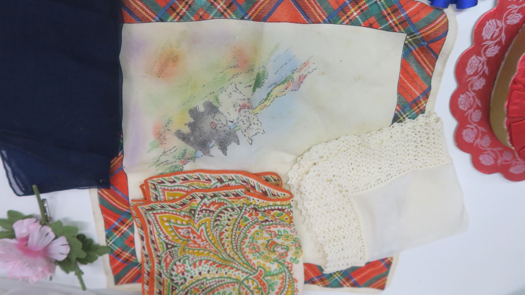 2 Vintage Chocolate Boxes with Corsages, 1st Place Ribbons + Hankies + Vintage Scarf
