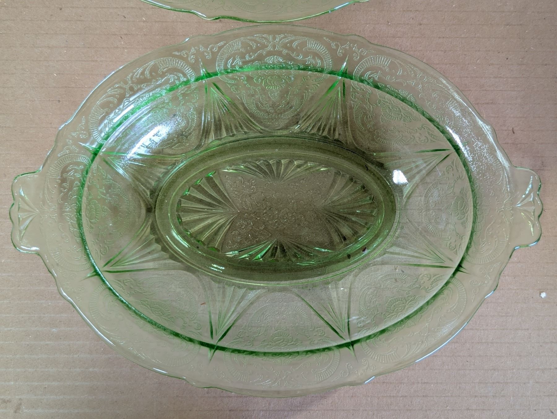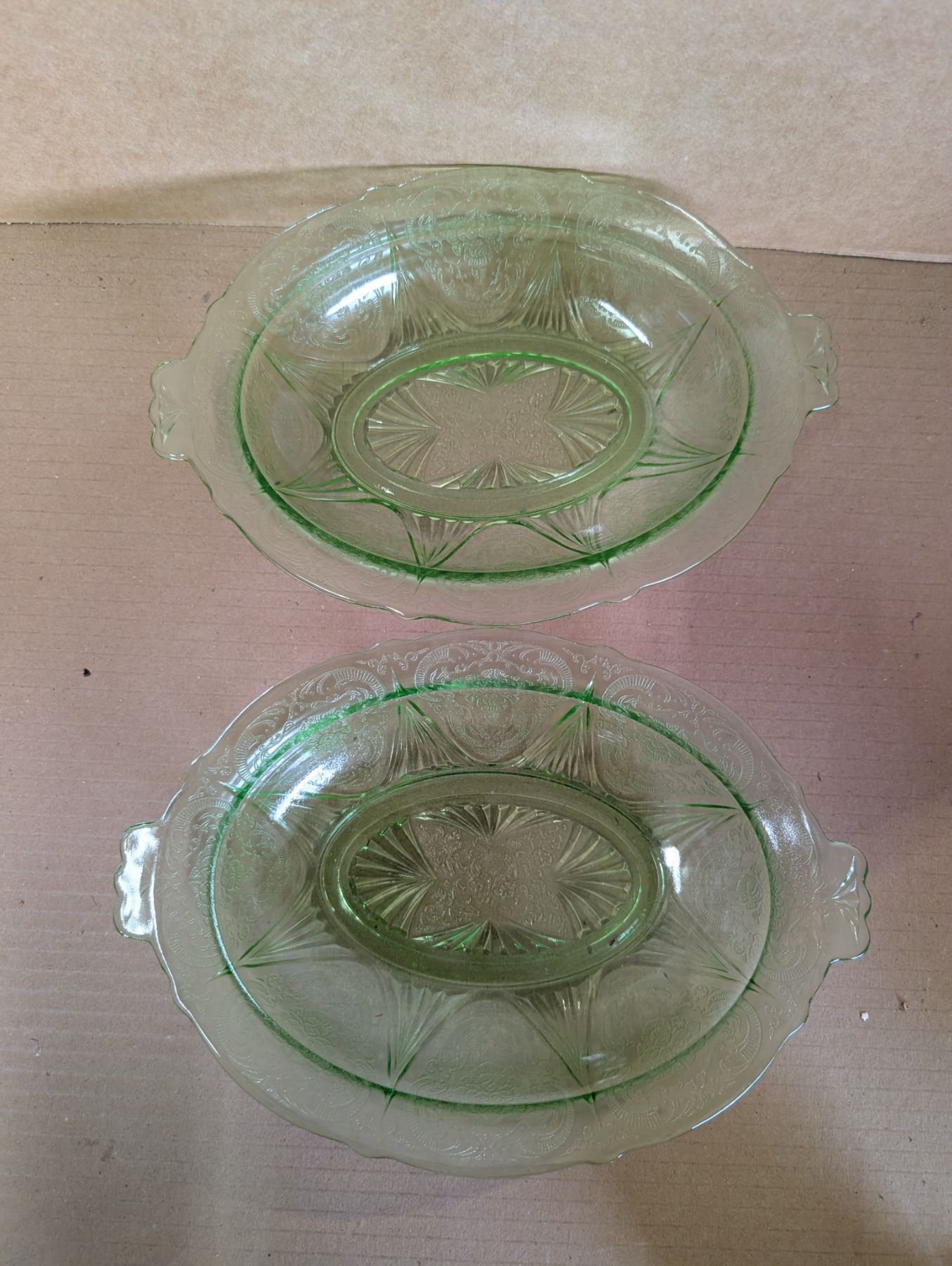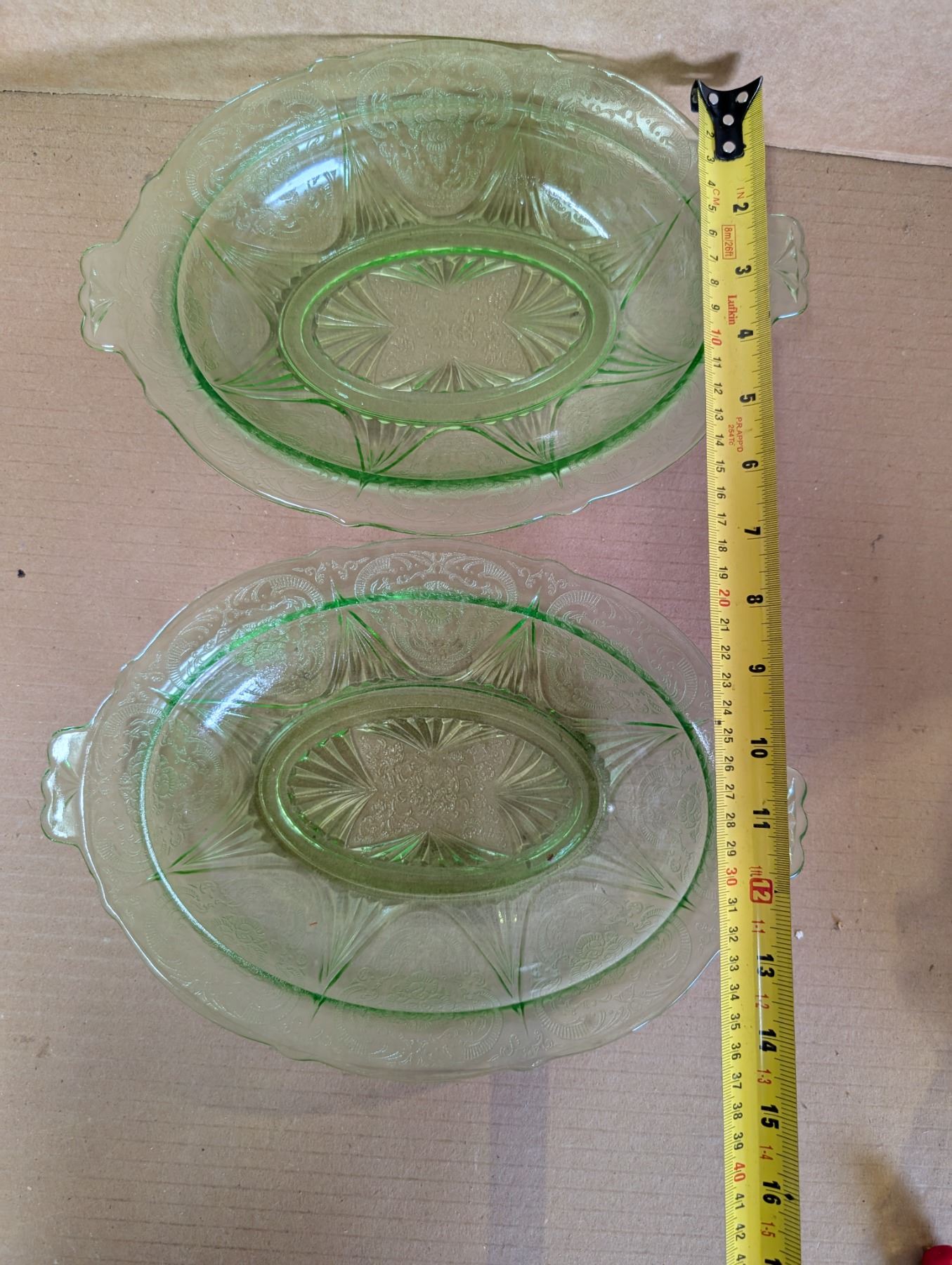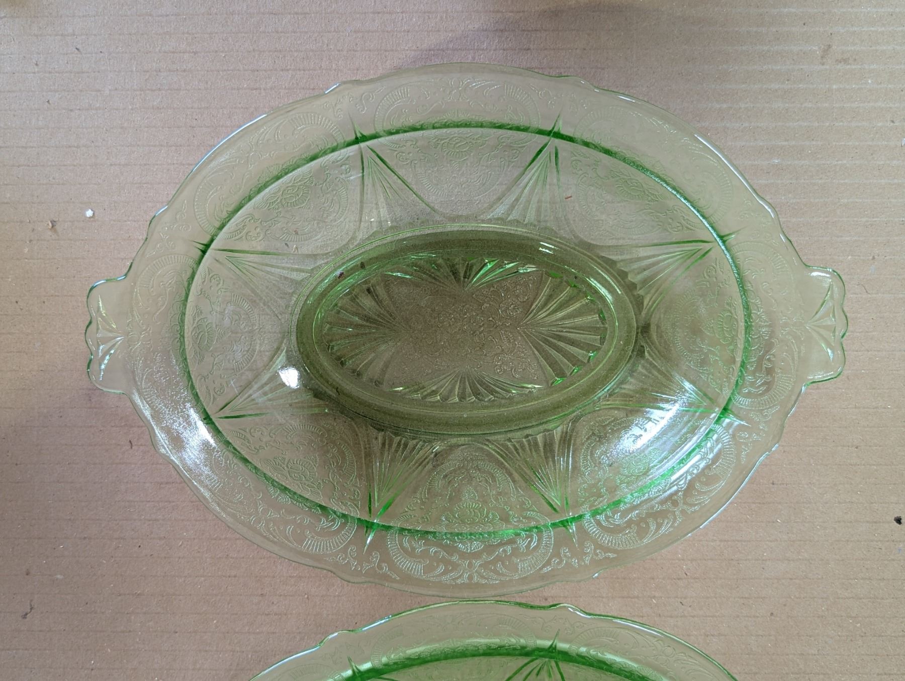 (2) Vintage Hazel Atlas Royal Lace Green Depression Glass Oval serving Platters