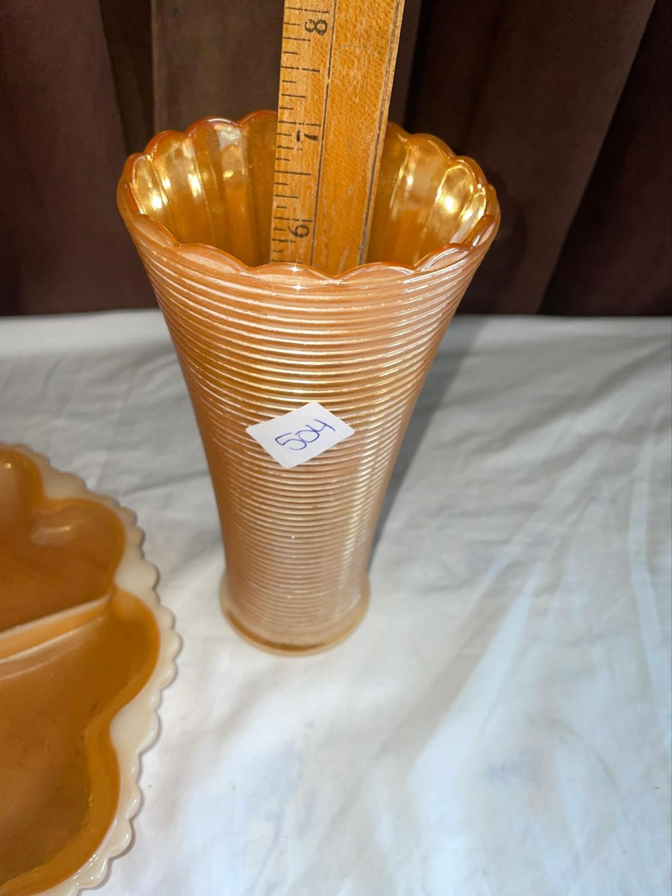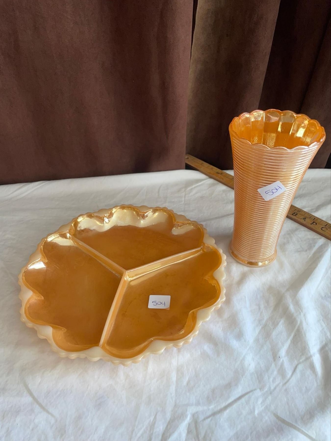 2 Vintage Pieces of Peach Lusterware 1 divided platter made of milk glass with peach lustre finish, and 1 ribbed lusterware vase. Both in "Like New" condition