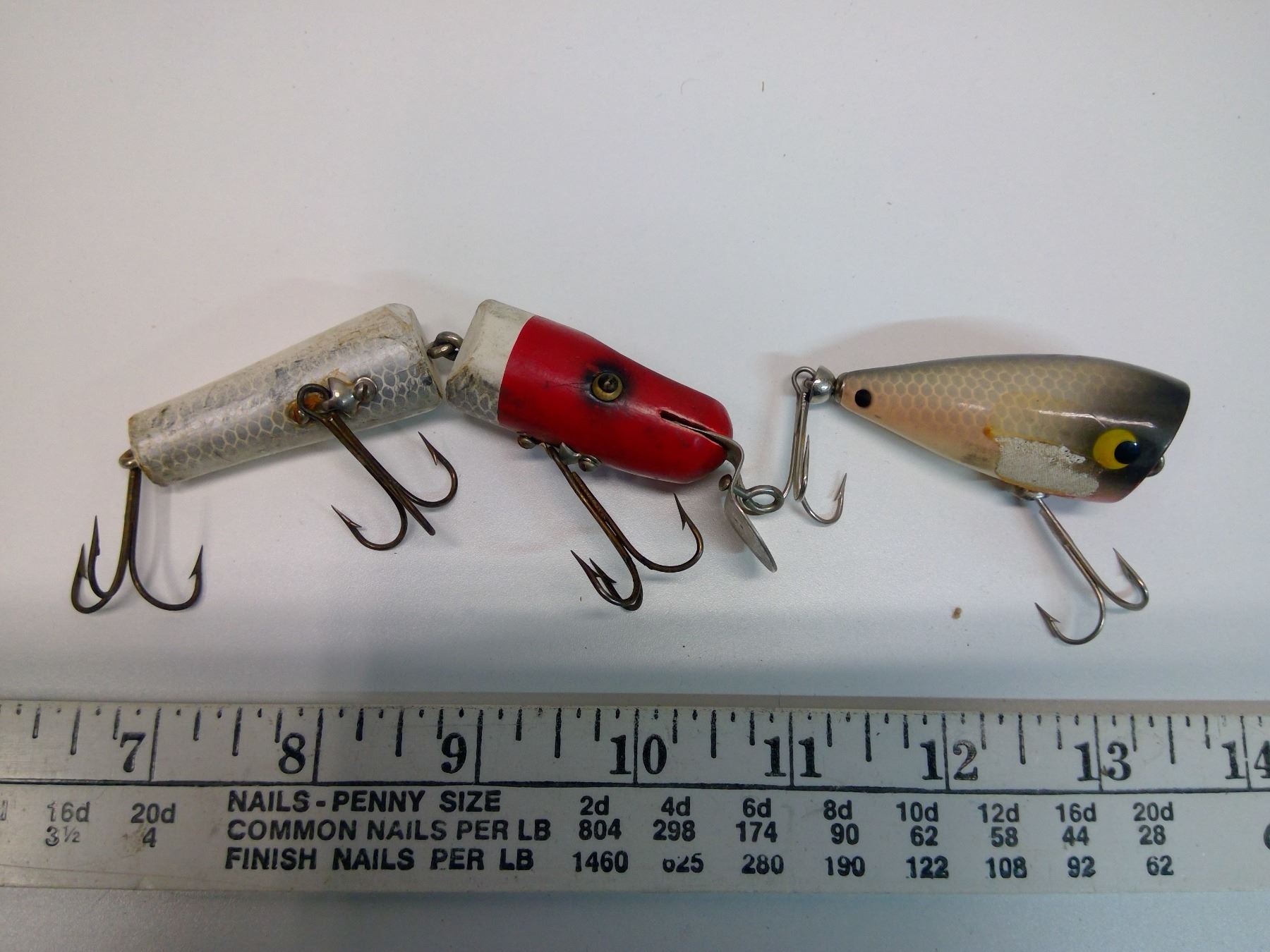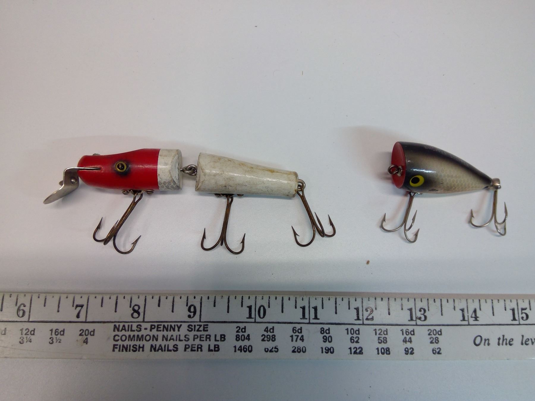 2 Vintage Wooden Lures (Whopper Stopper) Lucky Strike 3 Hook Jointed 5" Long Wooden