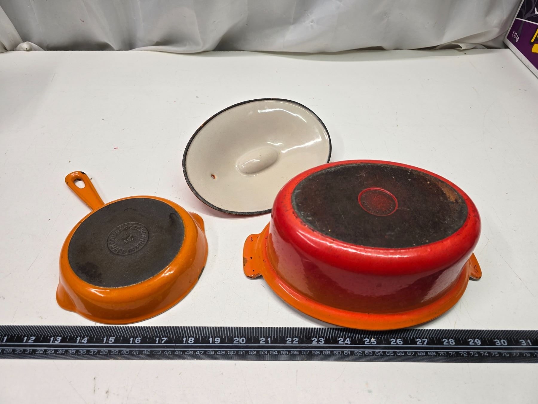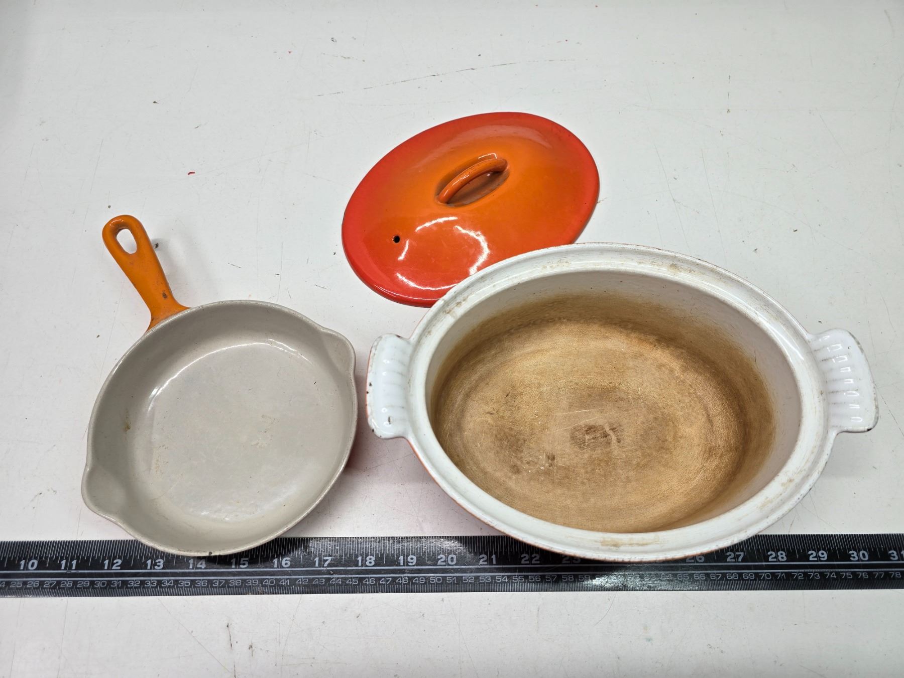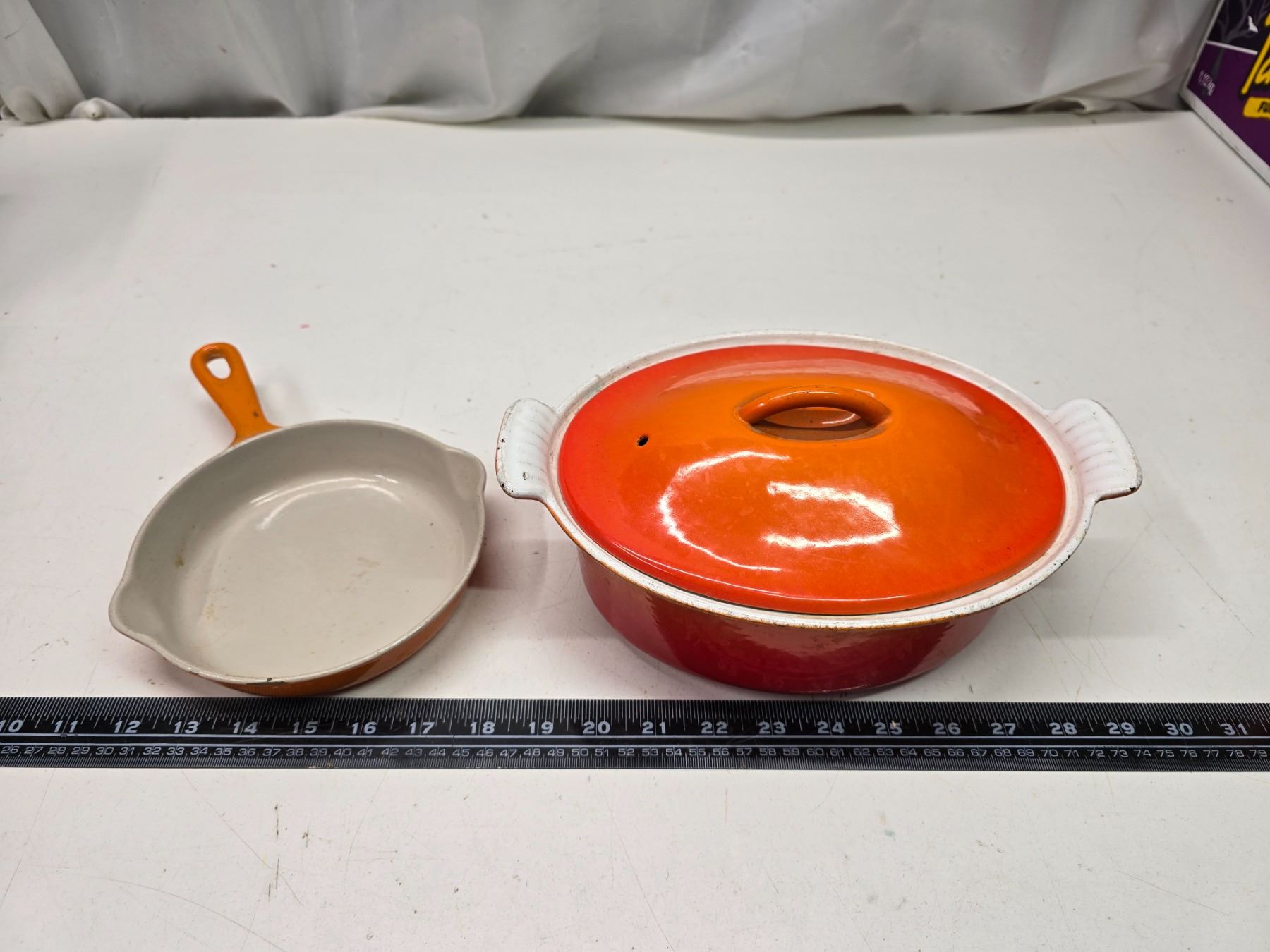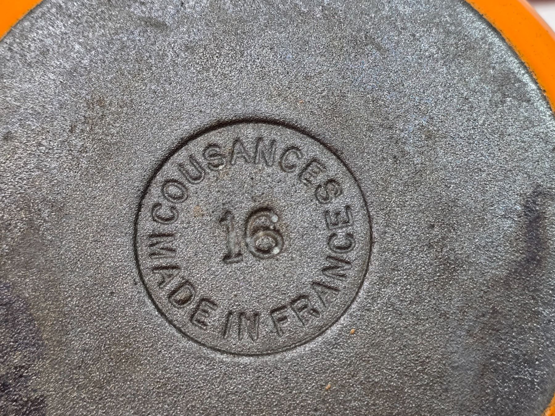 2 Vintage rare "Le Creuset" flame orange, cast iron - 6.5" skillet #16 & Casserole dish w/ lid #22 - Made in France
