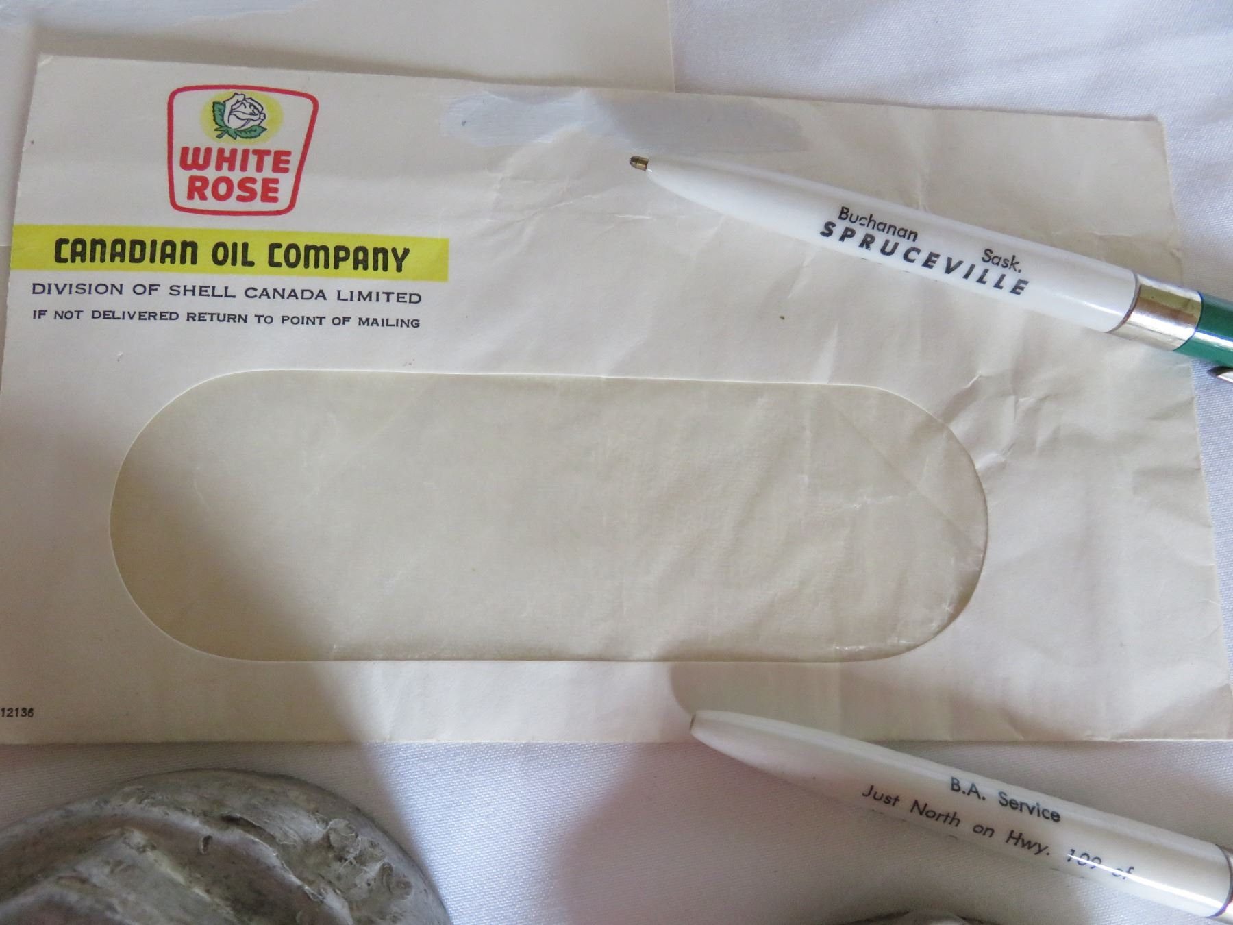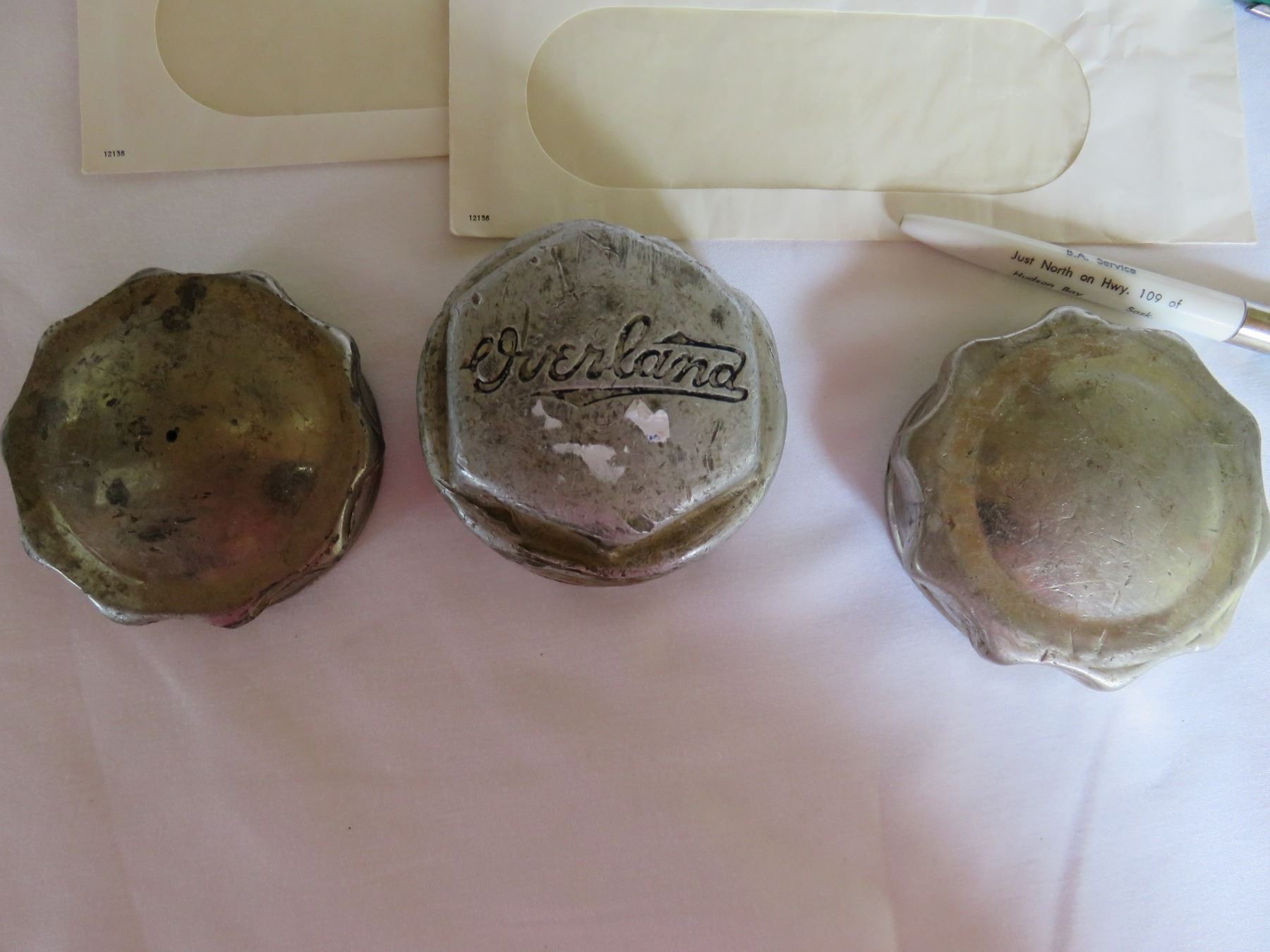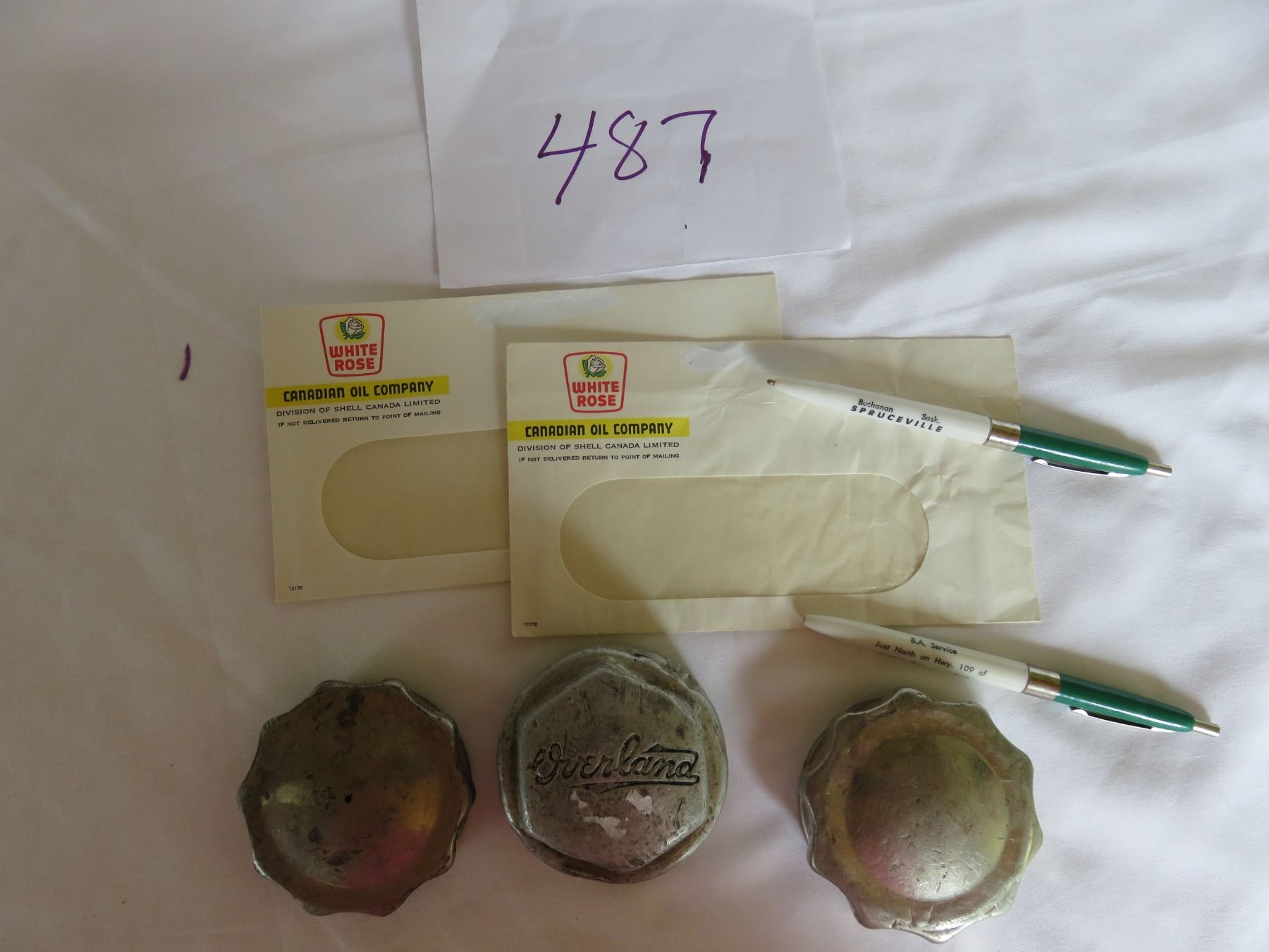 2 WHITE ROSE OIL ENVELOPES/OVERLAND 2 MODEL T GREASE CAPS/ 2 BA PENS