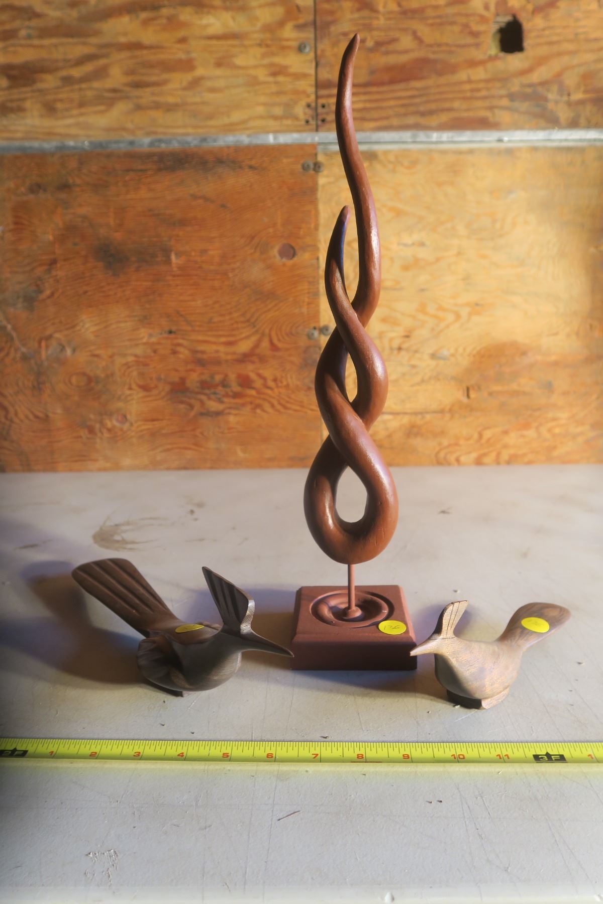 2 Wood Bird Carvings and Infinity Flame Wood Carving