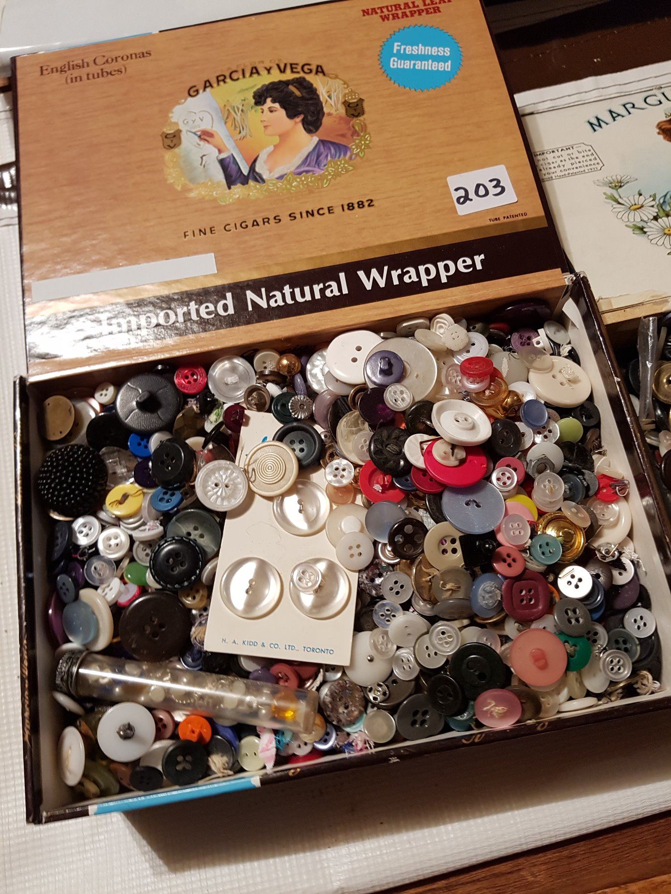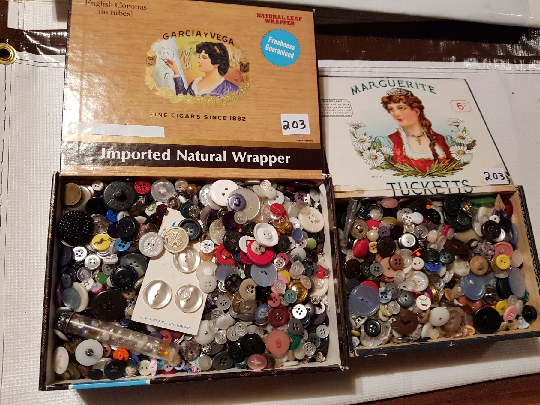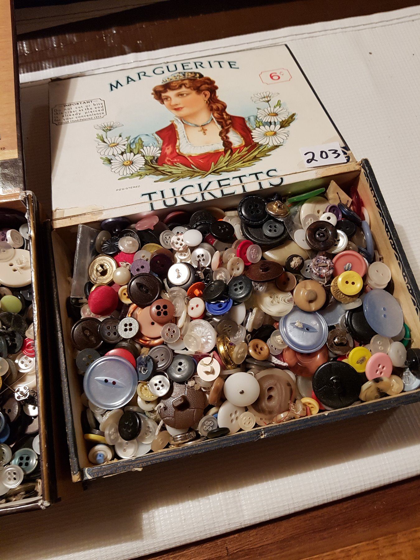 2 antique full cases of buttons (in tobacco cases)