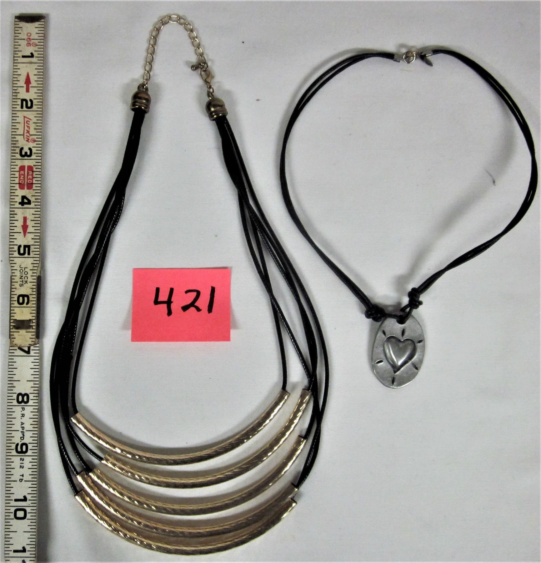 2 black rope necklaces 5 strand gold tone & 1 double strand silver tone heart pendant
