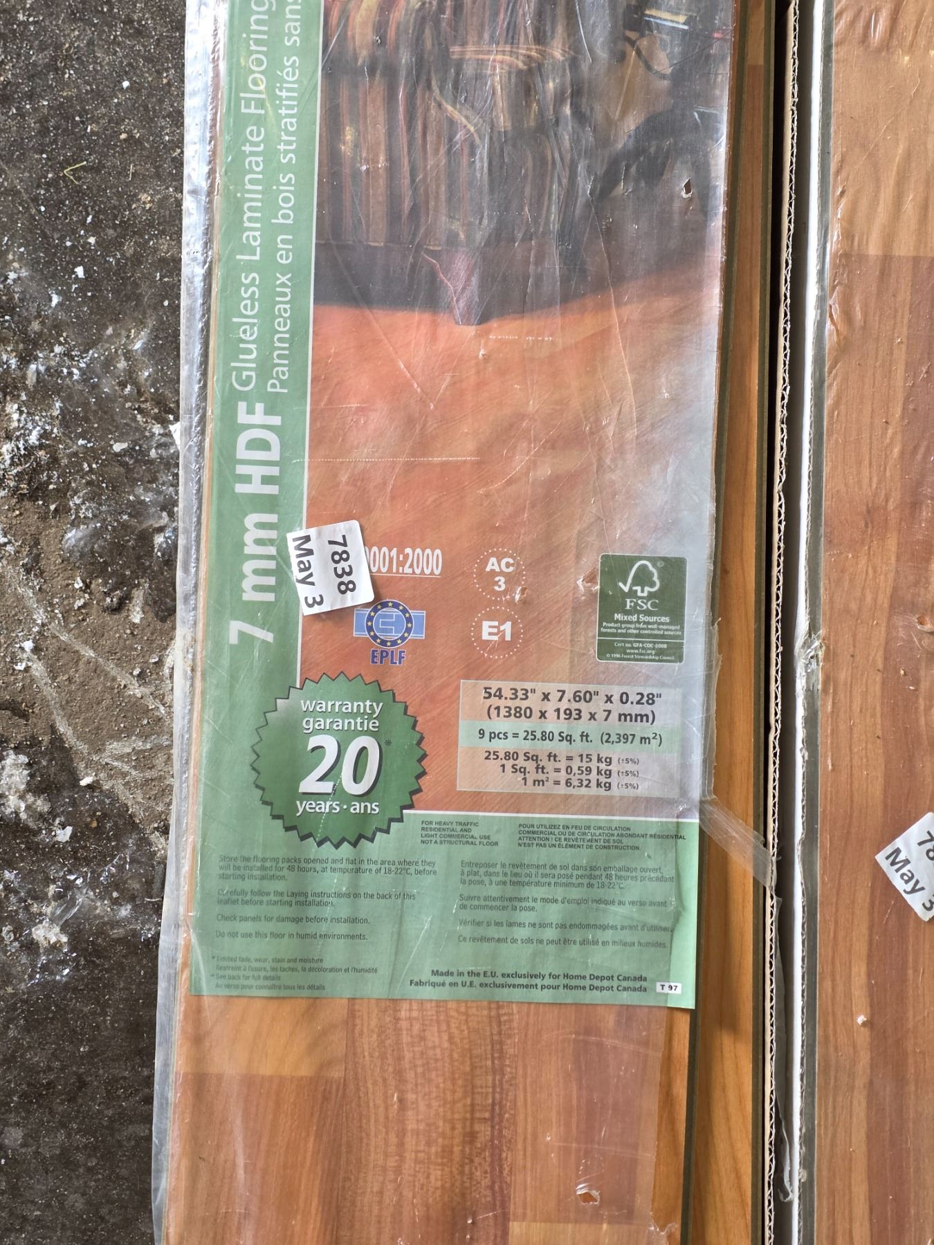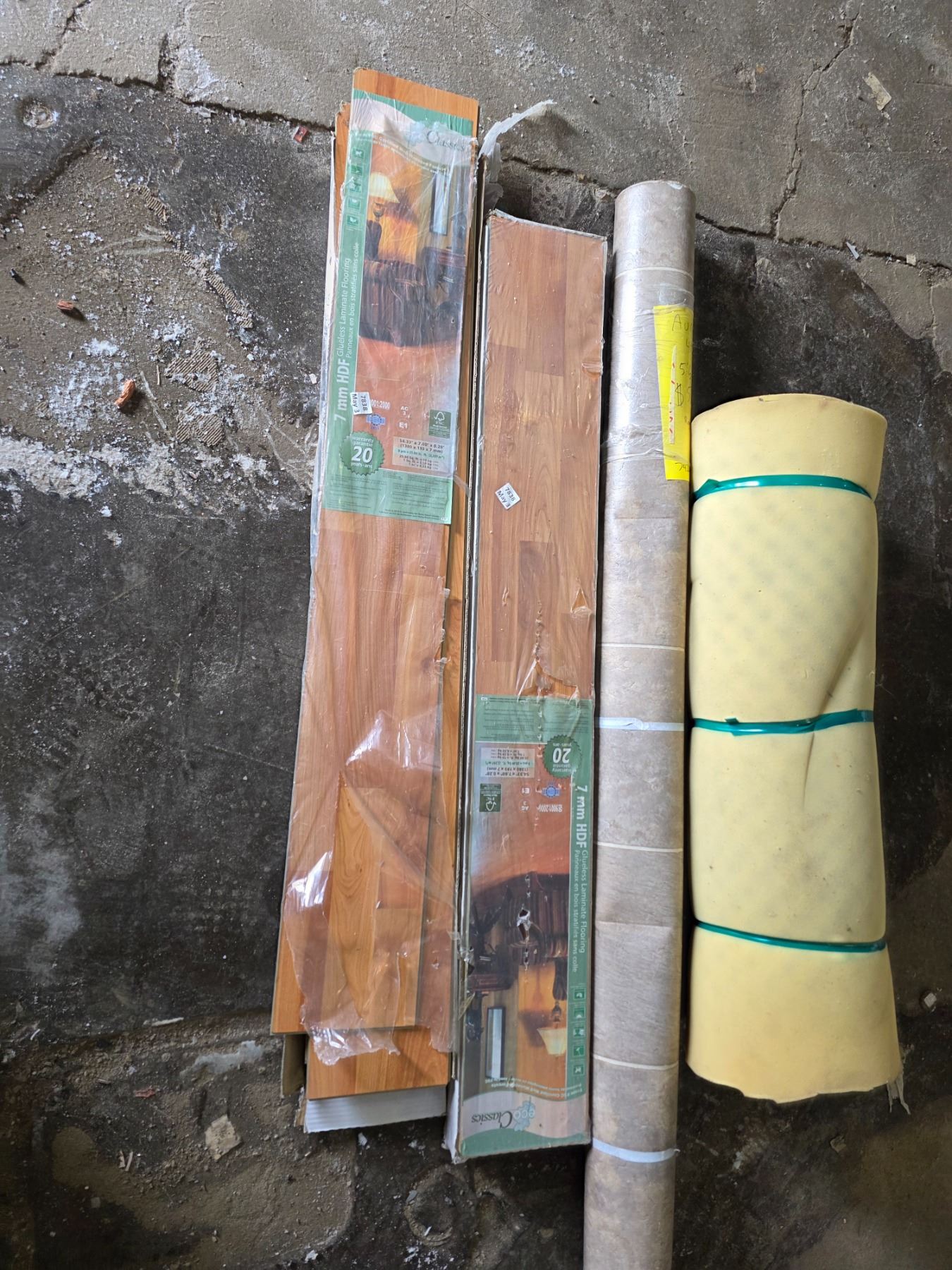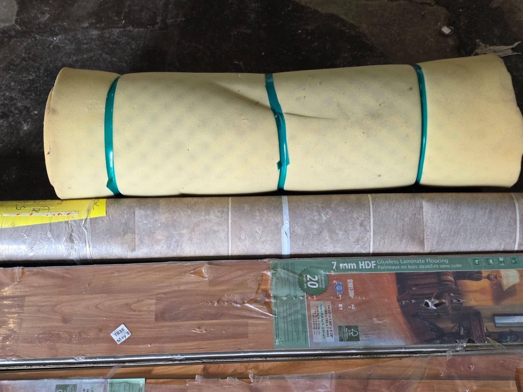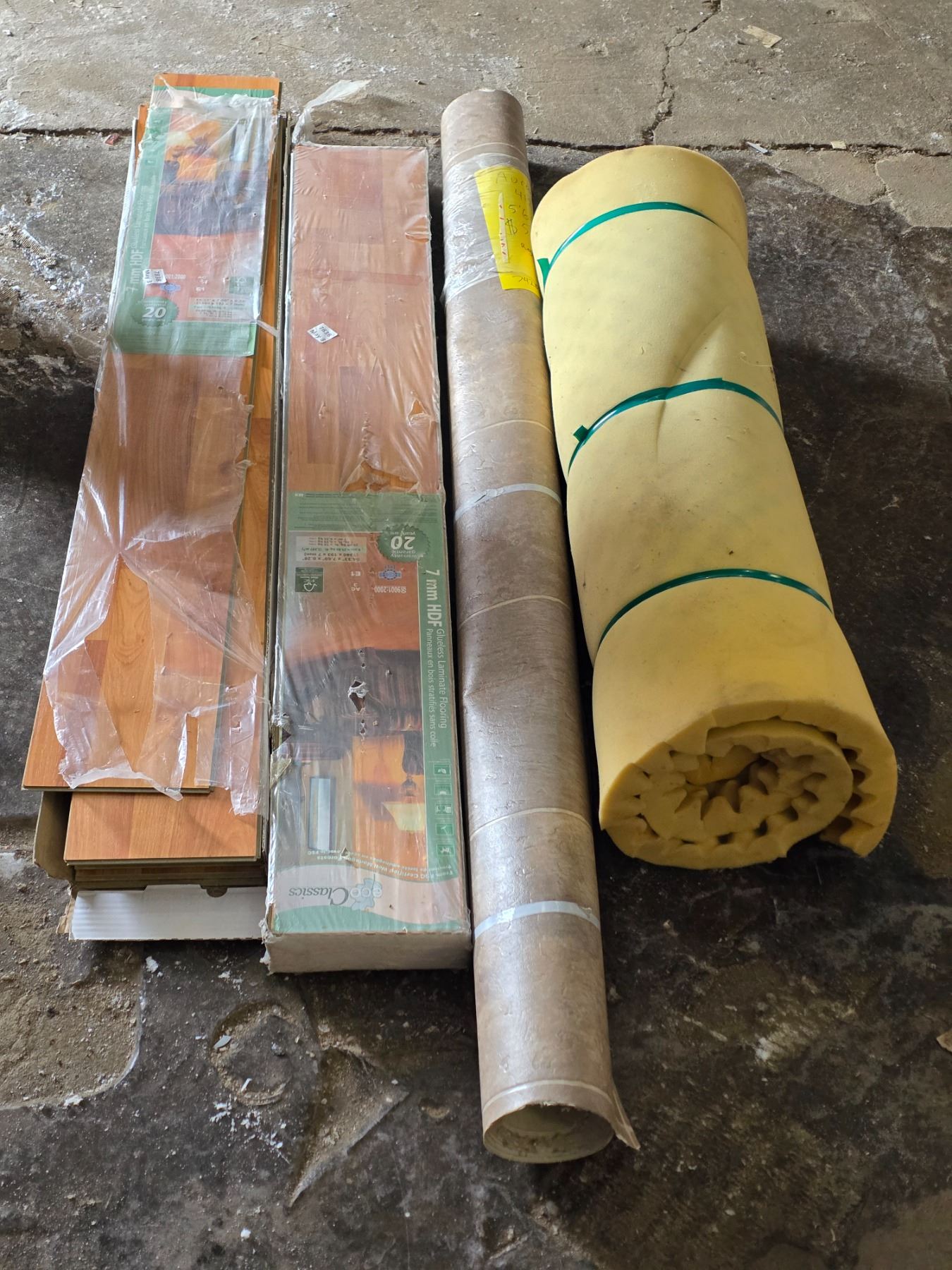 2 boxes of laminate flooring, roll of flooring and roll of foam