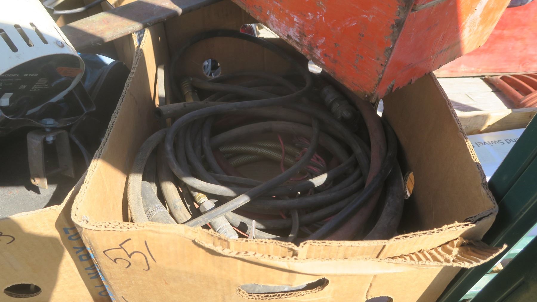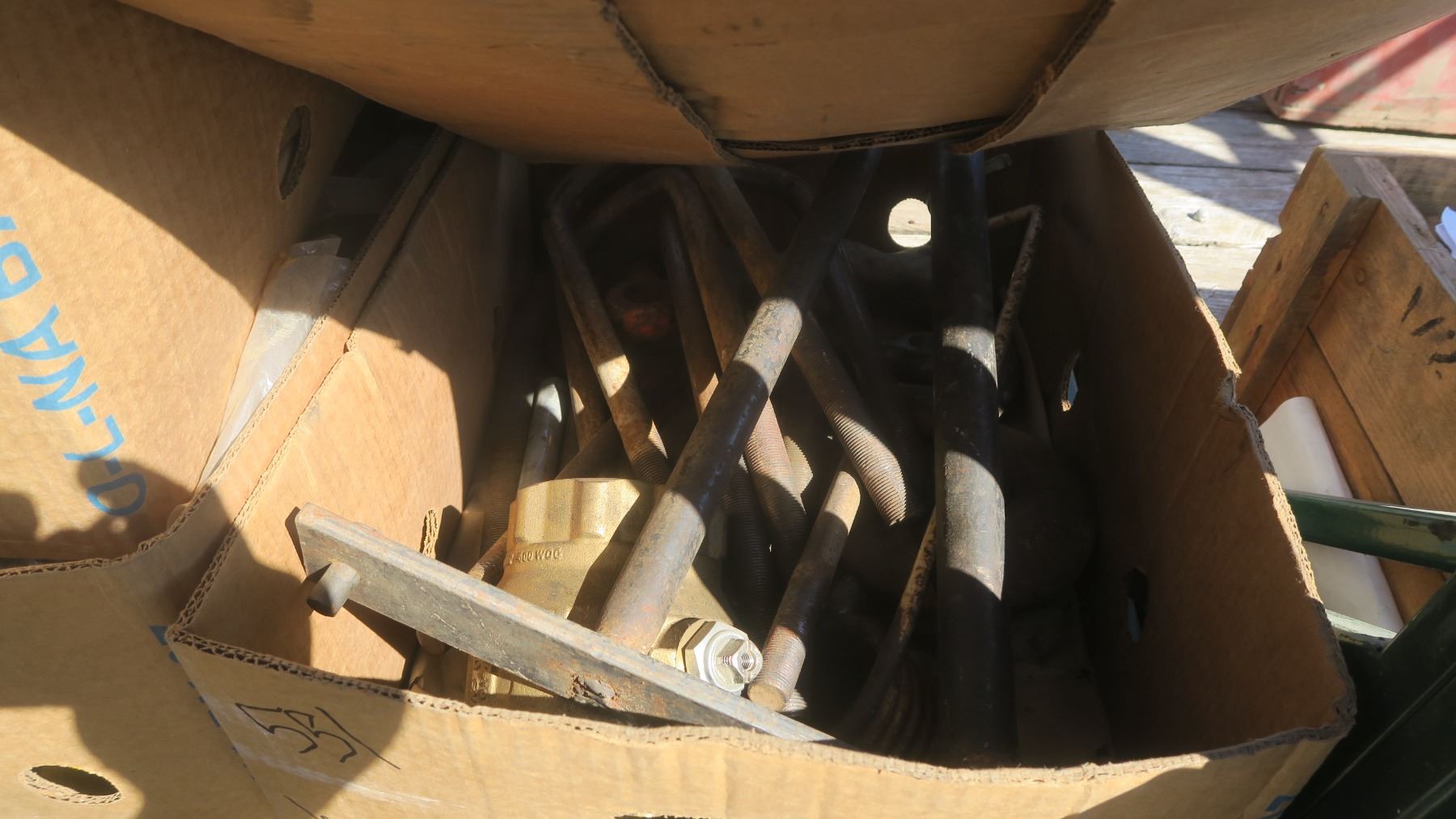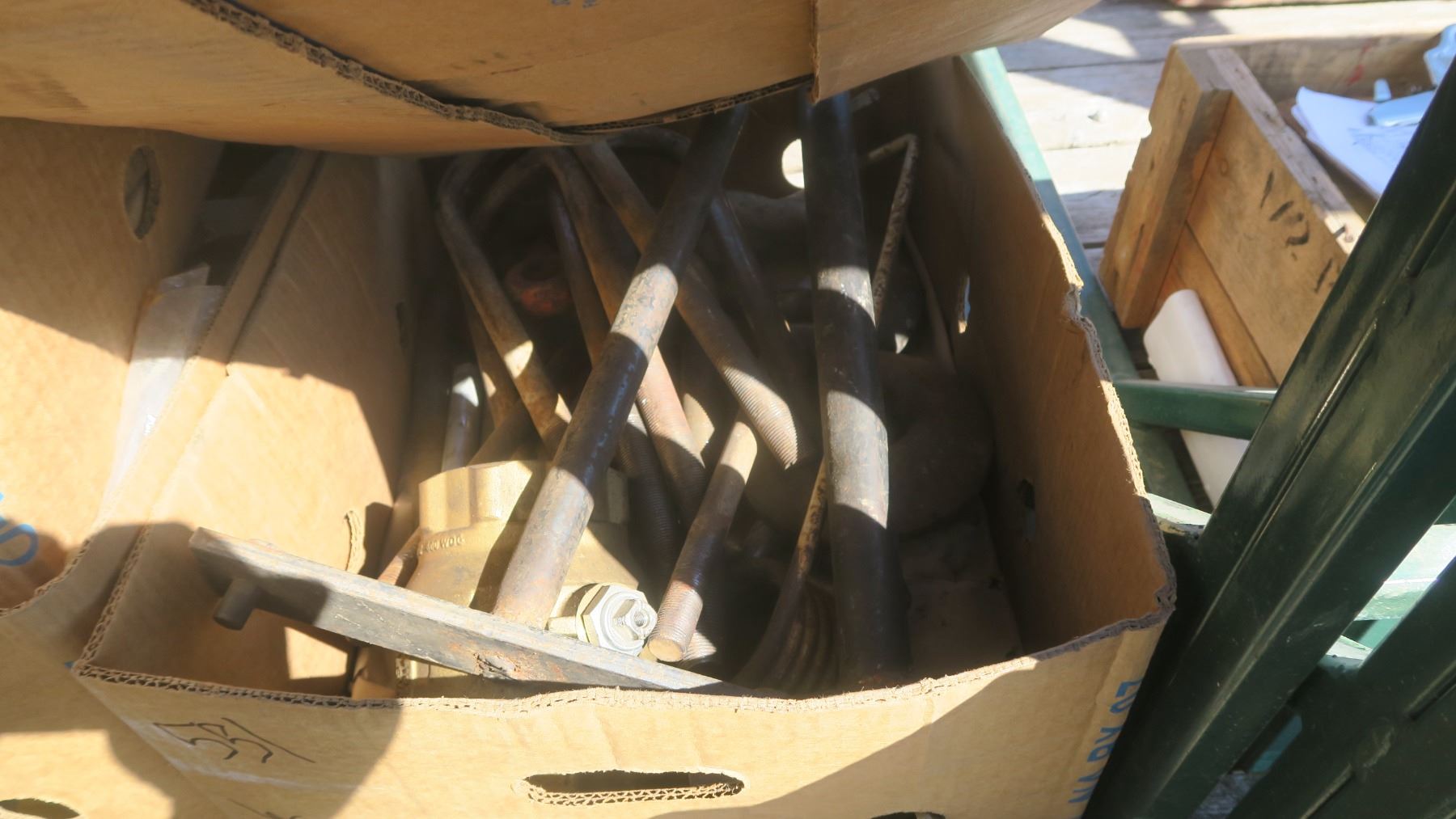2 boxes of misc. metal bolts, large tow hooks, hose's, wood box