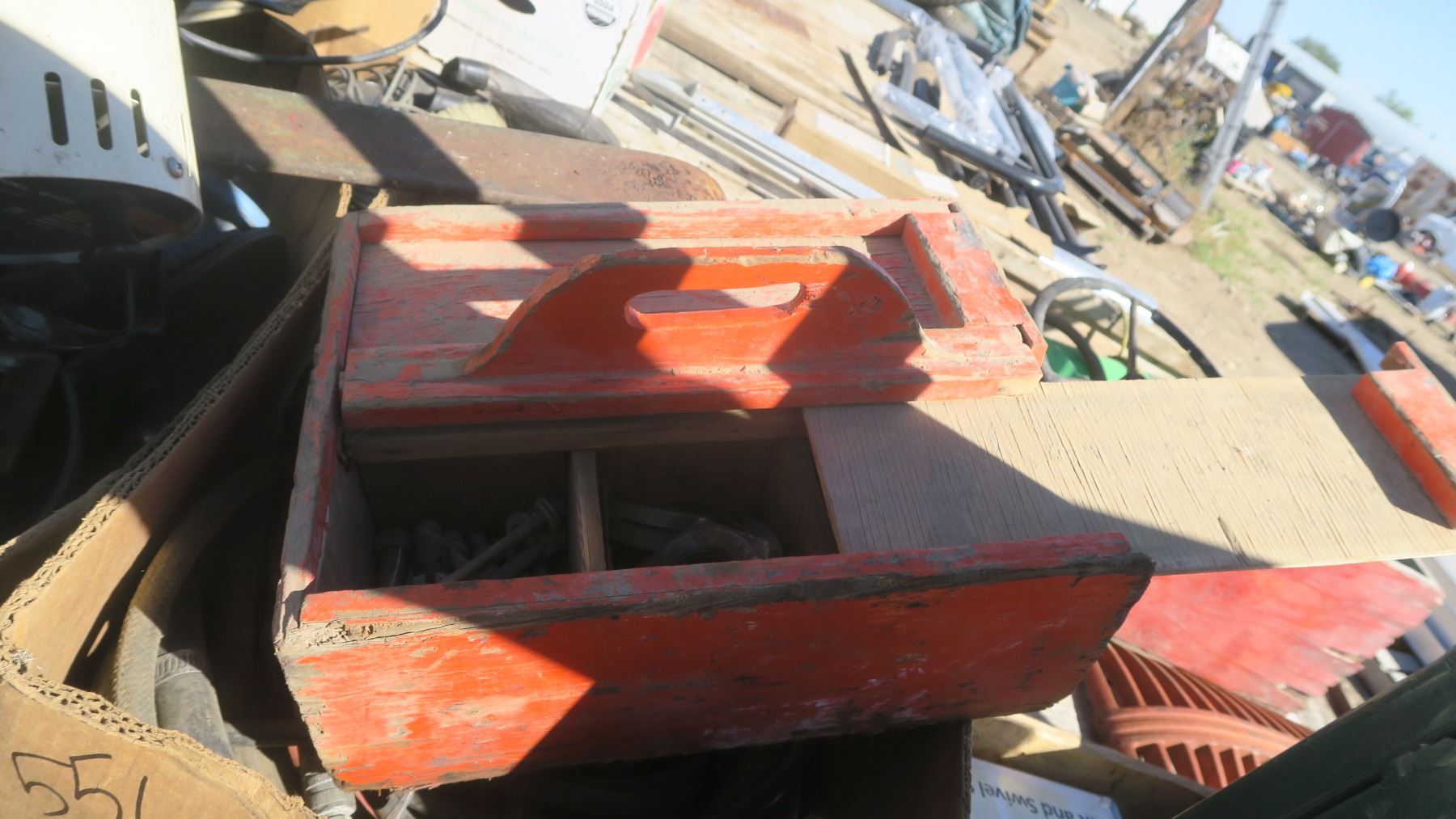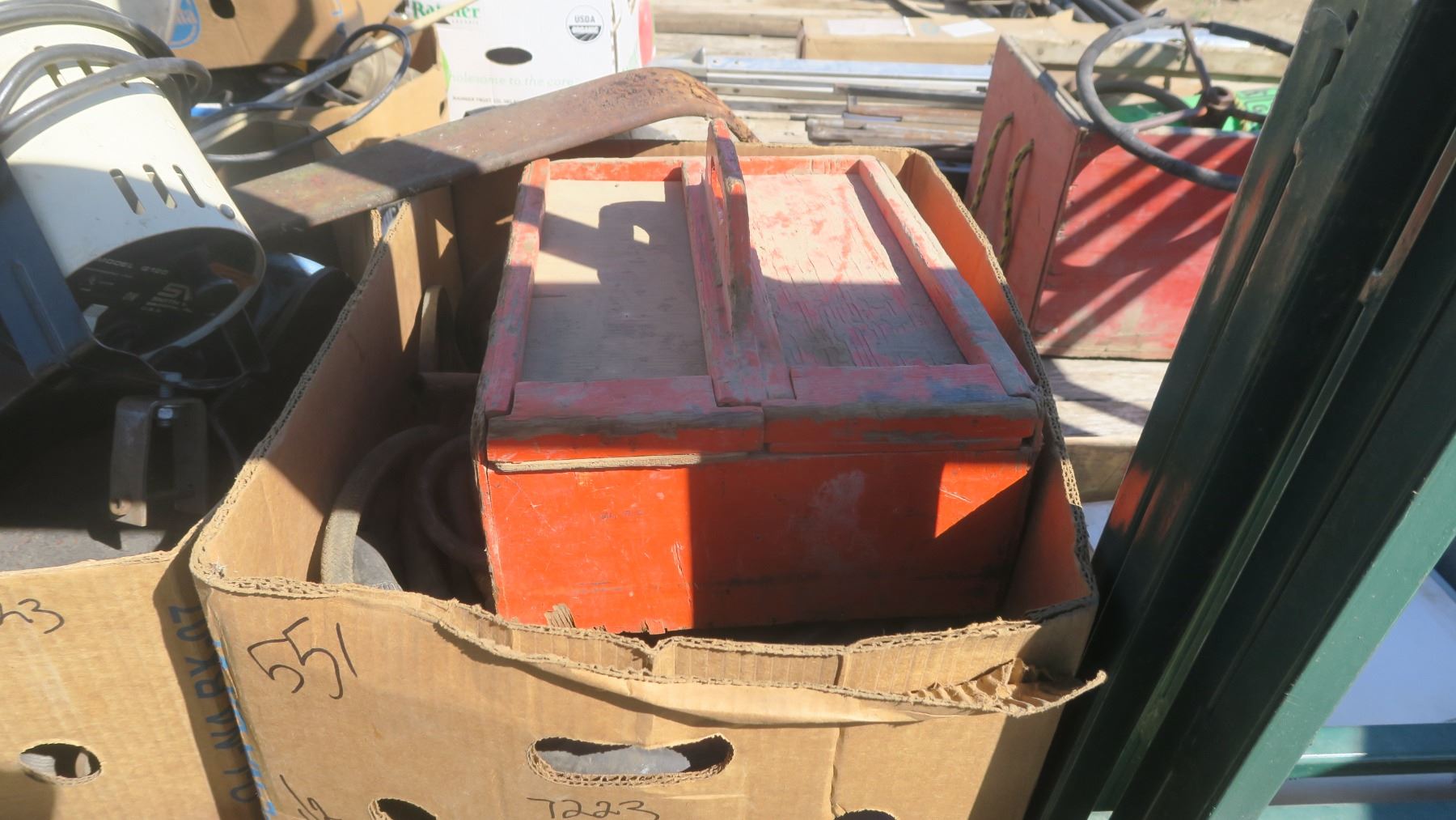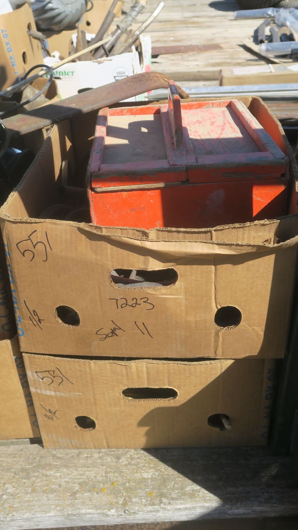 2 boxes of misc. metal bolts, large tow hooks, hose's, wood box