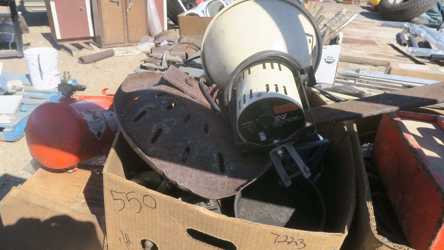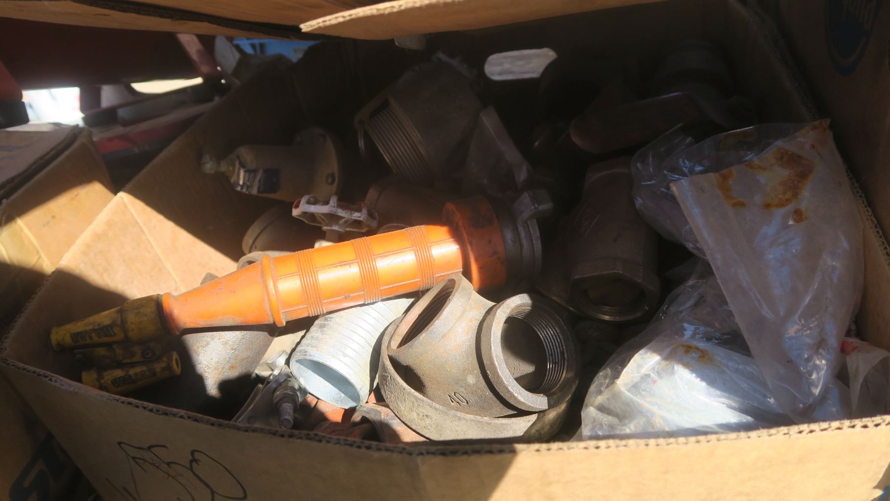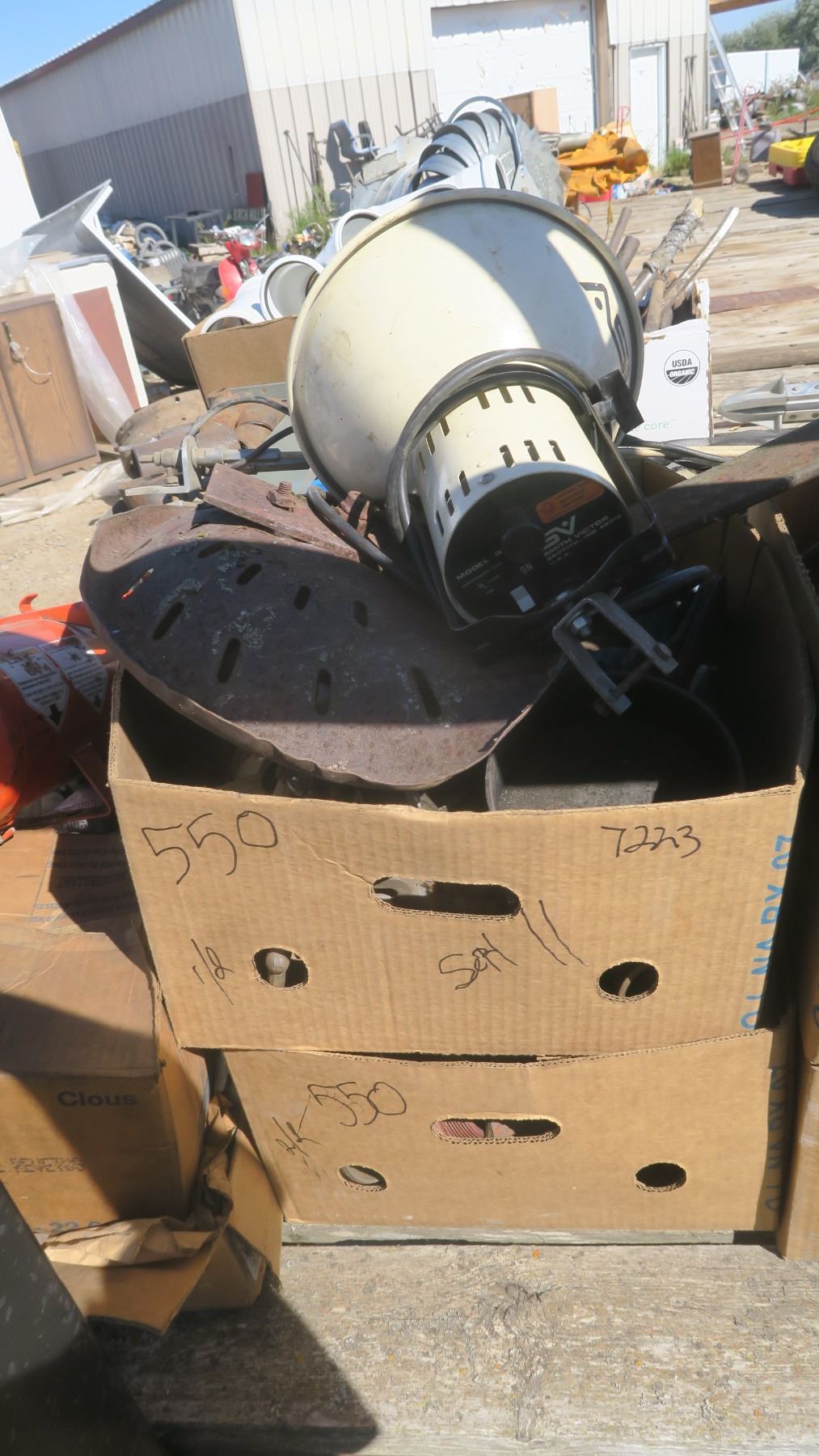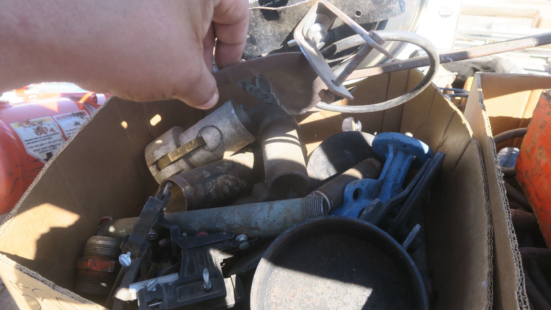 2- boxes of misc. metal pipe parts, tractor seat, light, 2 CB whips