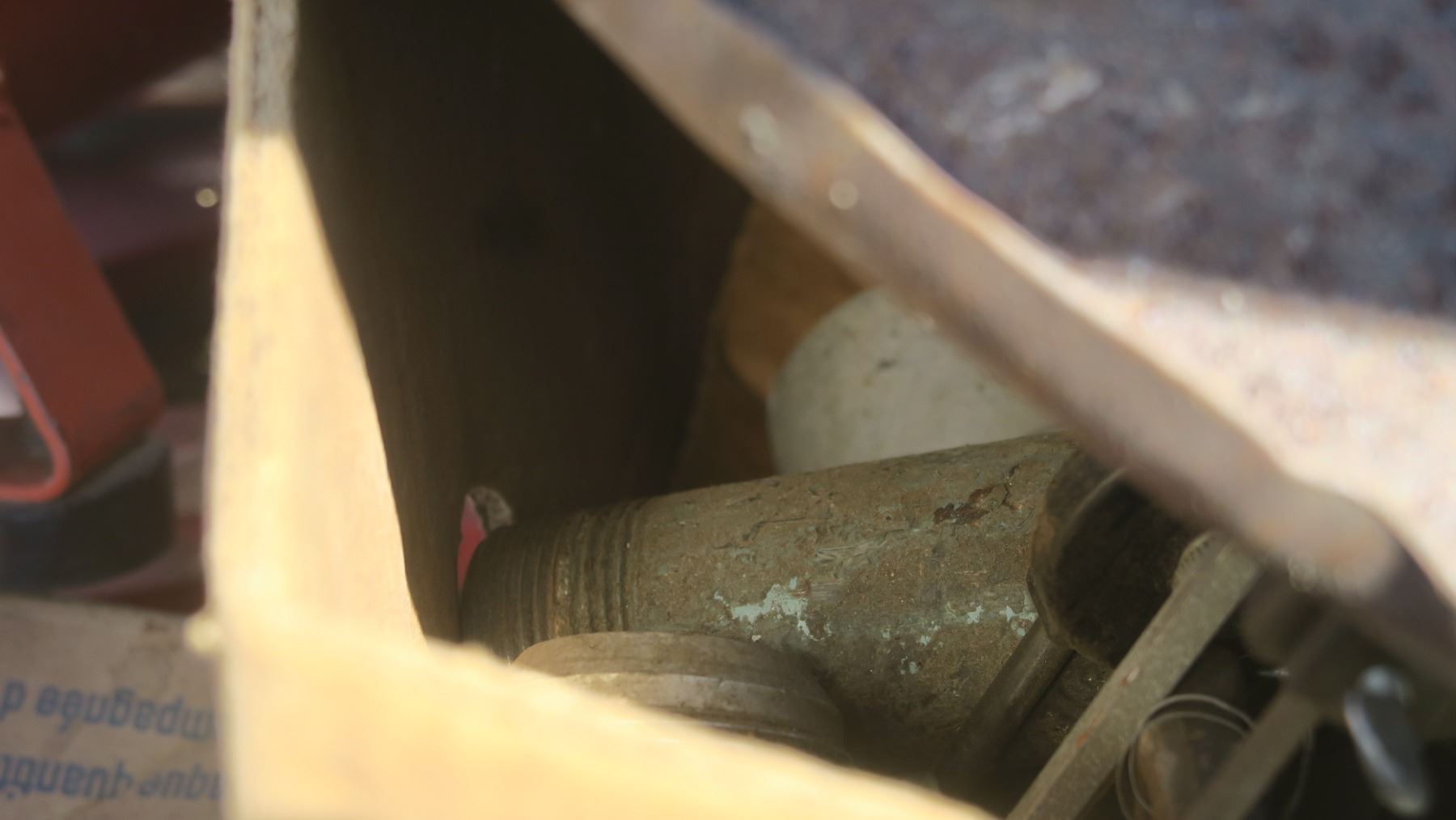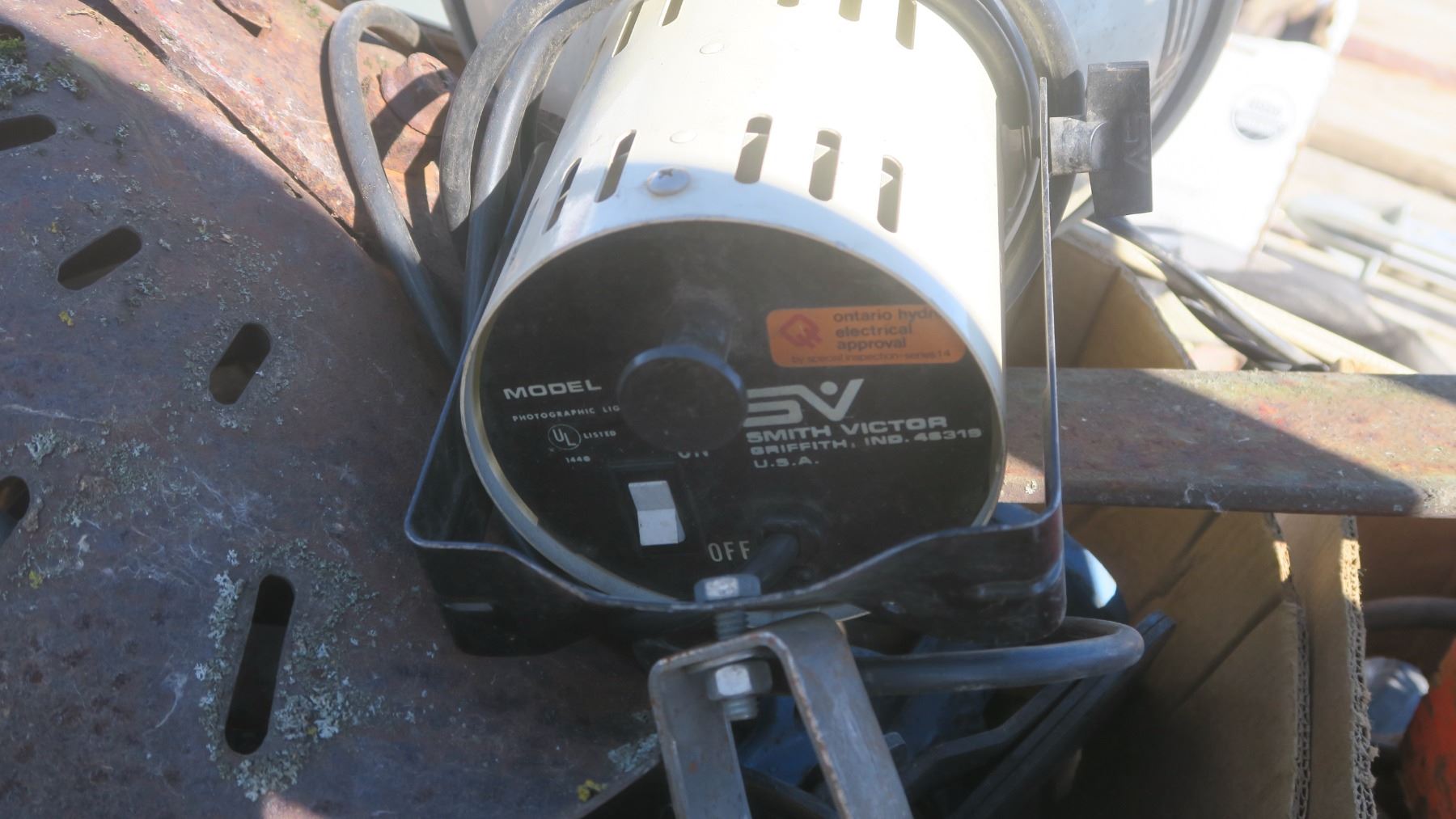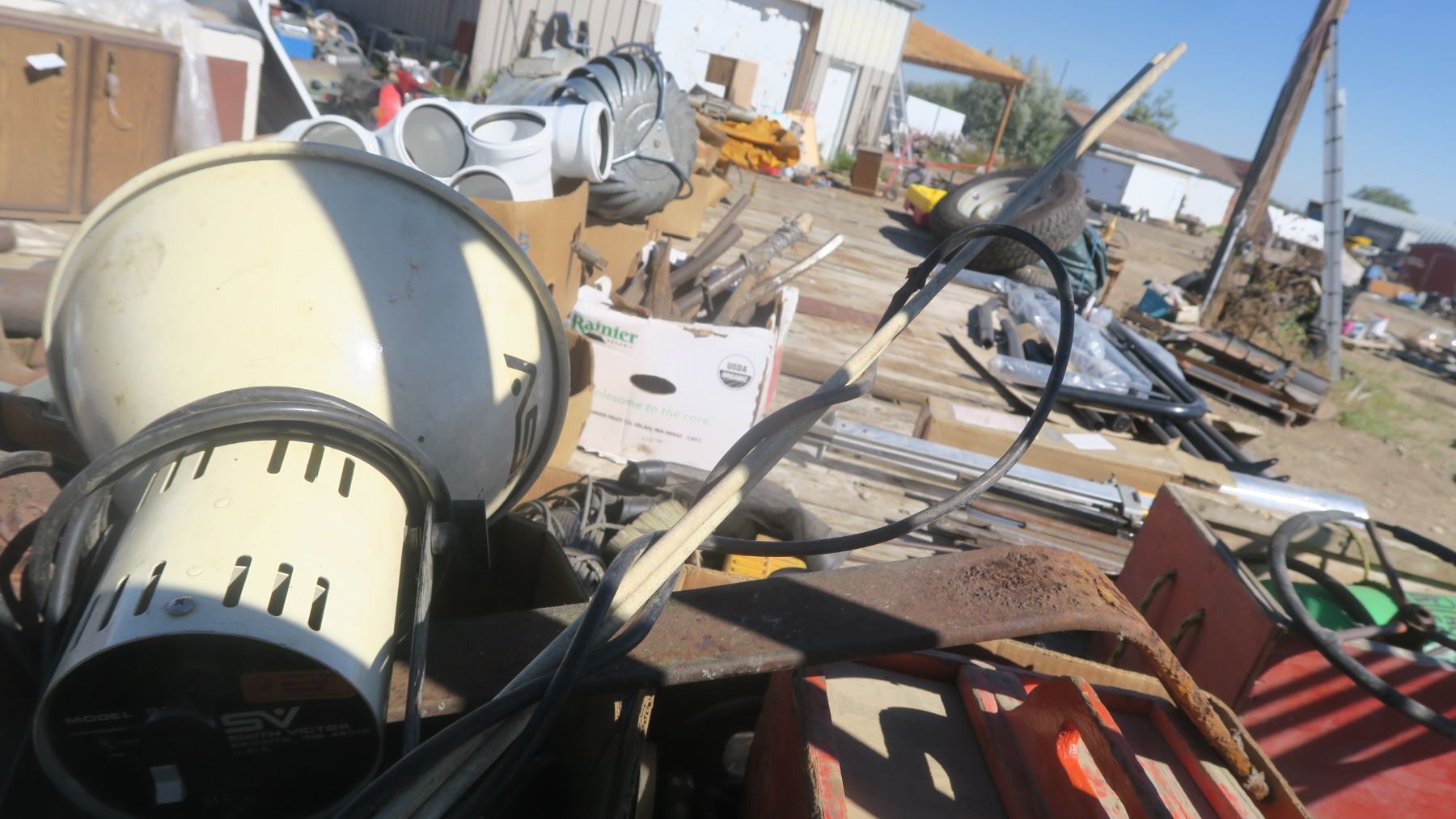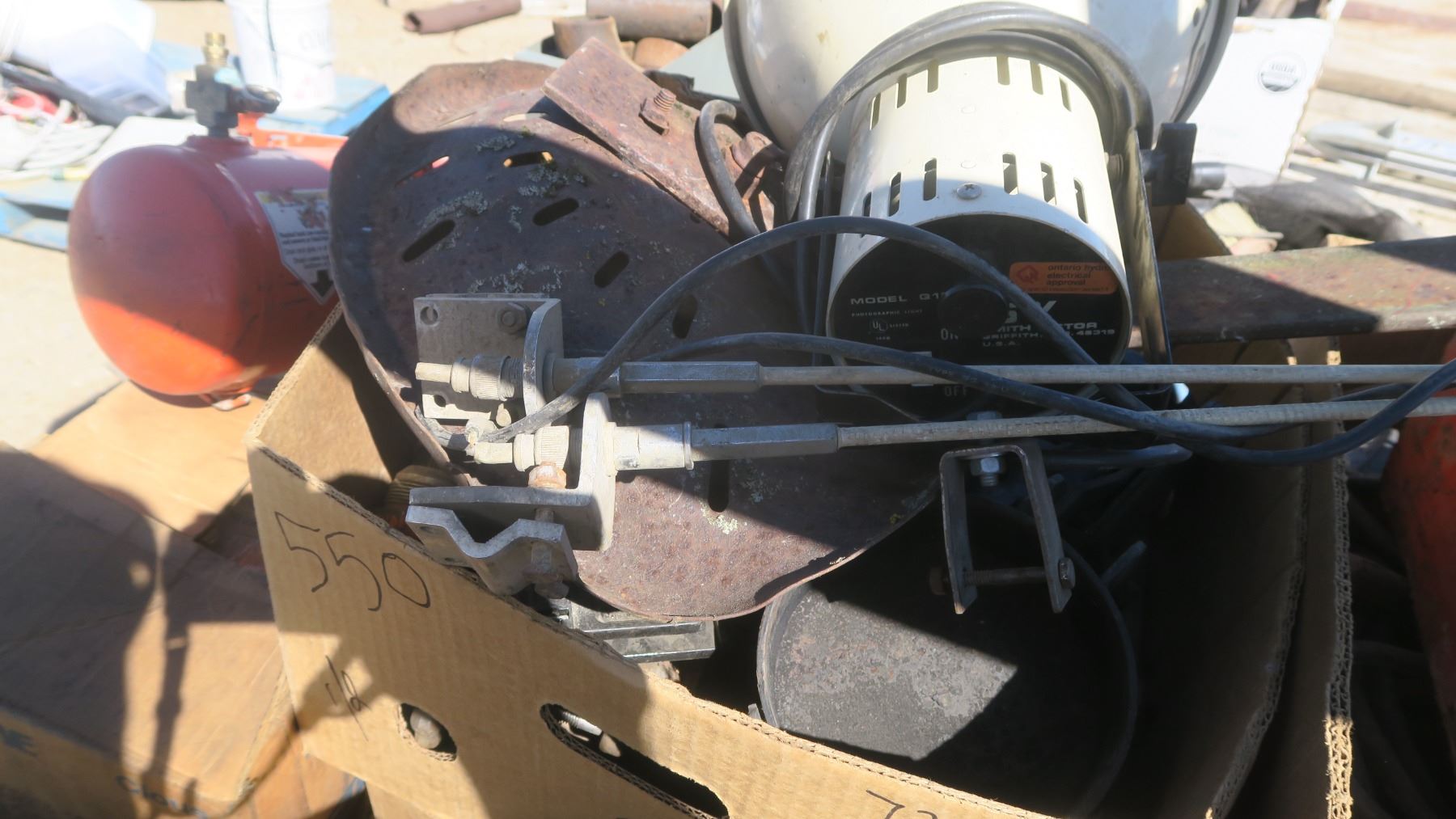 2- boxes of misc. metal pipe parts, tractor seat, light, 2 CB whips