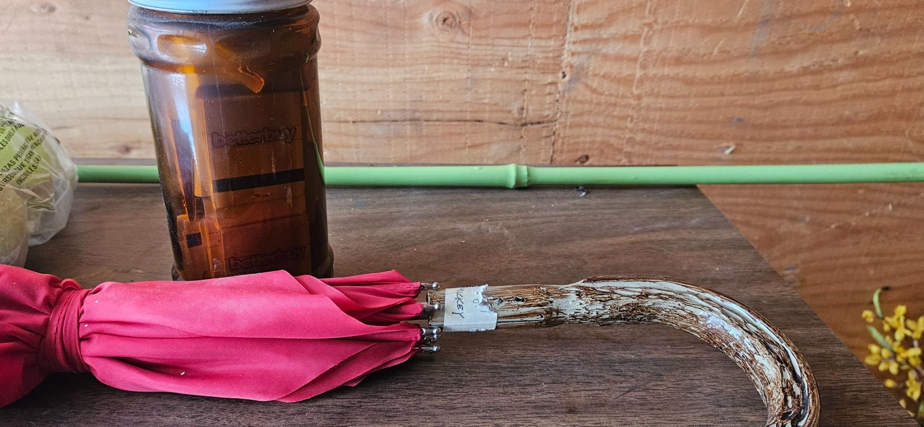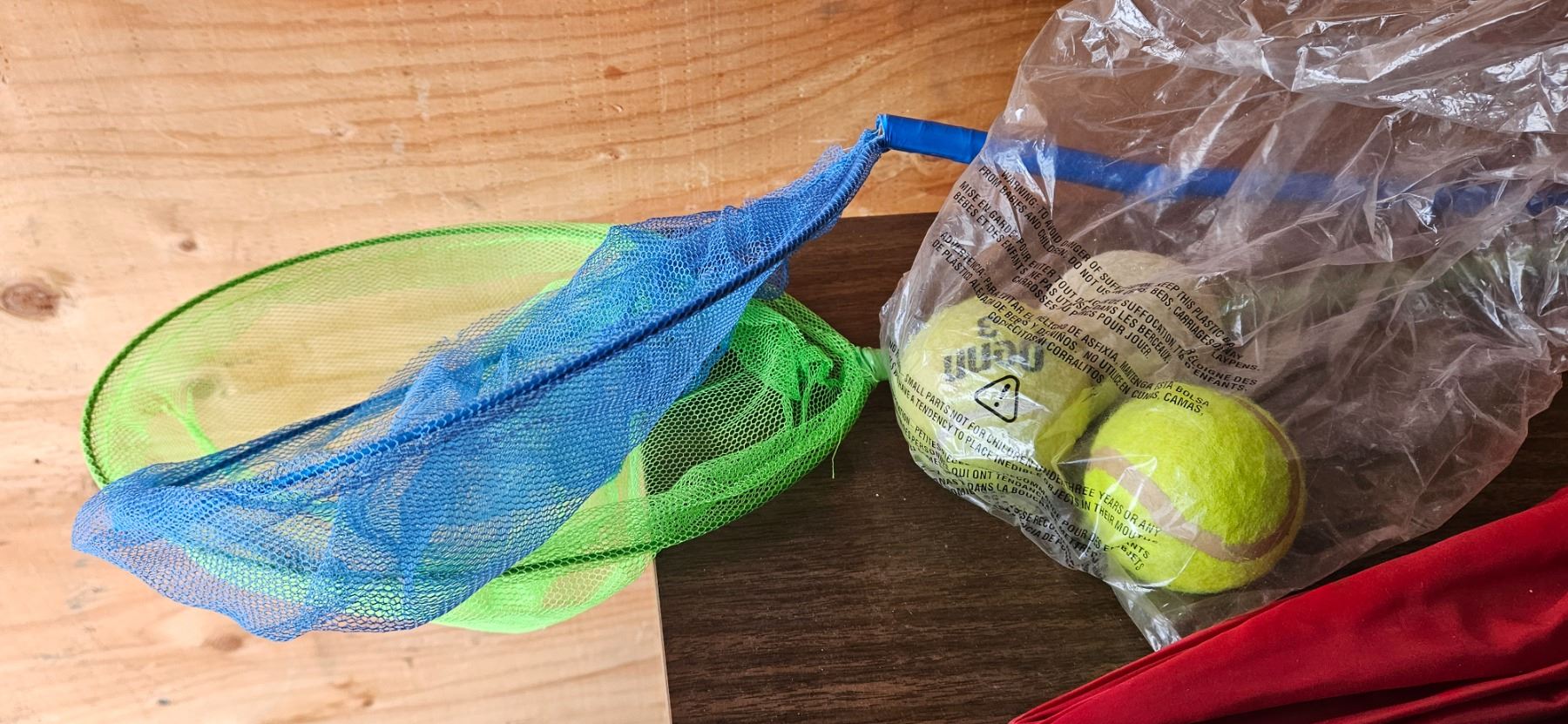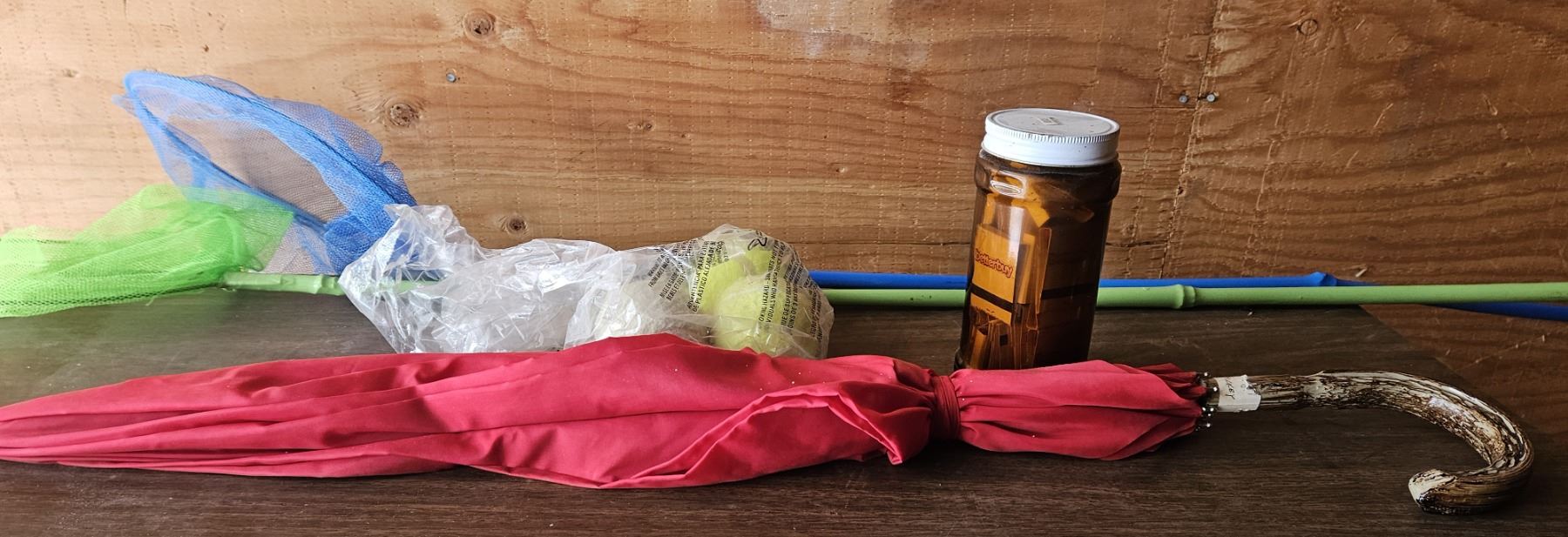 2 butterfly nets, umbrella with wood handle, jar of matches and 3 tennis balls