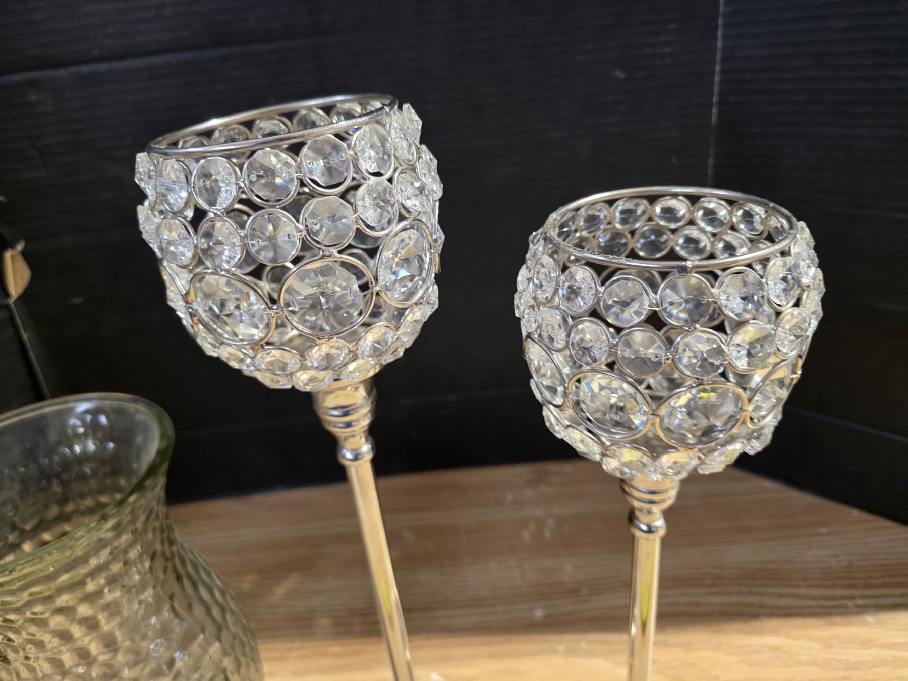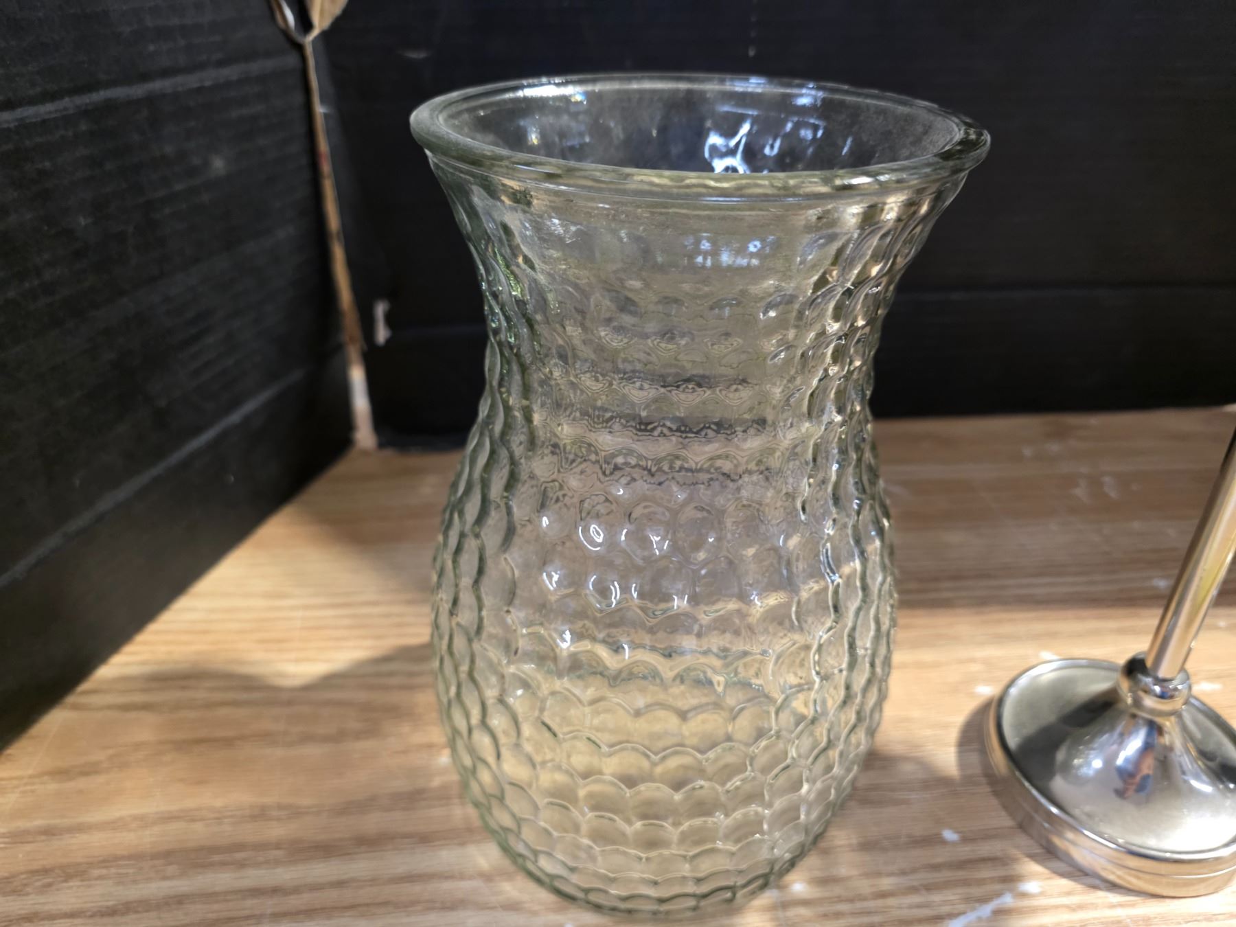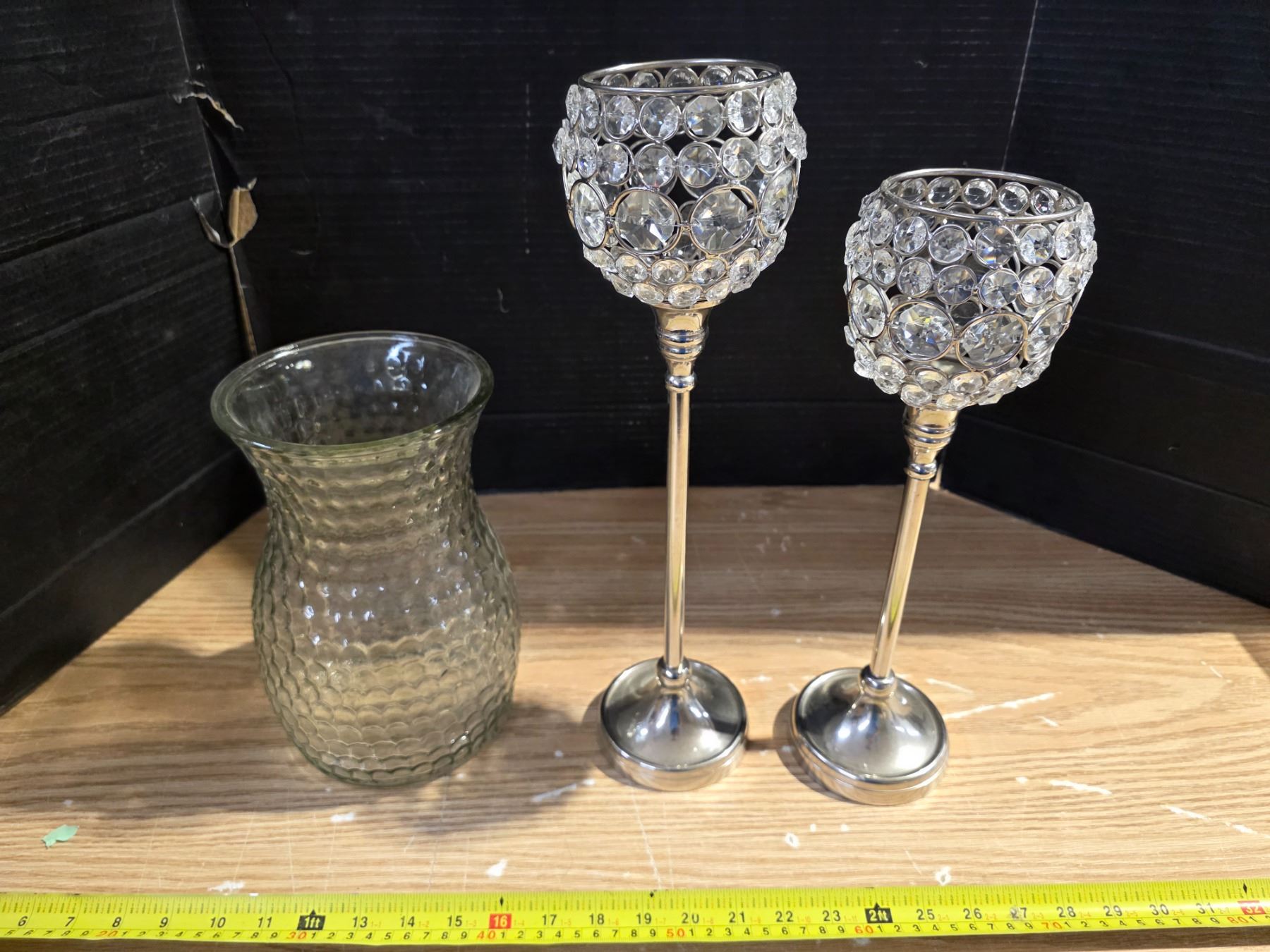 2 candle holder and glass vase- candle hoder are- 16"H and 14"H, vase is 12"H