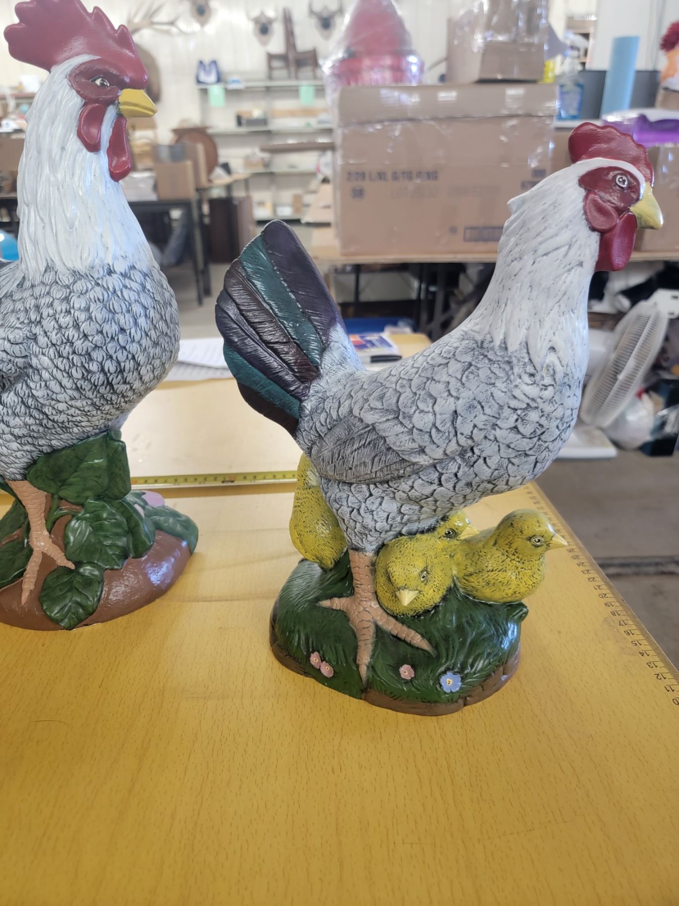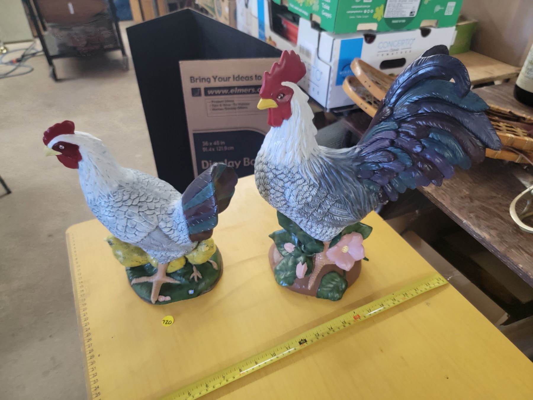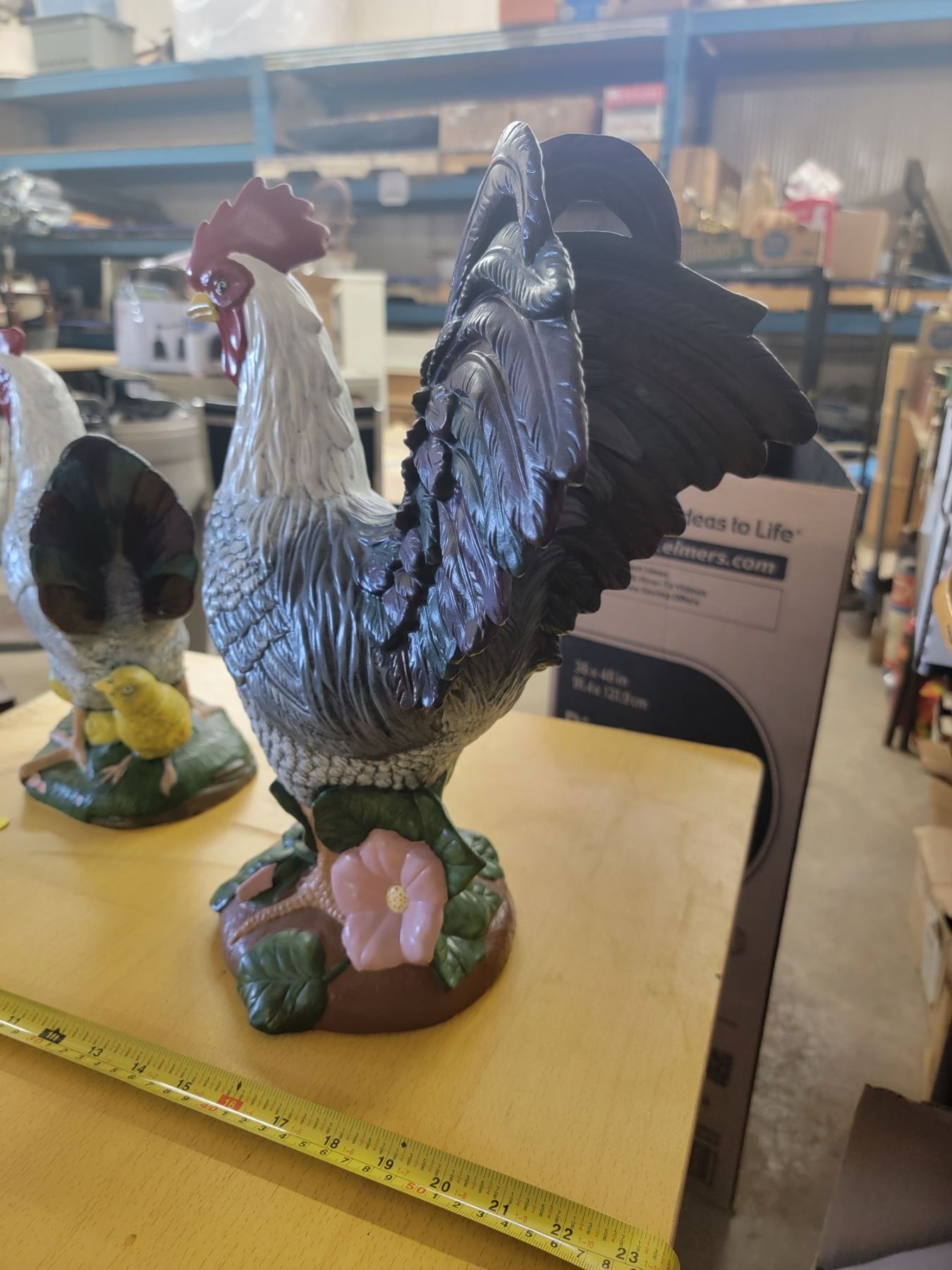 2 ceramic chickens hand painted, very well done 16" + 12"