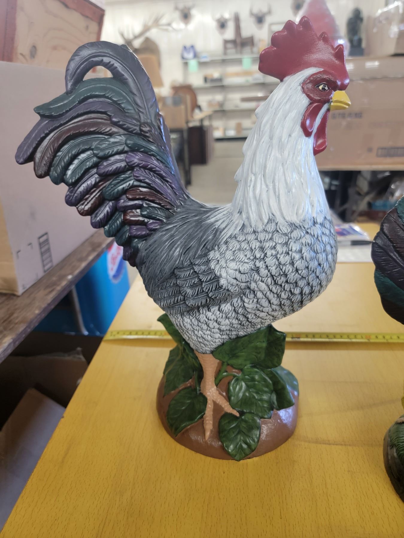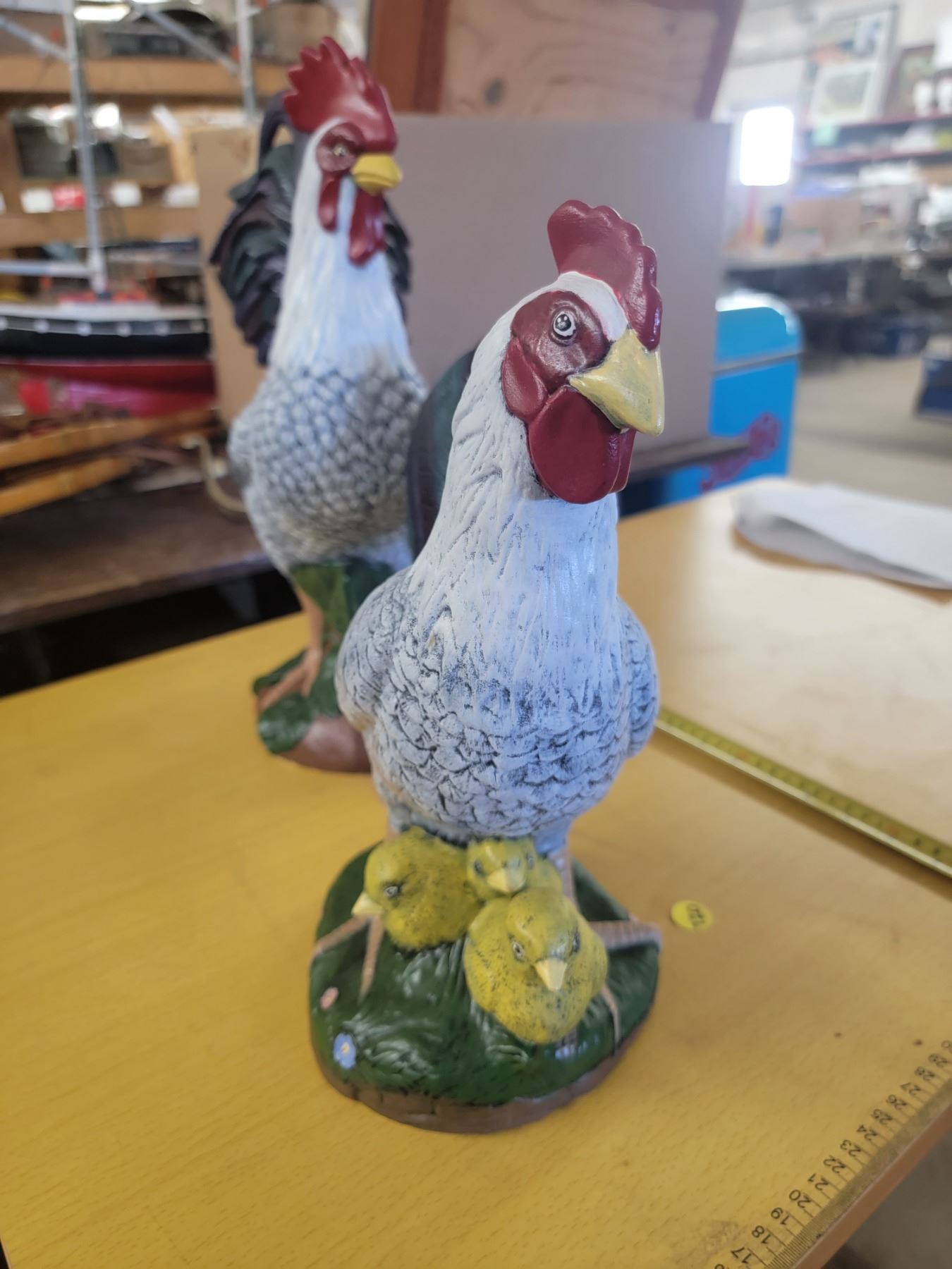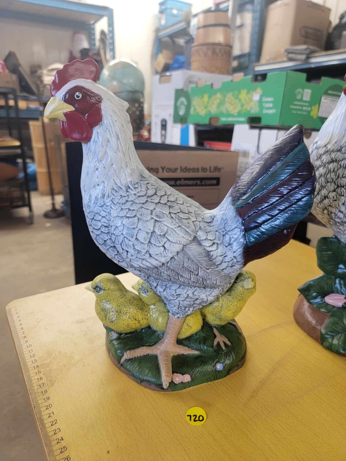 2 ceramic chickens hand painted, very well done 16" + 12"