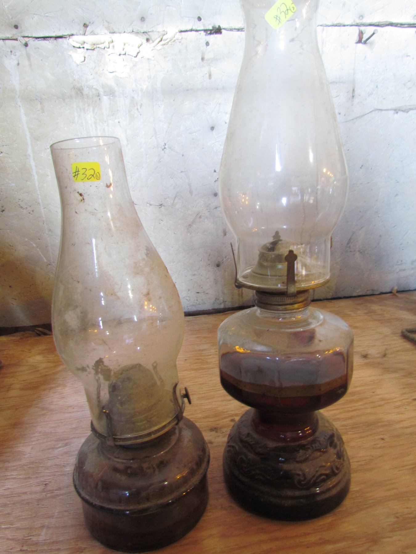 2 clear glass oil lamps (oil in them)