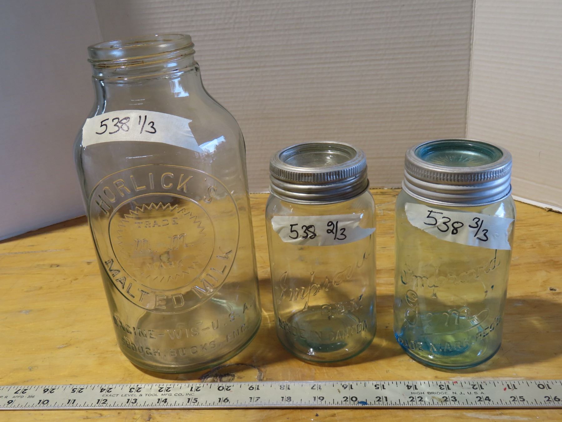 2 green 1 quart sealers and 1 large horlicks milk jar