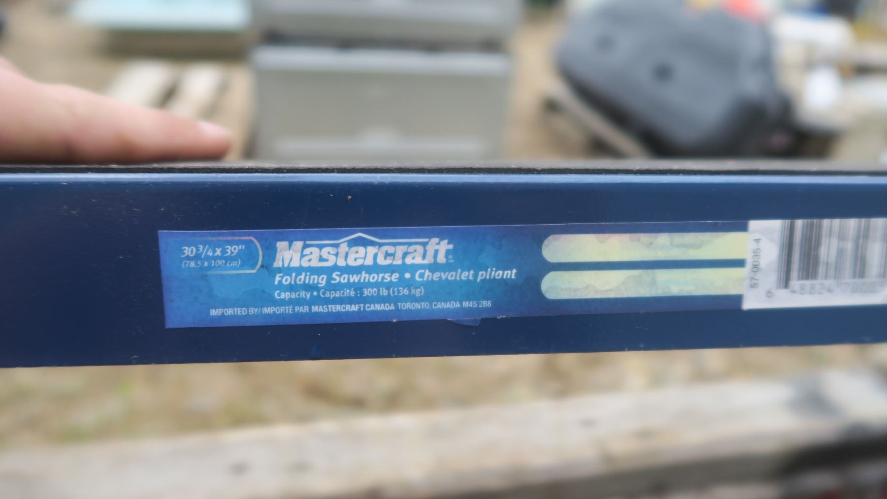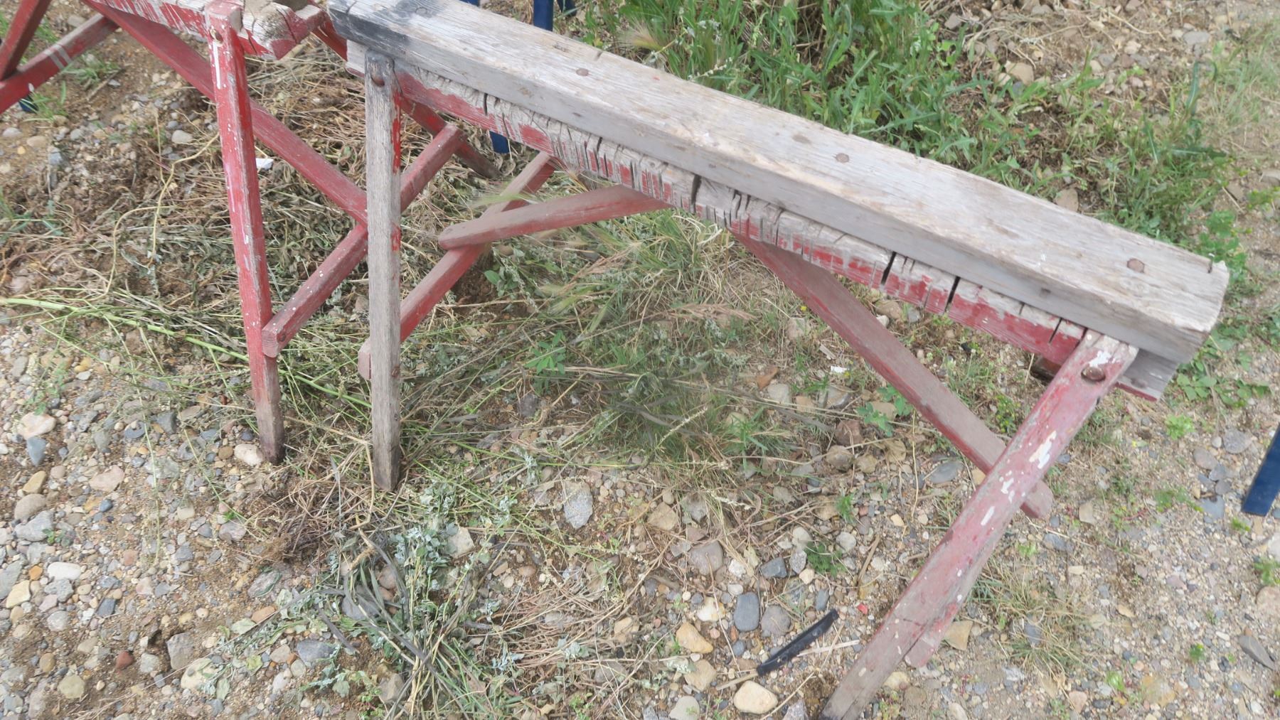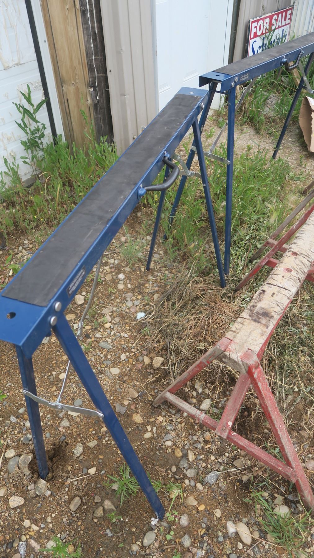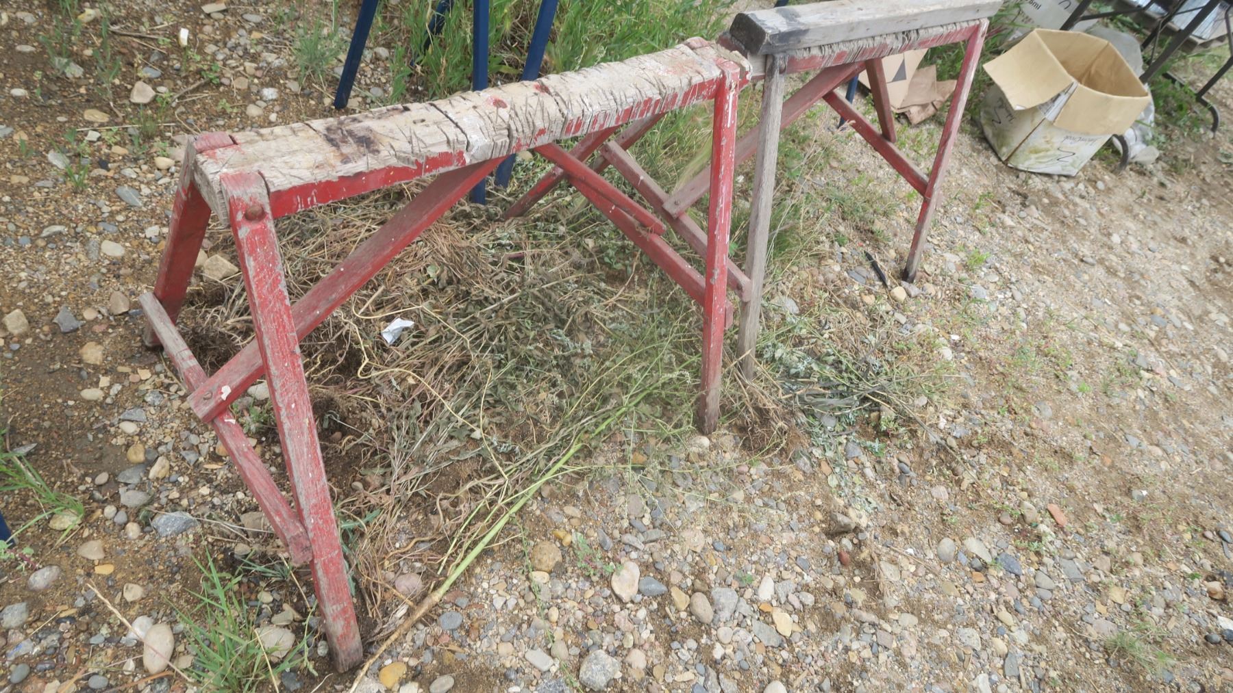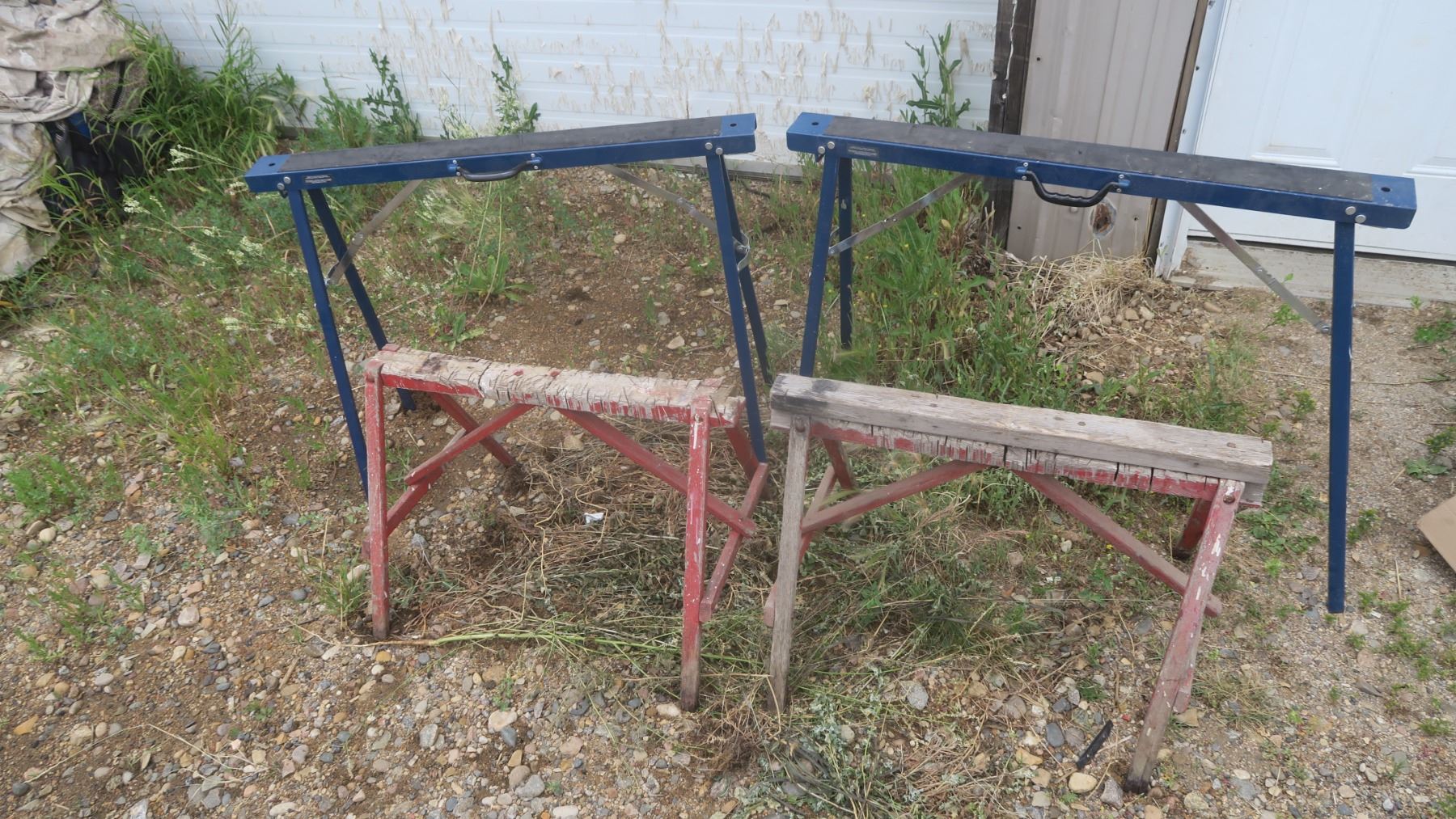 2 metal Mastercraft sawhorses and 2 primitive wooden sawhorses
