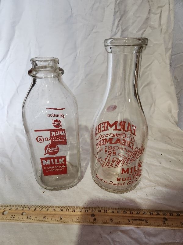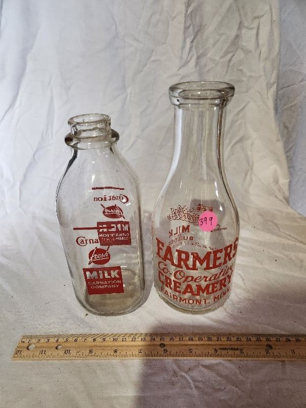 2 milk bottles(Carnation milk company and farmers coop creamery Fairmont Minnesota)