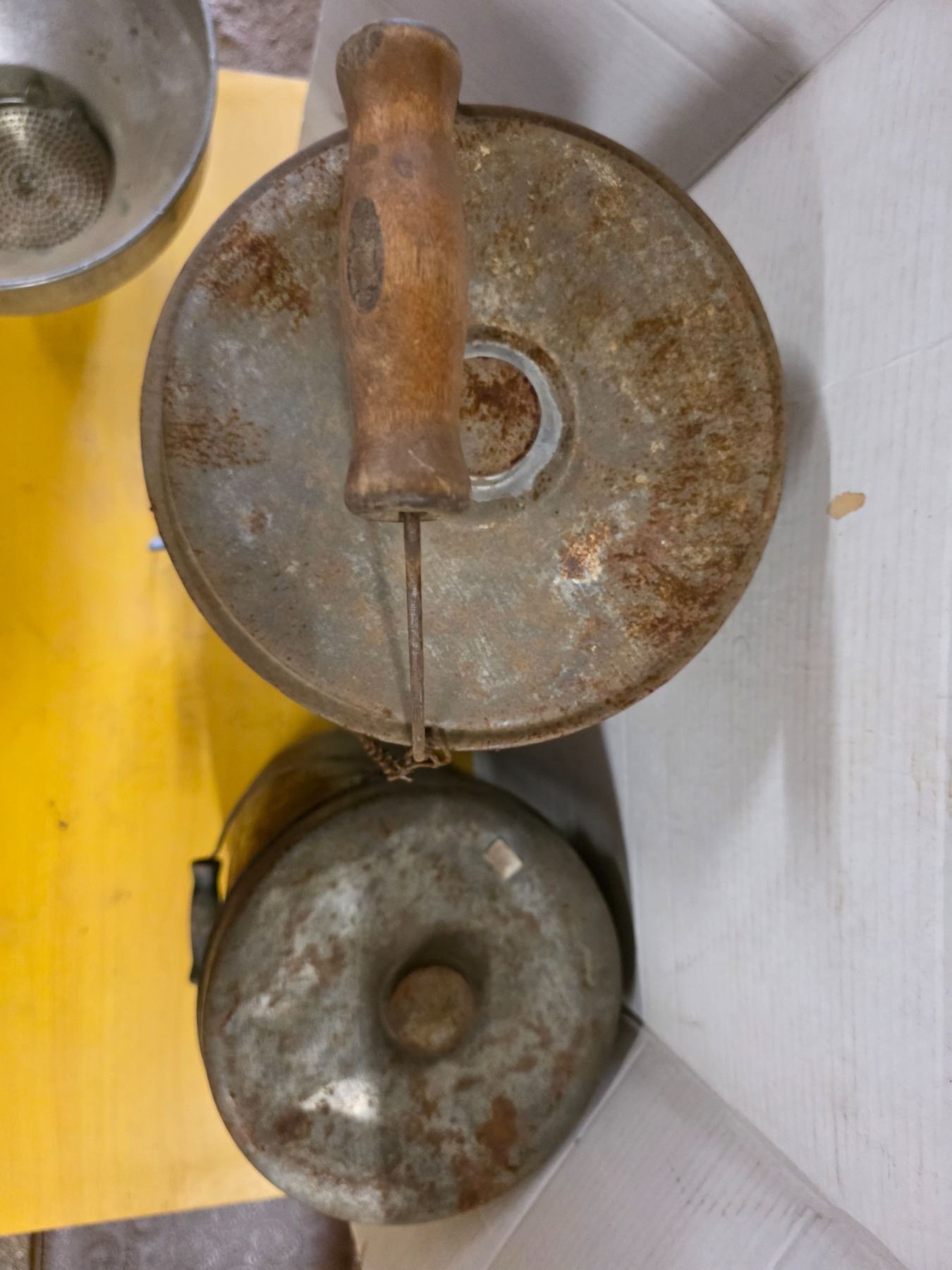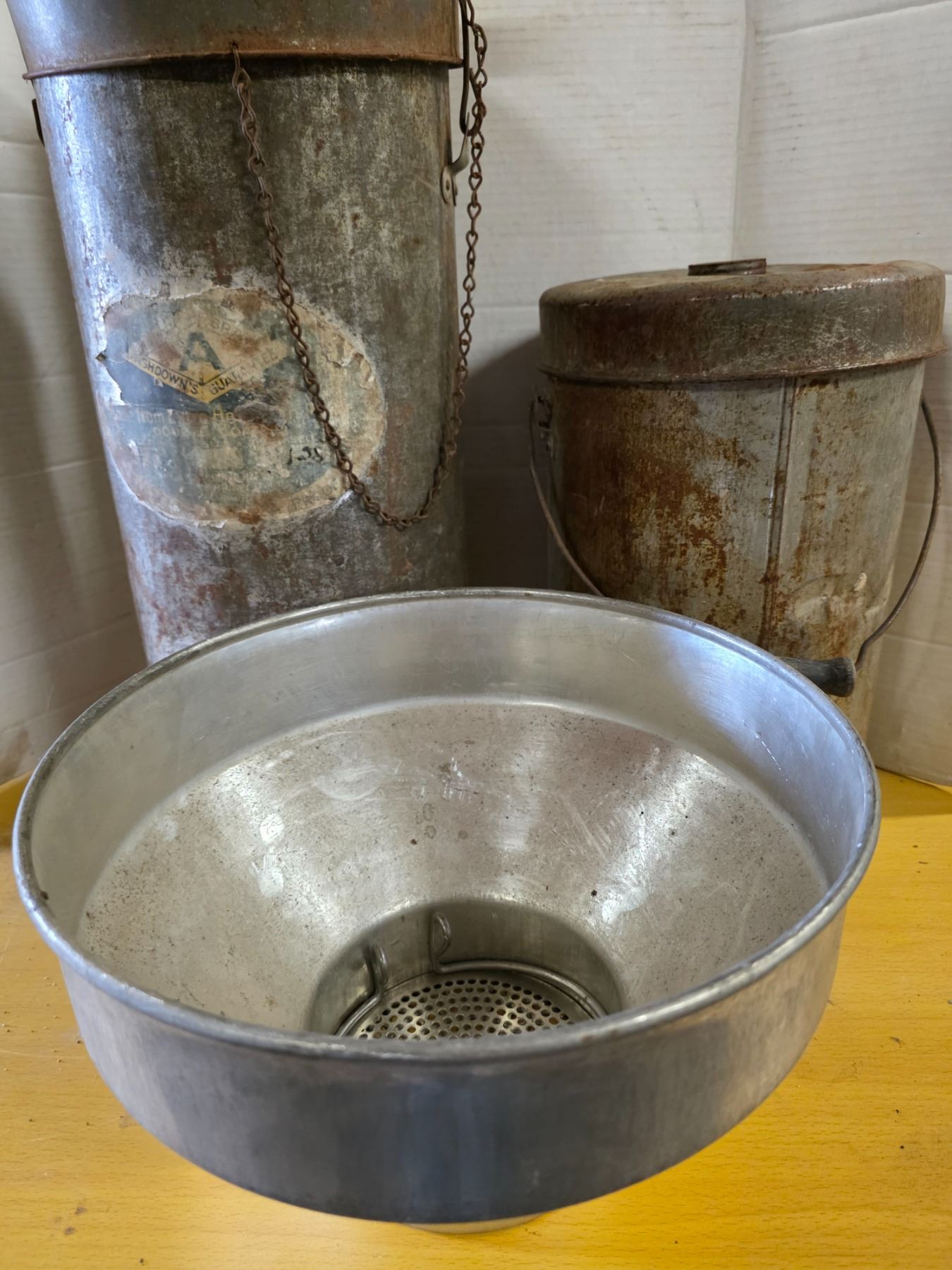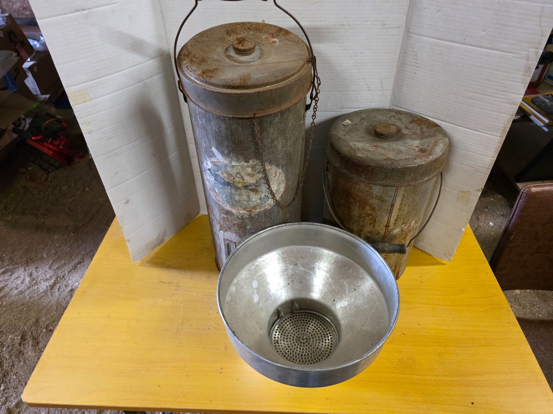 2 milk cans and milk strainer- 2 gallon and 3 gallon