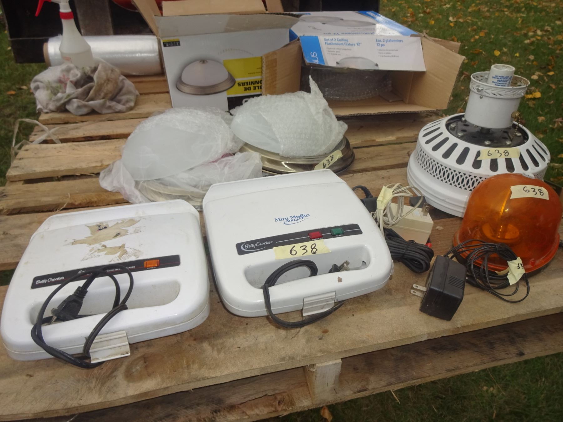 2 new sets of 12" ceiling fixtures, 2 electric muffin makers, yellow emergency light