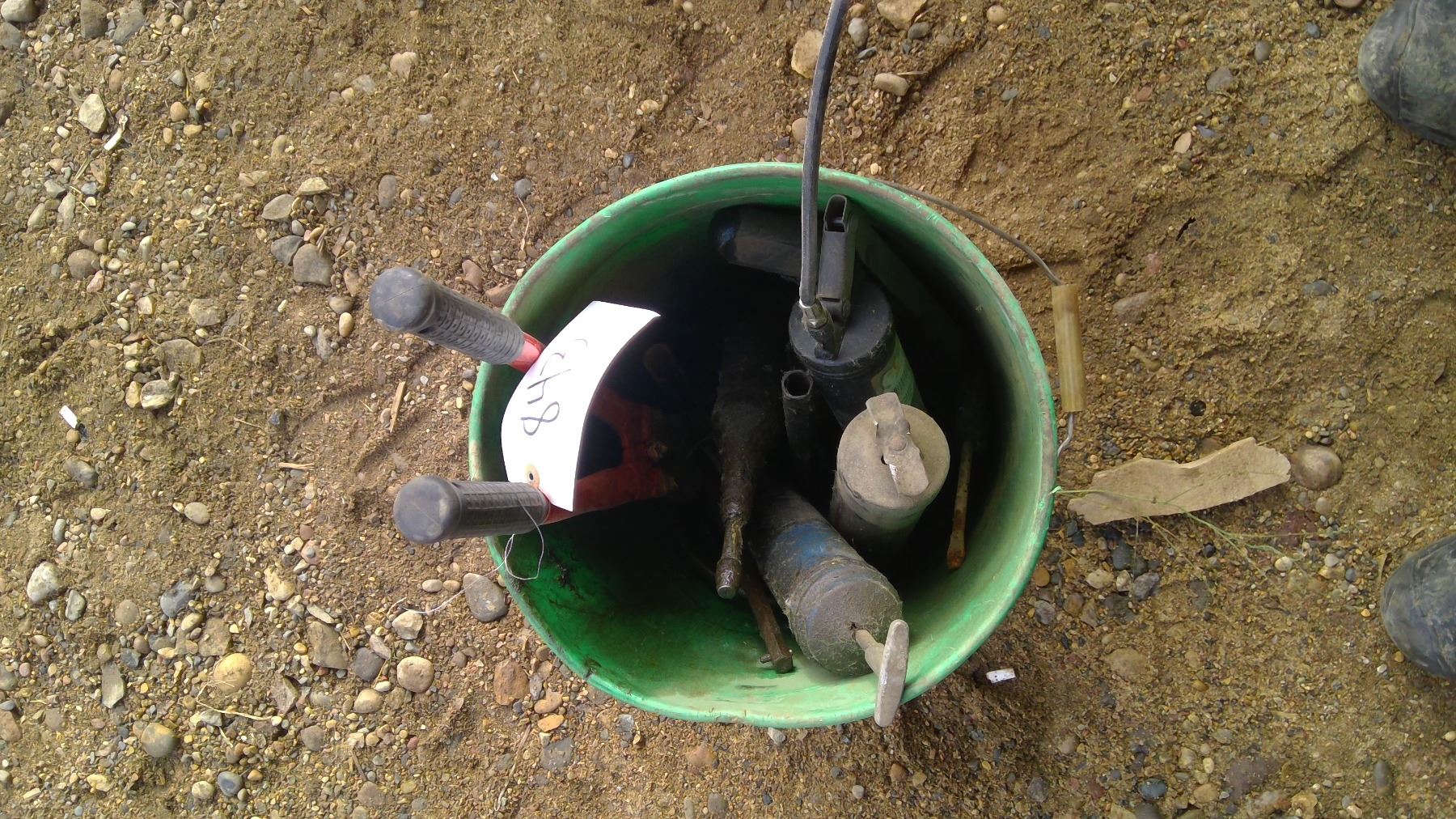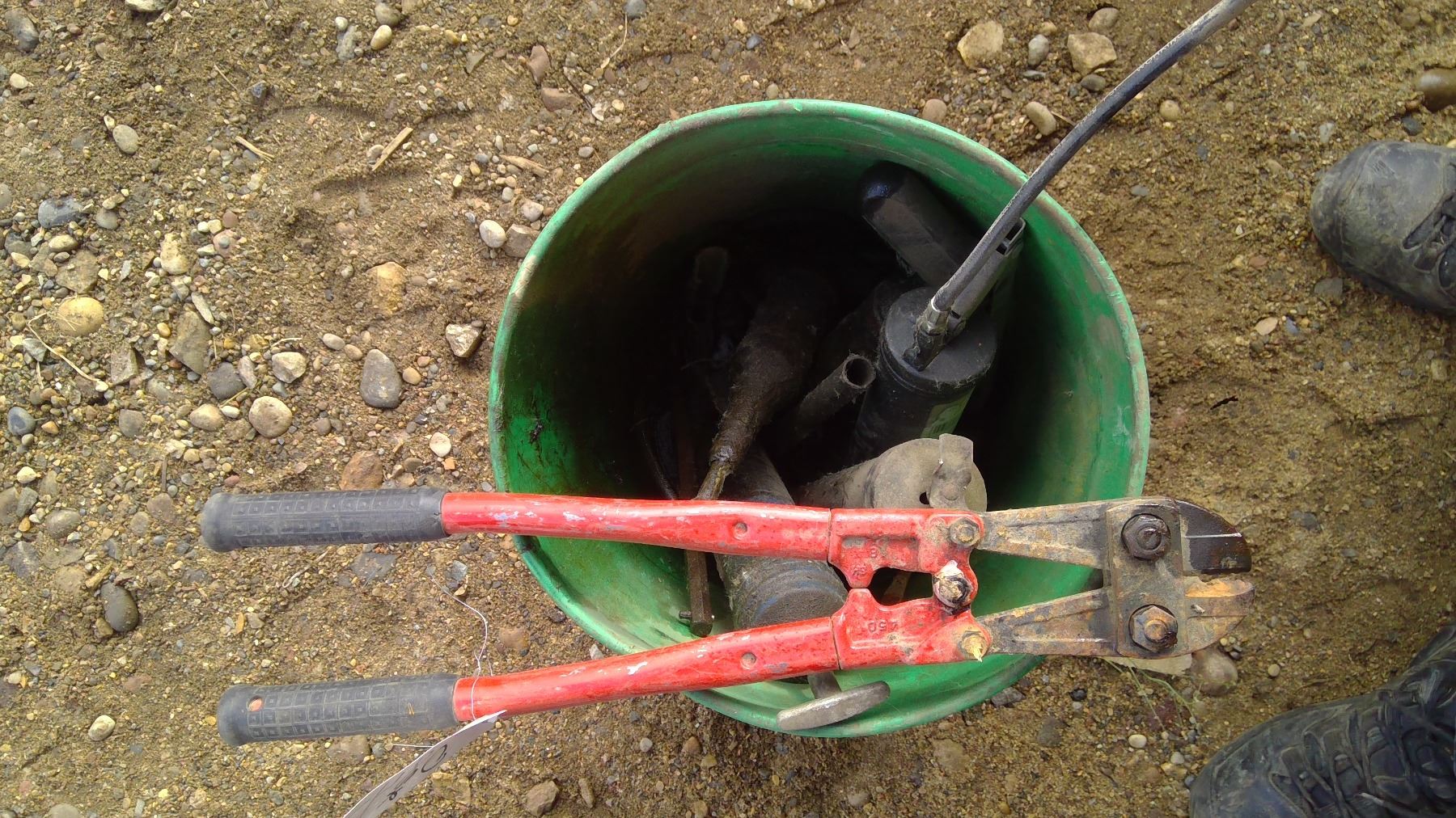 2 pails with grease guns and bolt cutters