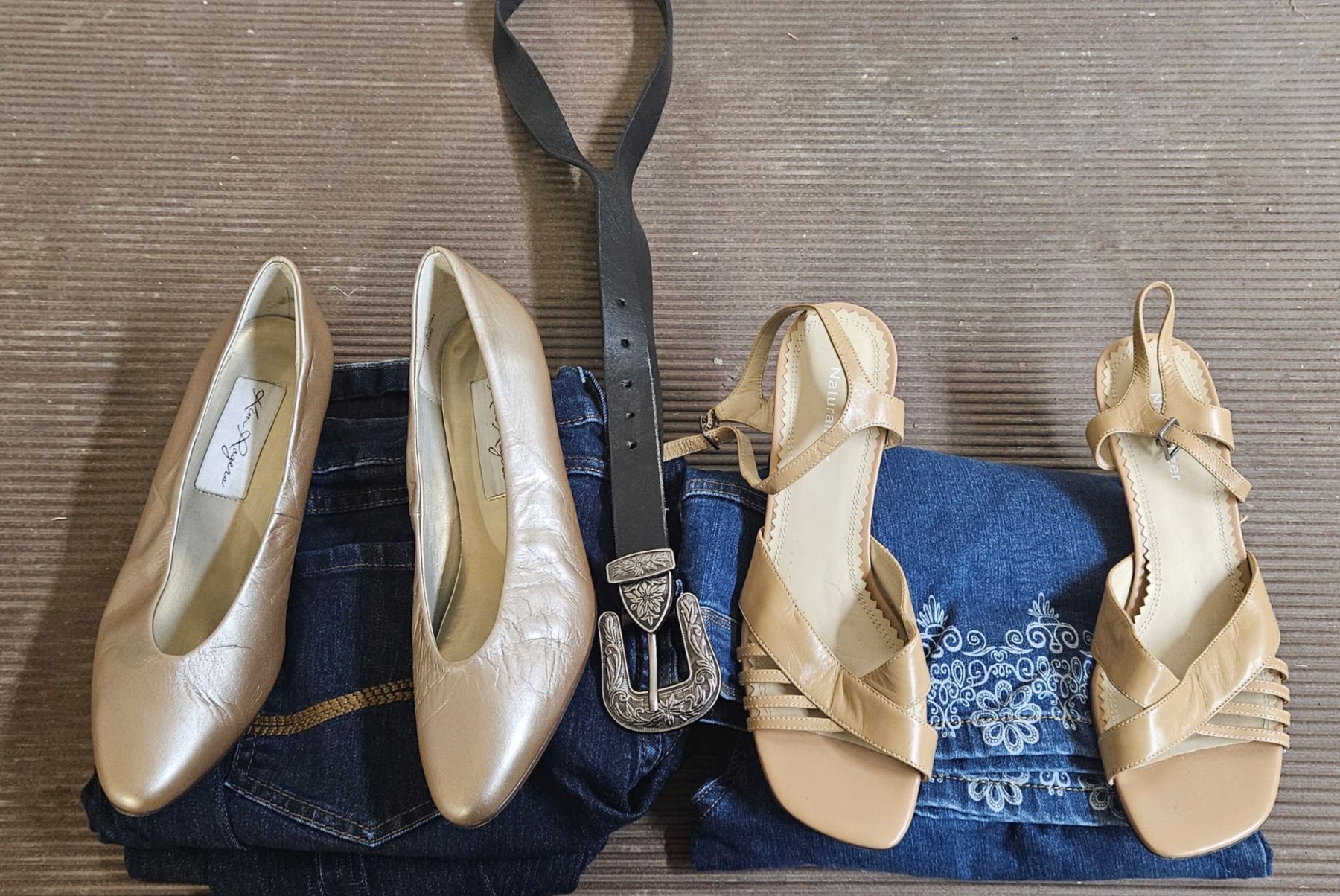 2 pairs of ladies jeans, 2 pairs of womens shoes and a belt