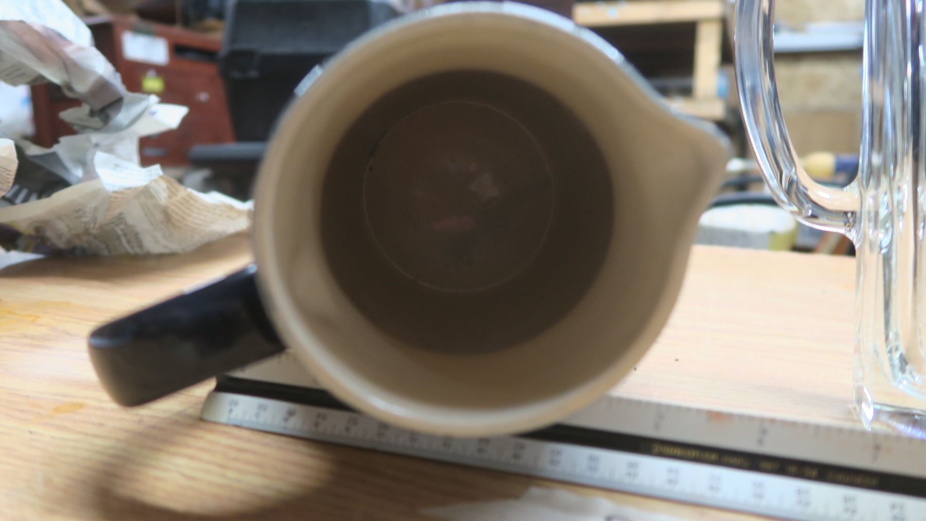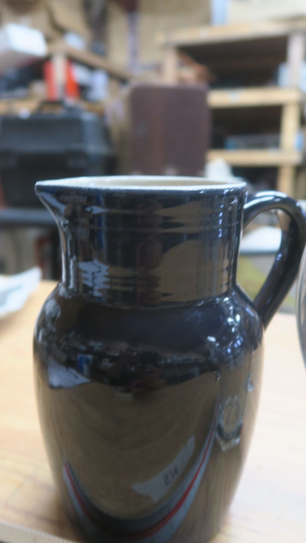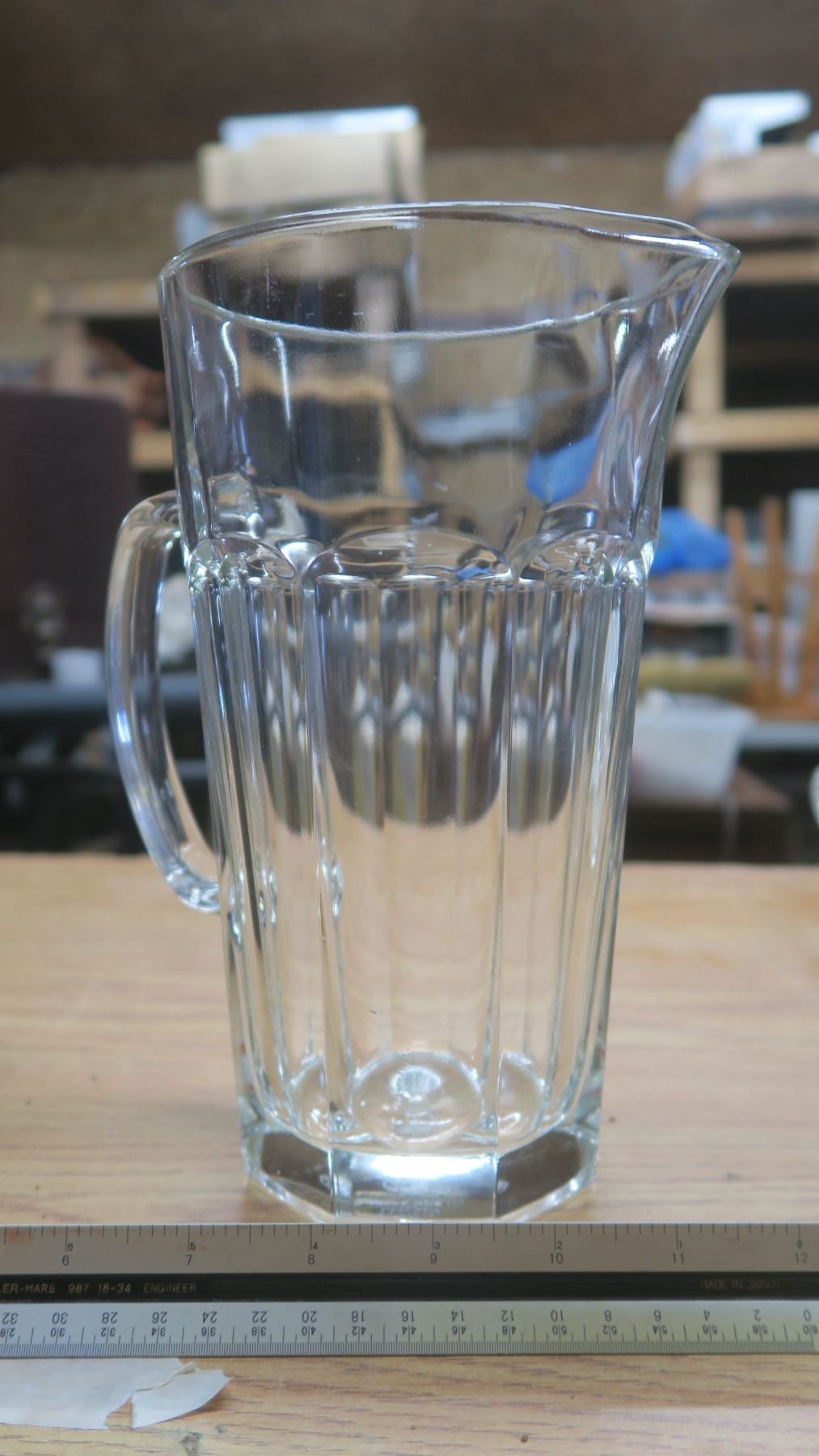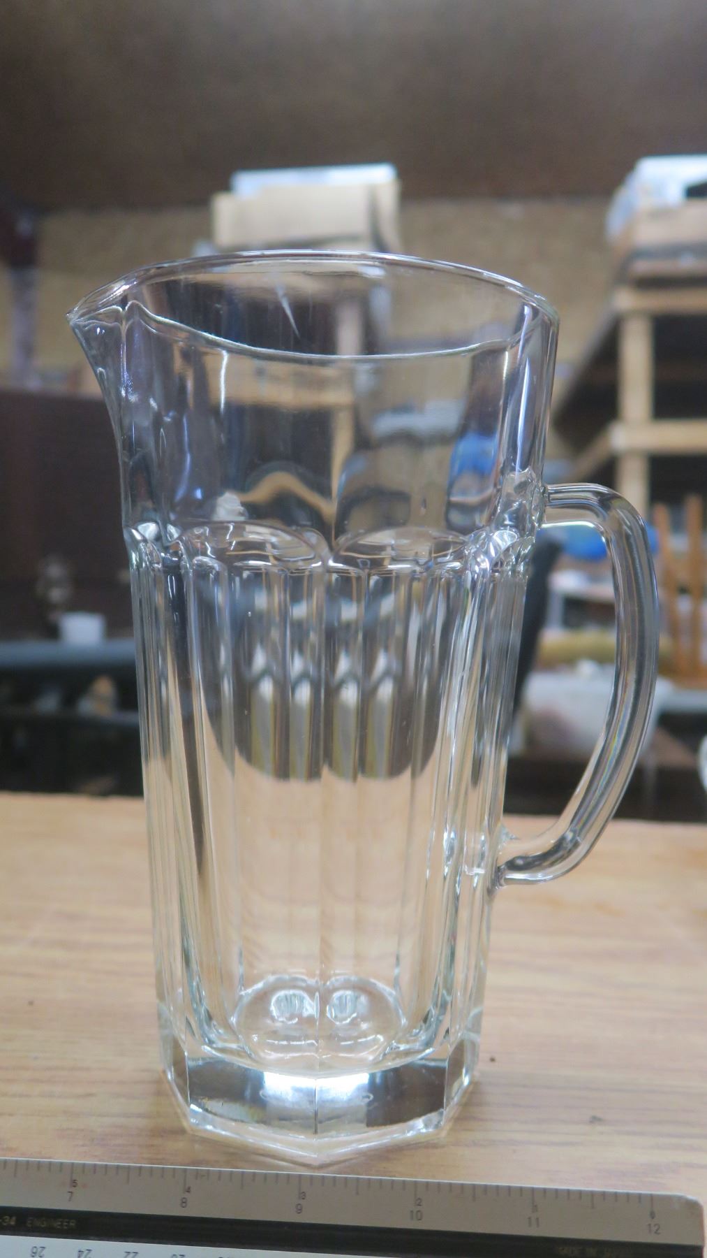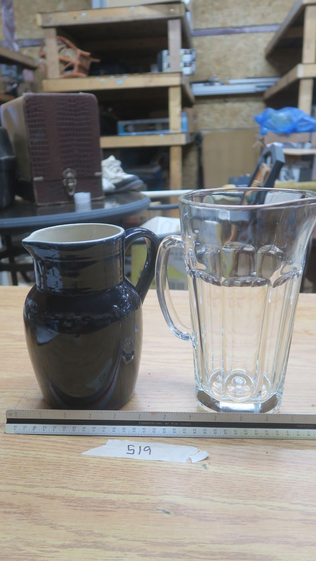 2- pitchers. 1-black ceramic, large glass pitcher.