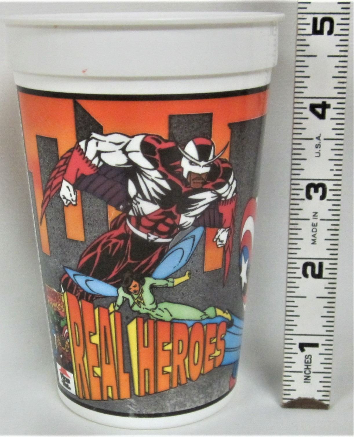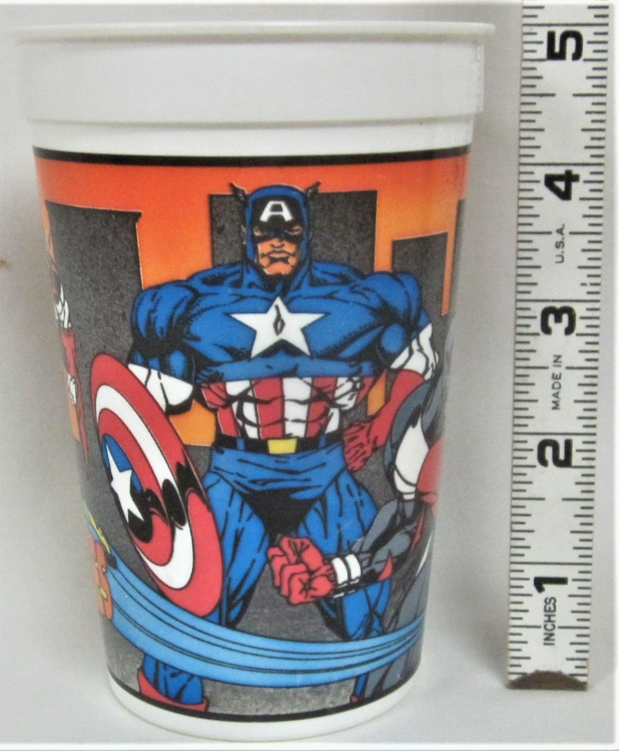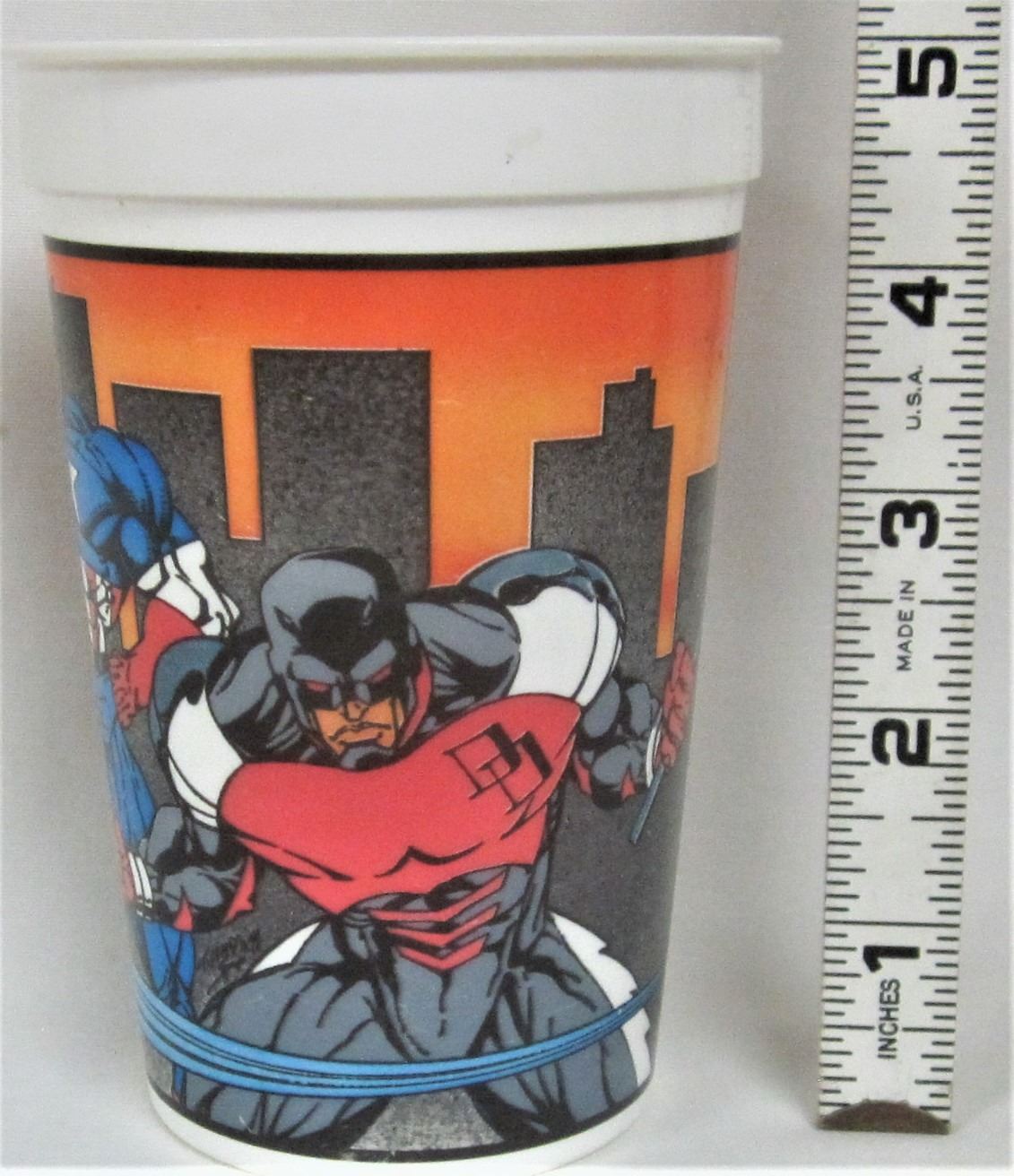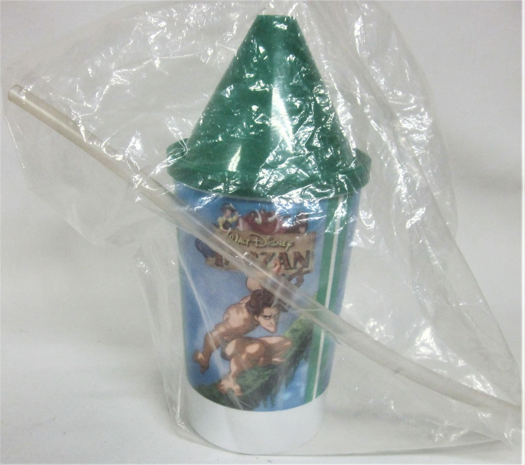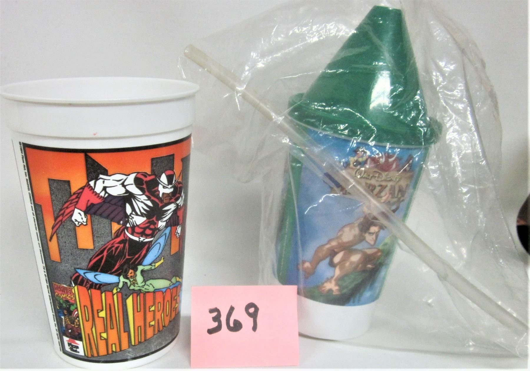2 plastic souvenir cups -1994 pizza hut-marvel comics real heroes + new Tarzan sipping cup/plastic straw and lid