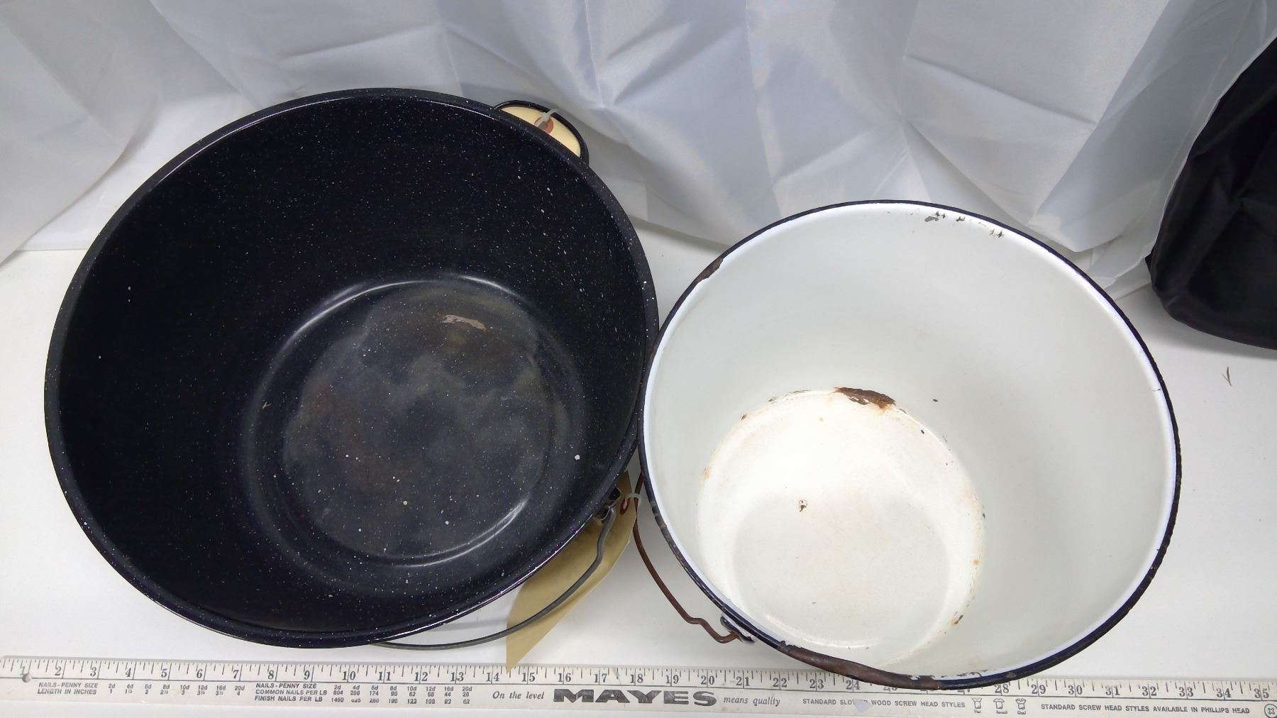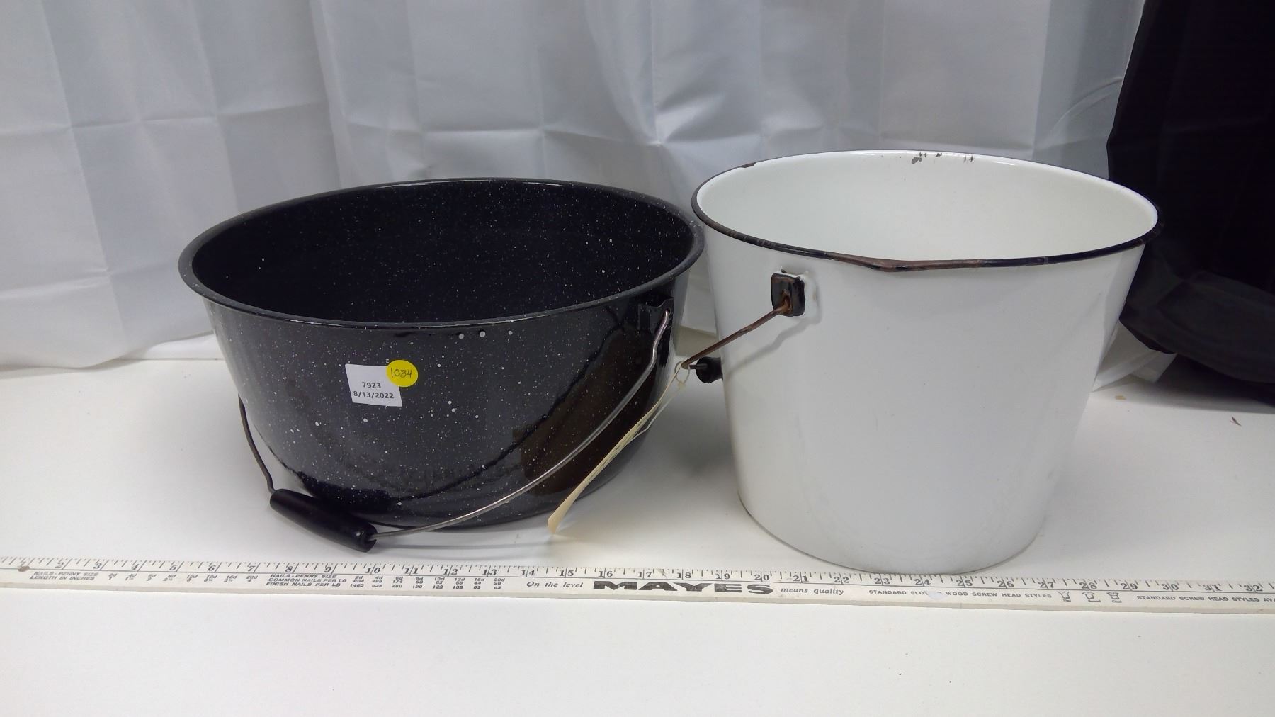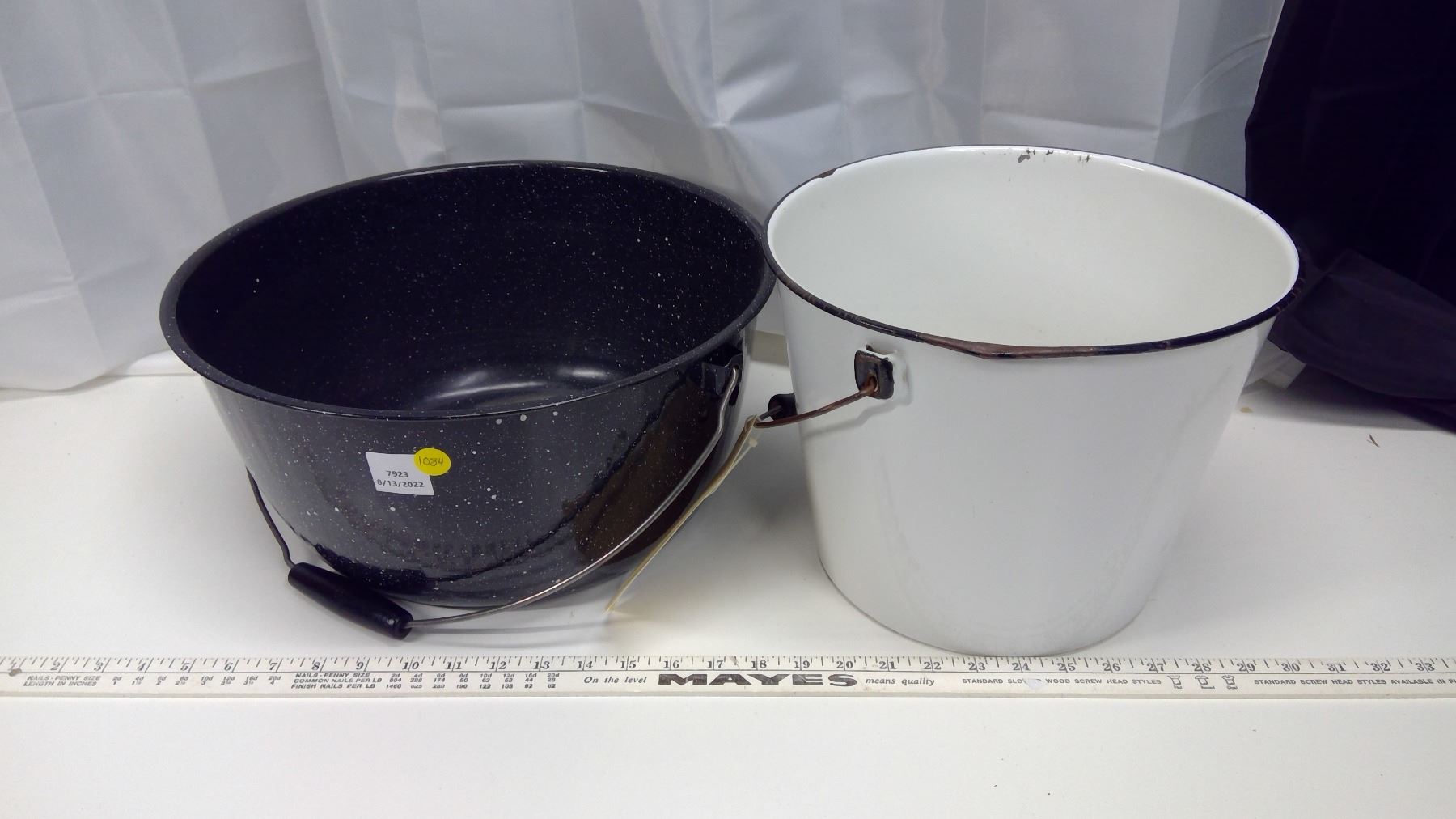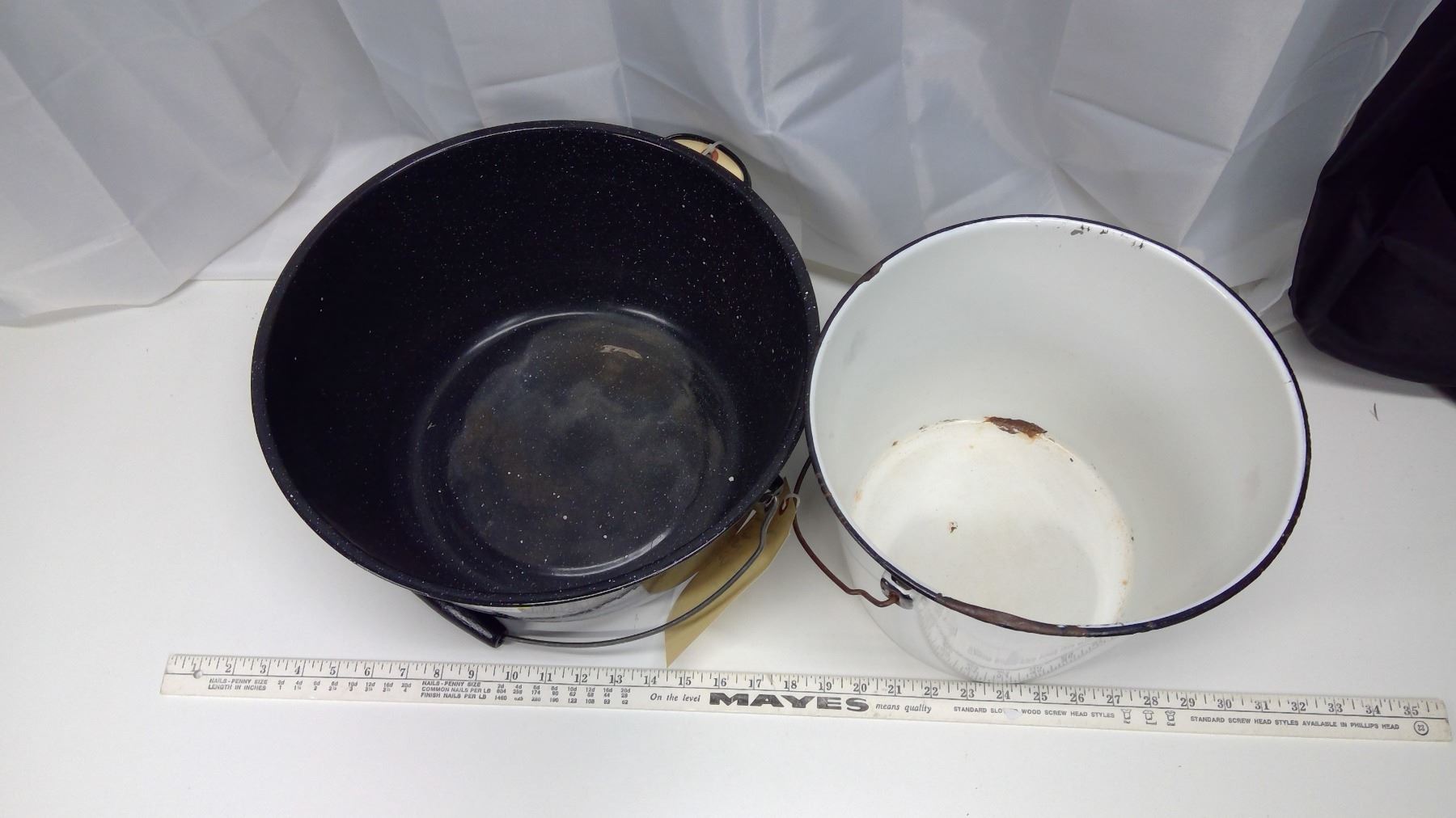2 porcelain pails – 1 white, 1 blue w/white speckle