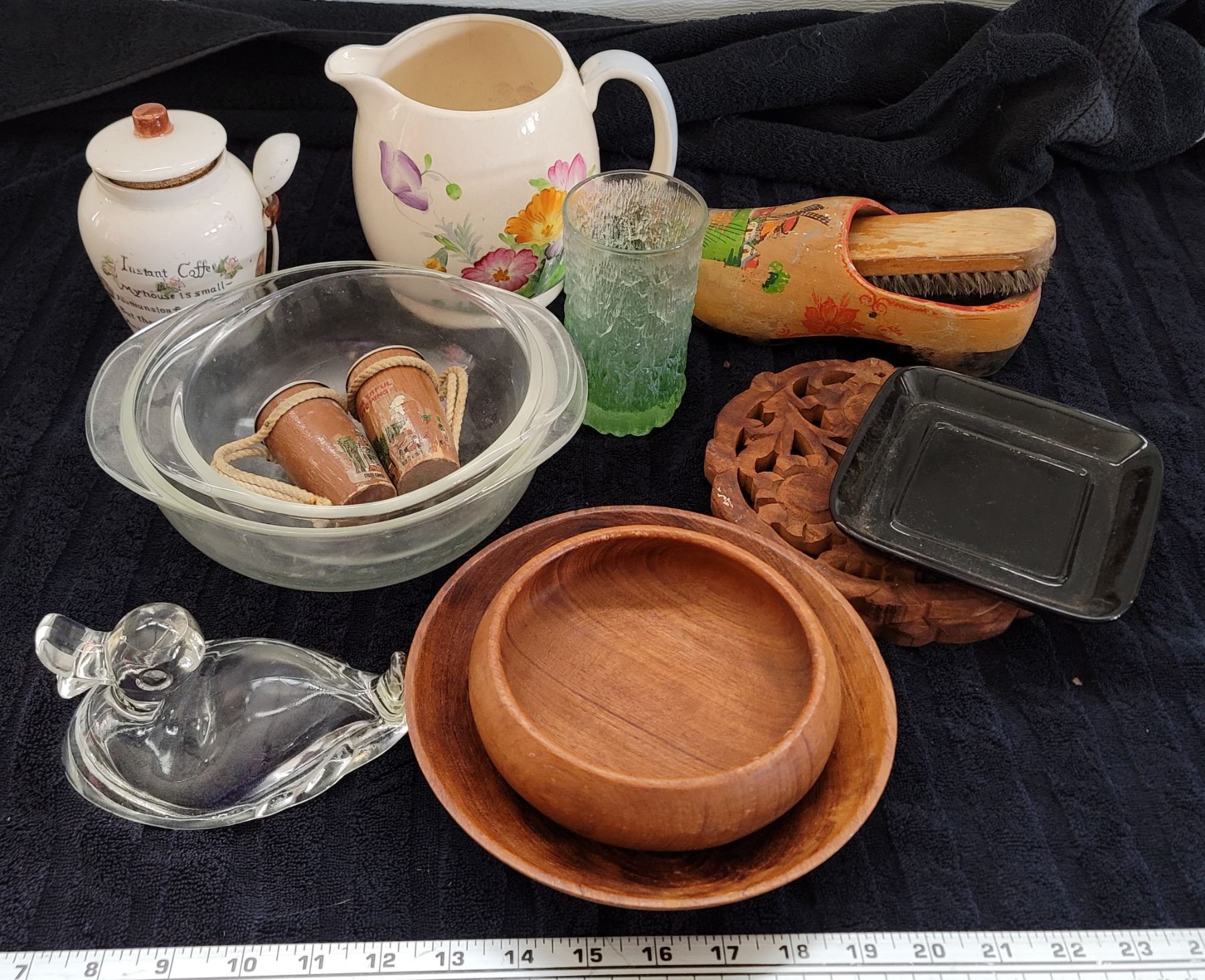 2 pyrex, Japan pitcher, wooden trivets & misc. items