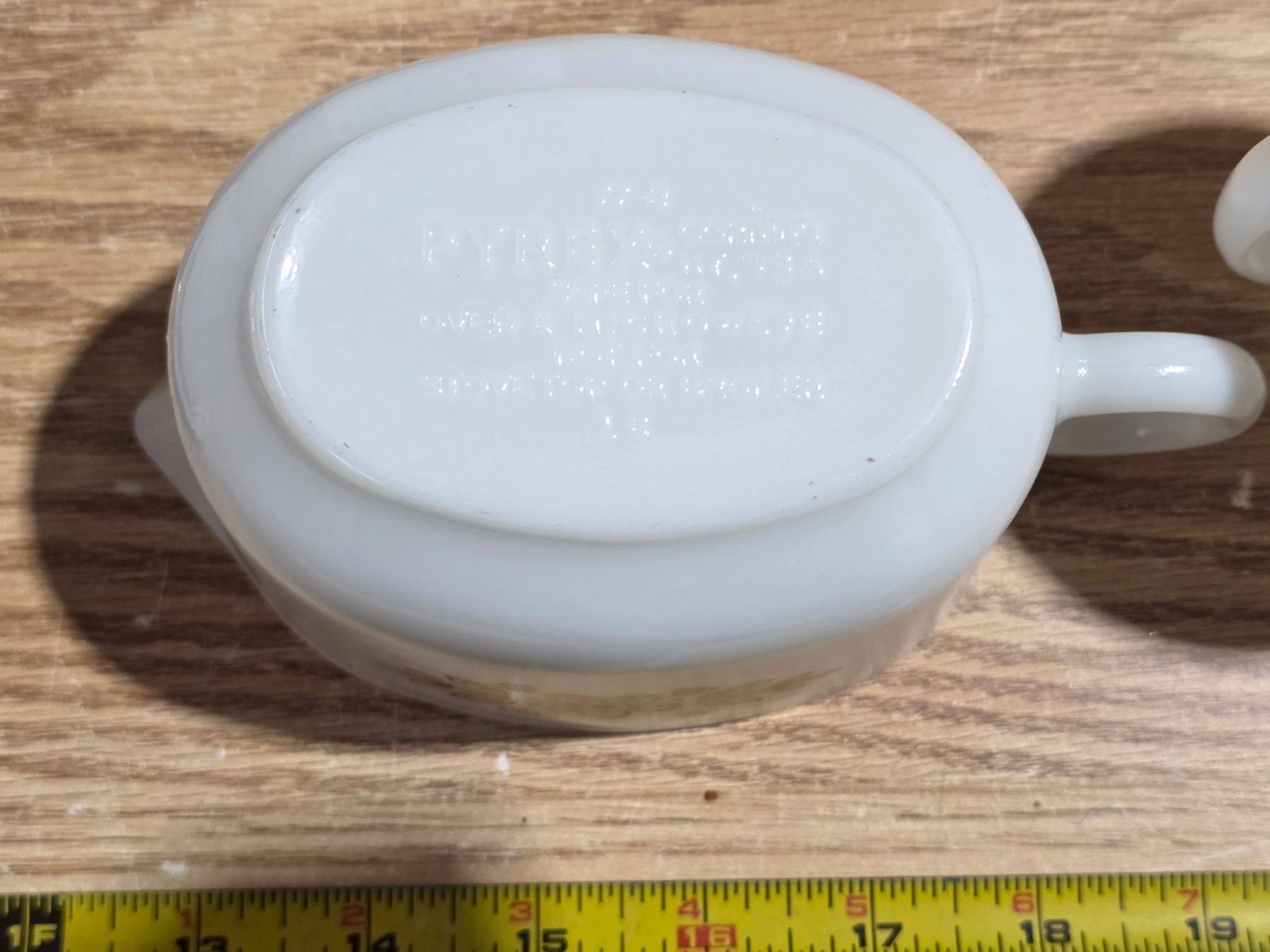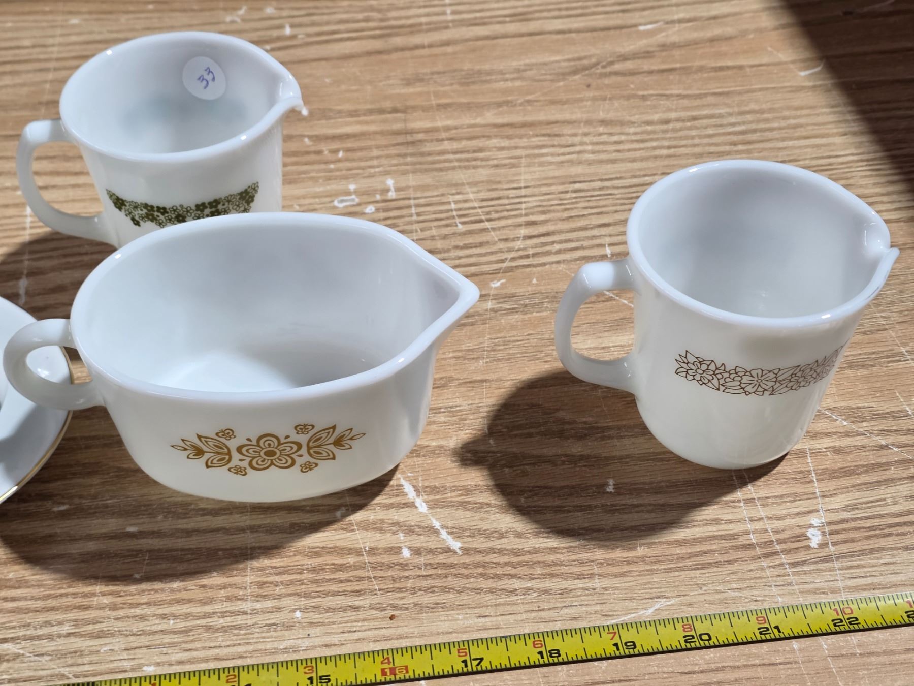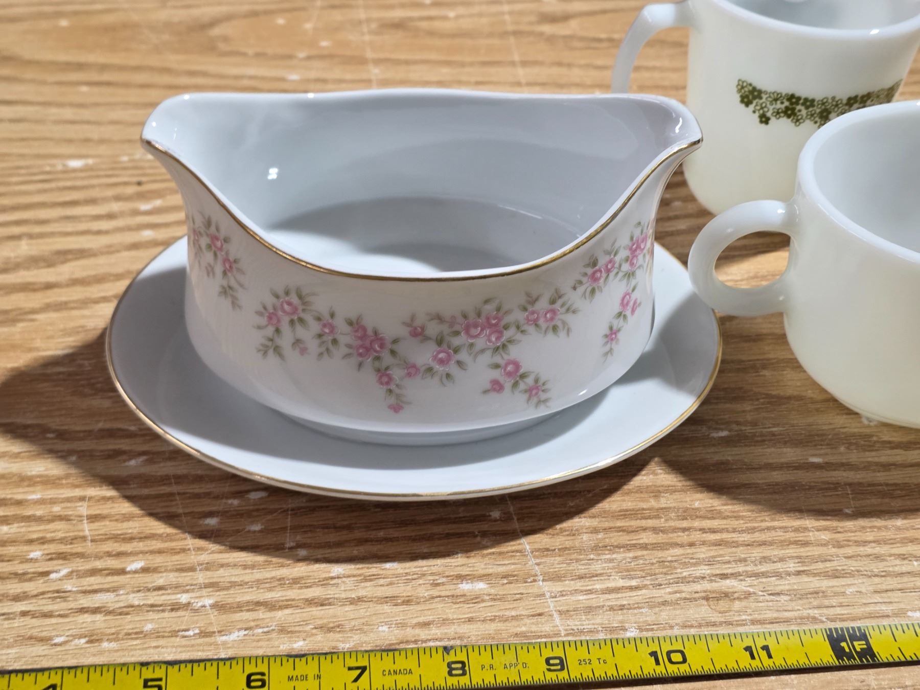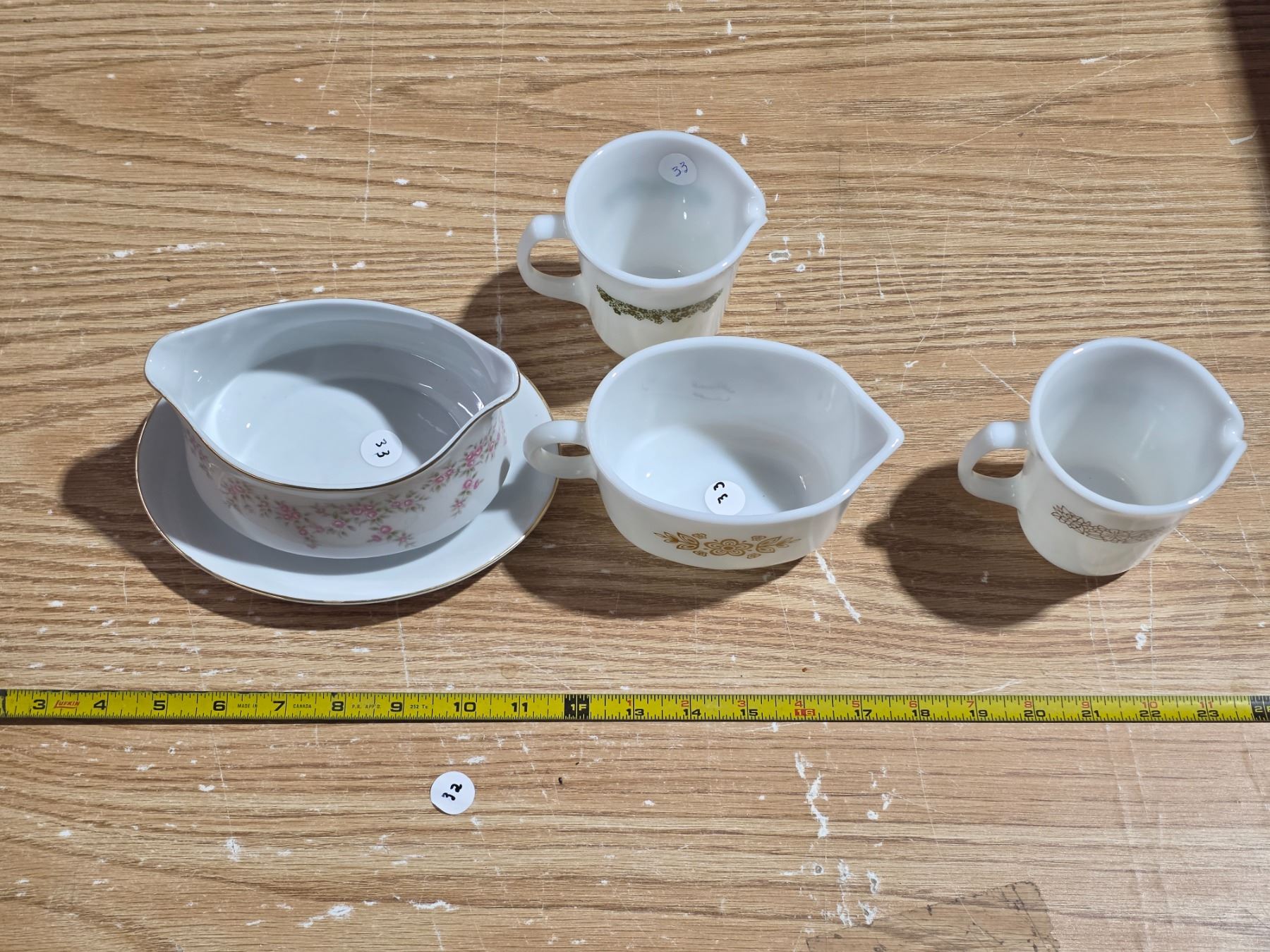 2 pyrex creamers, pyrex gravy boat and 1 premiere fine china gravy boat