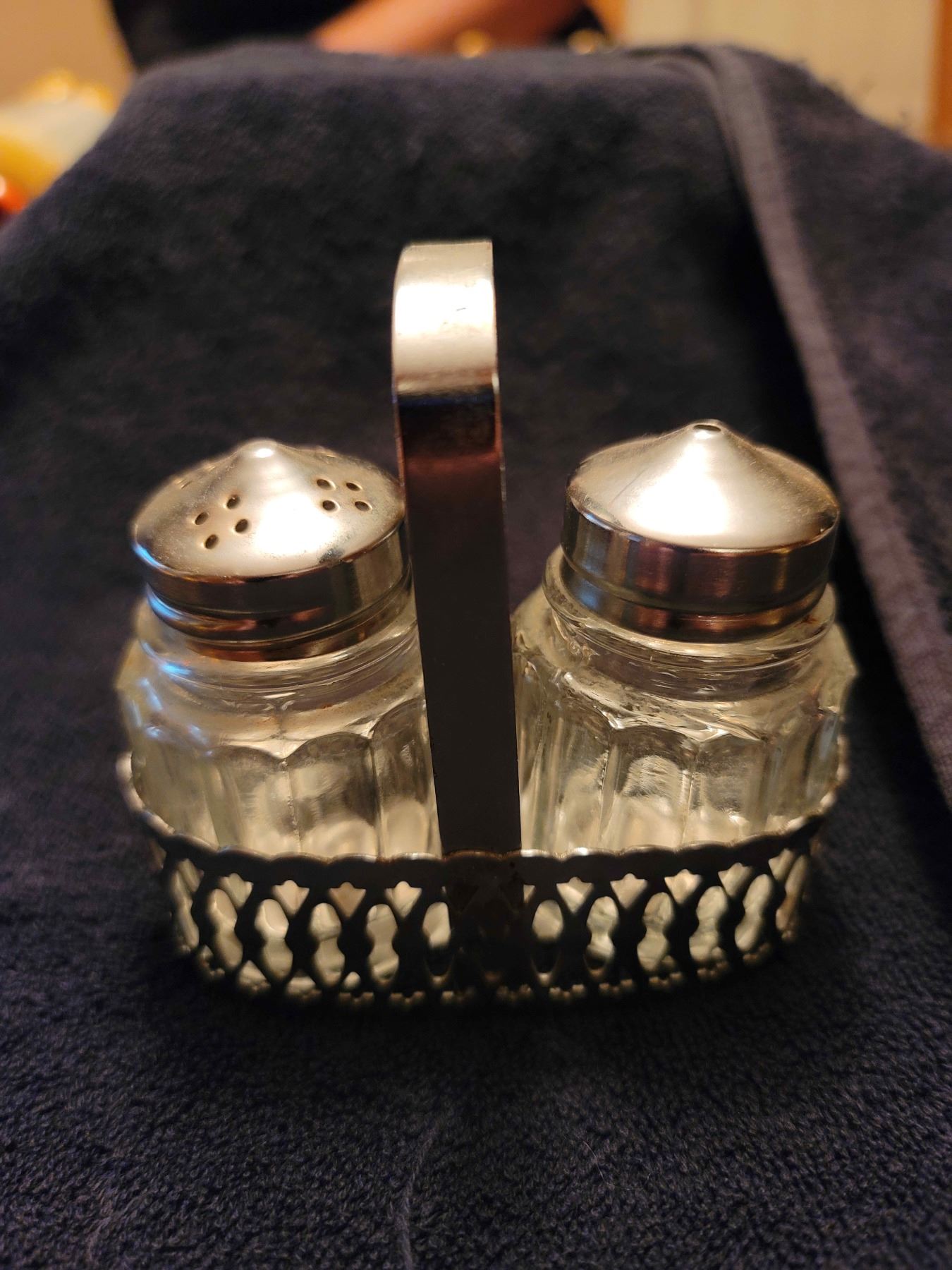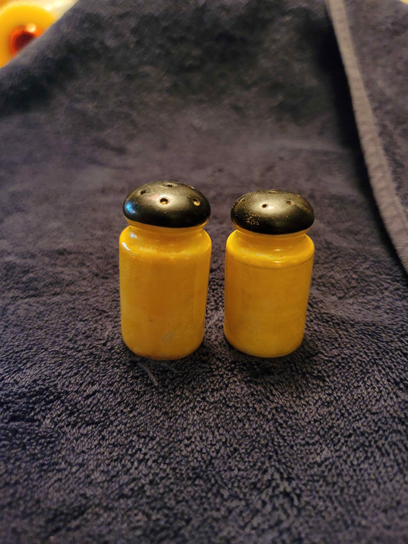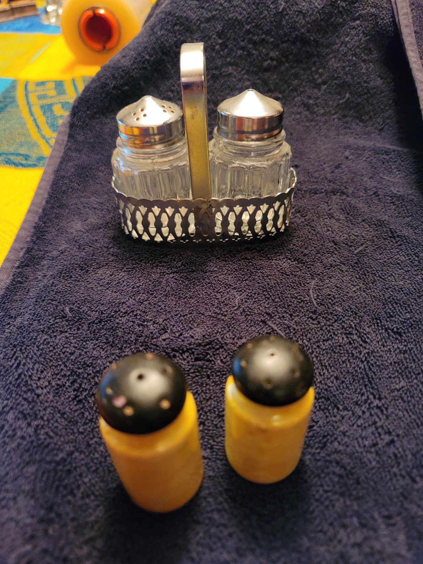 2 sets vintage salt and pepper shakers milk cans and glass shakers in basket