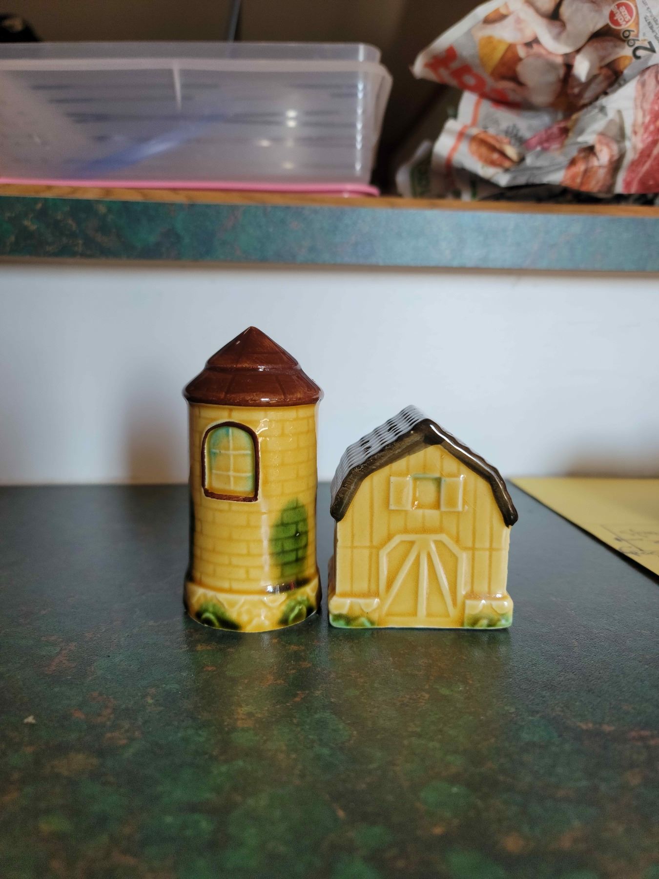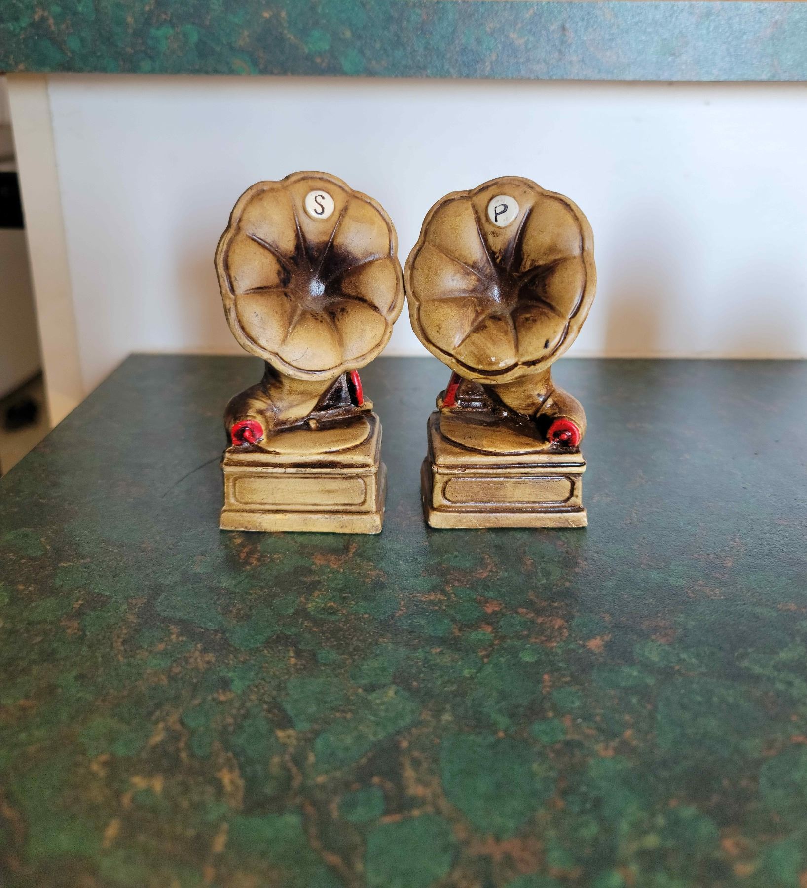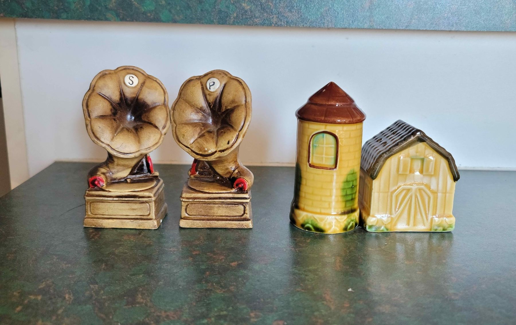 2 sets vintage salt and pepper shakers phonograph and barn/silo