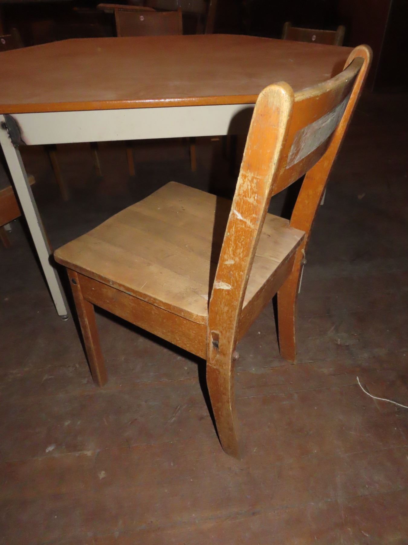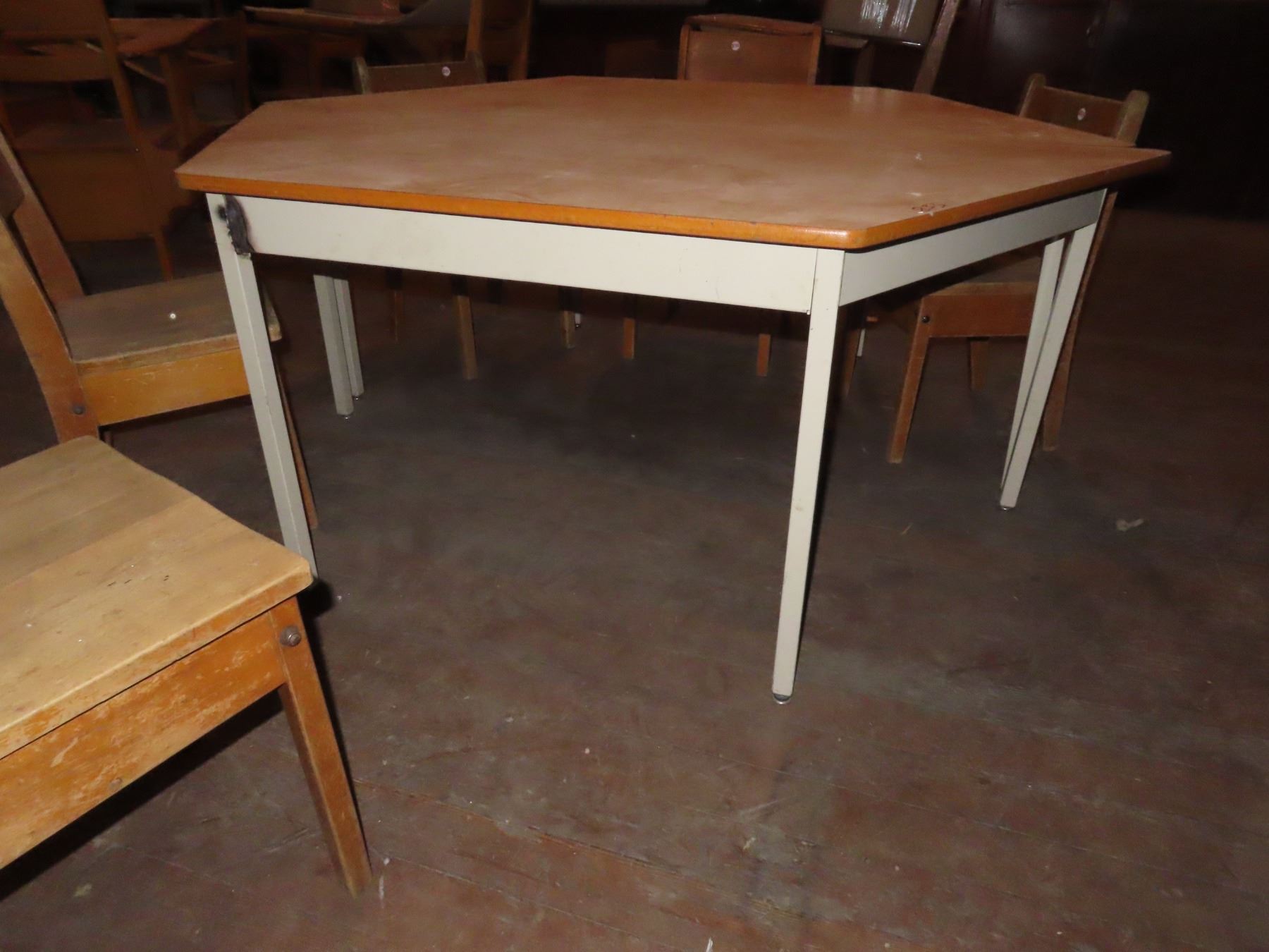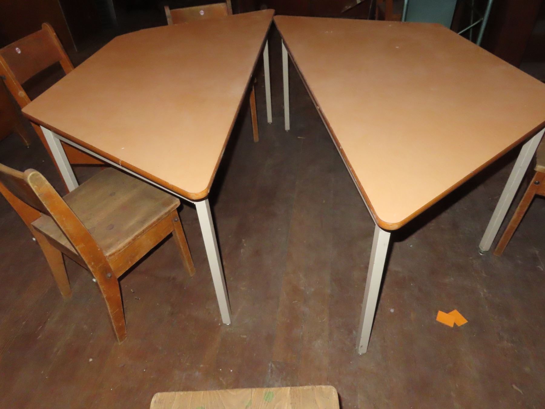 2 tables (wooden top, metal bottom, size: 58.25"L x 25.5"W x 23.5"H) and 5 wooden chairs
