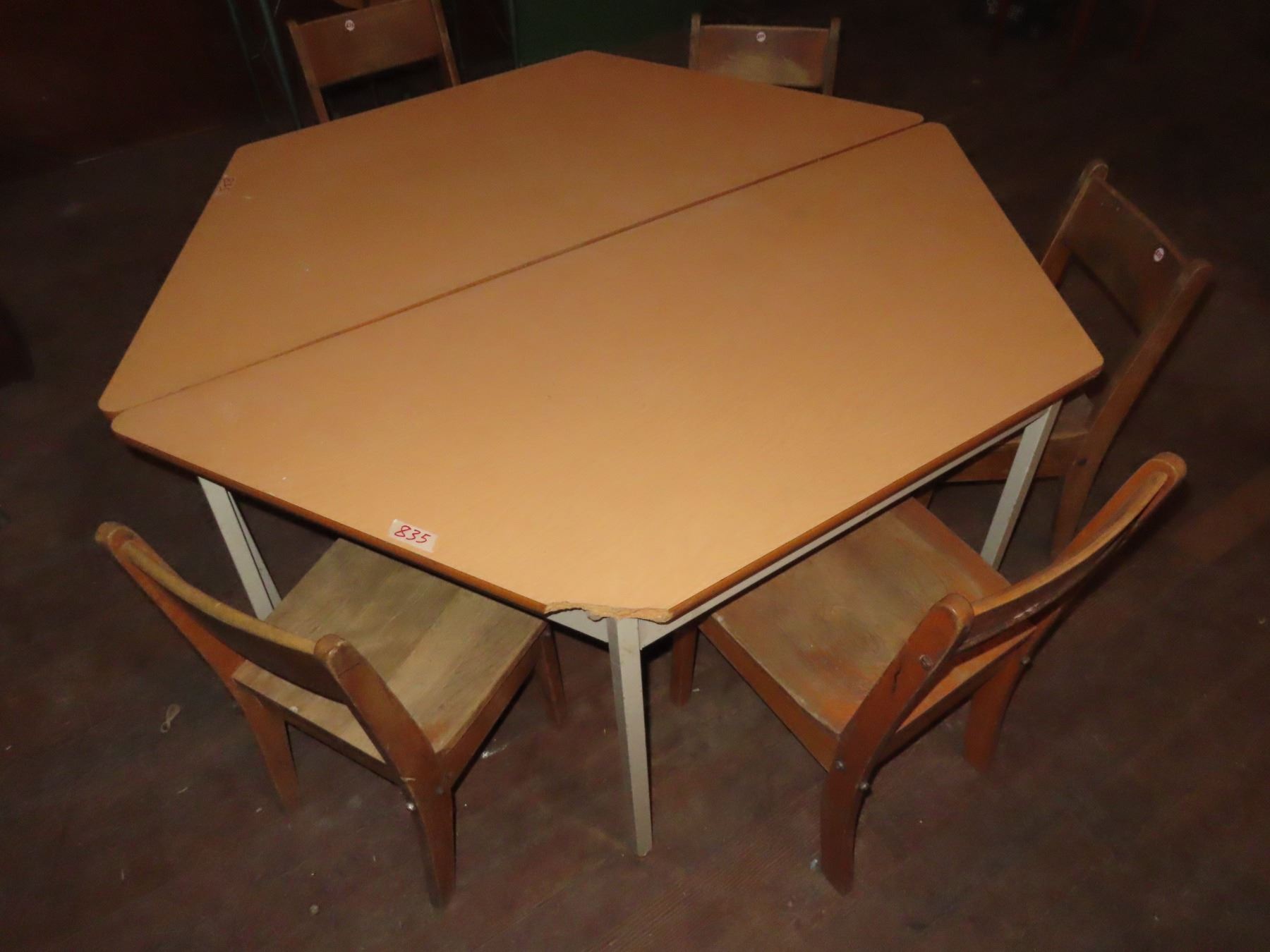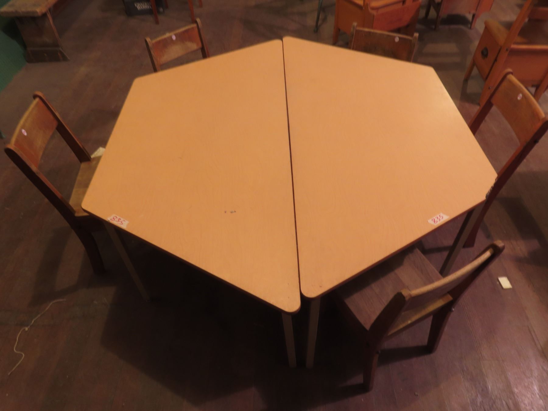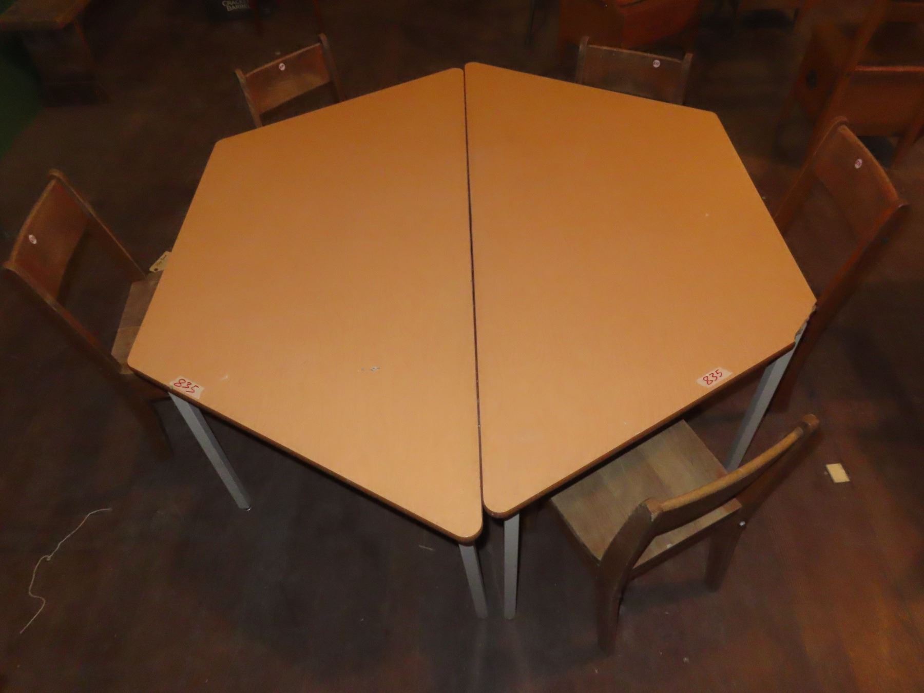 2 tables (wooden top, metal bottom, size: 58.25"L x 25.5"W x 23.5"H) and 5 wooden chairs