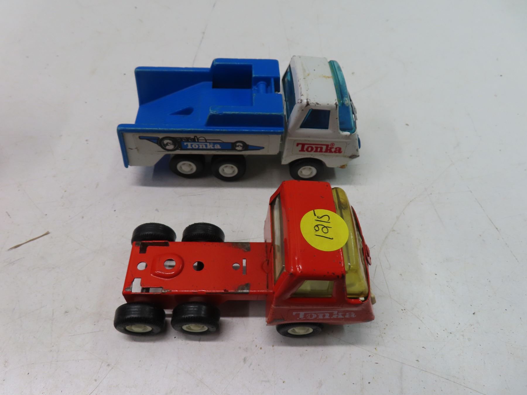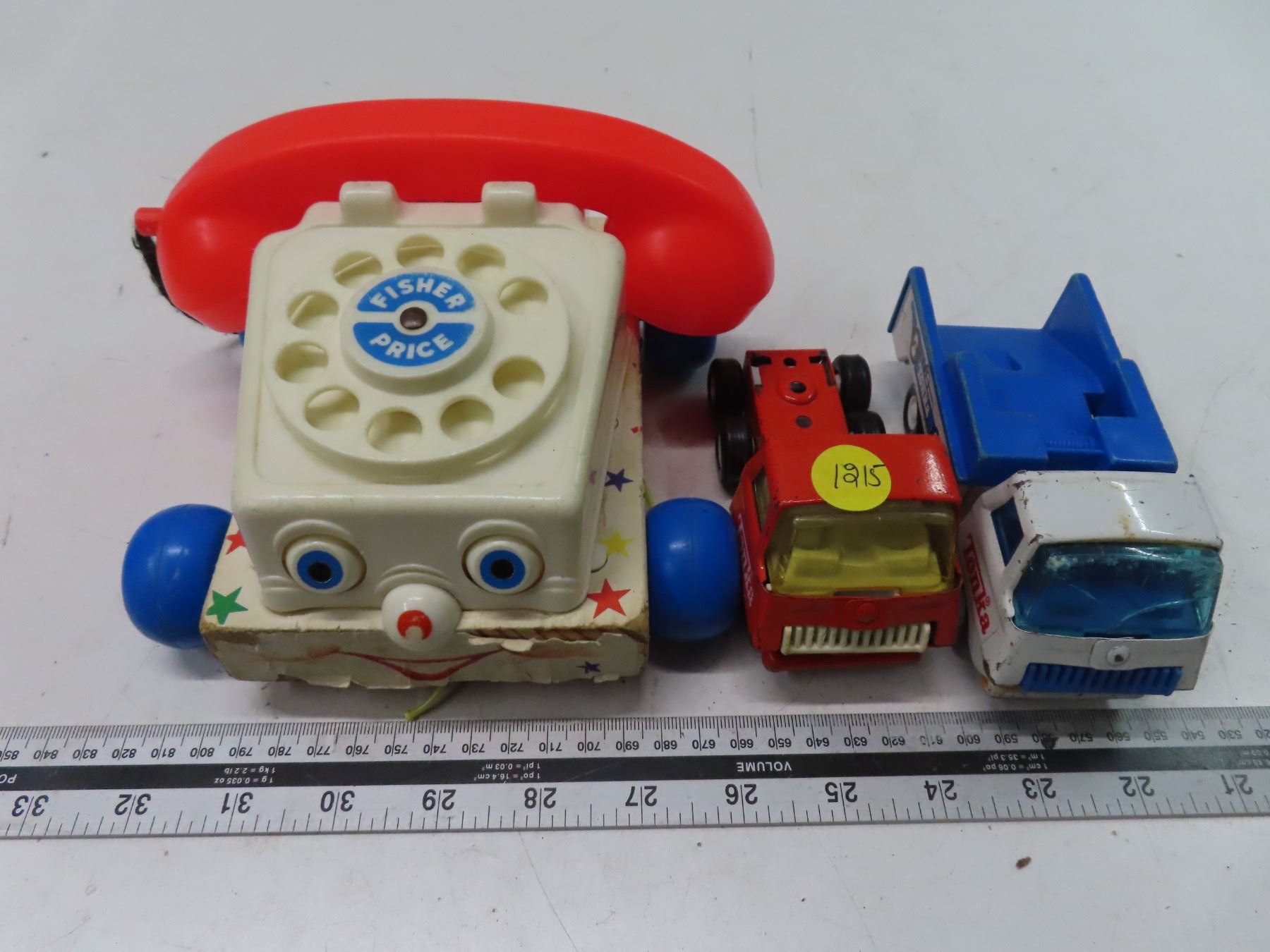 2 tonka trucks and 1 fisher price toy phone