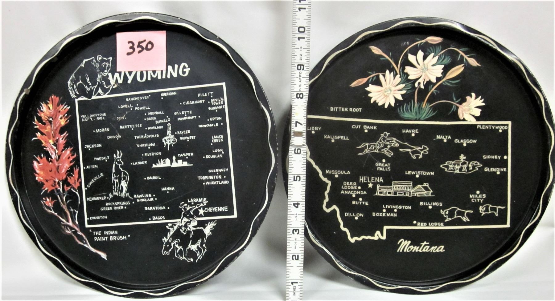 2 vintage 11" round metal souvenir serving platter tray decorative + WYOMINE + MONTANA
